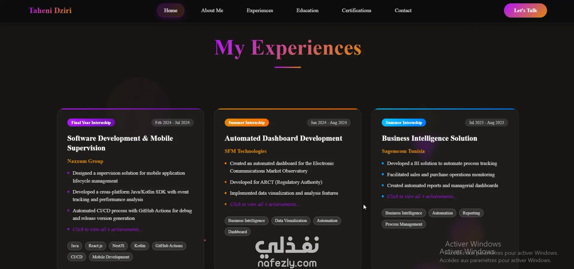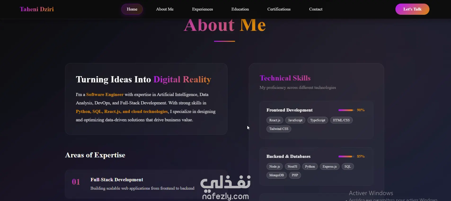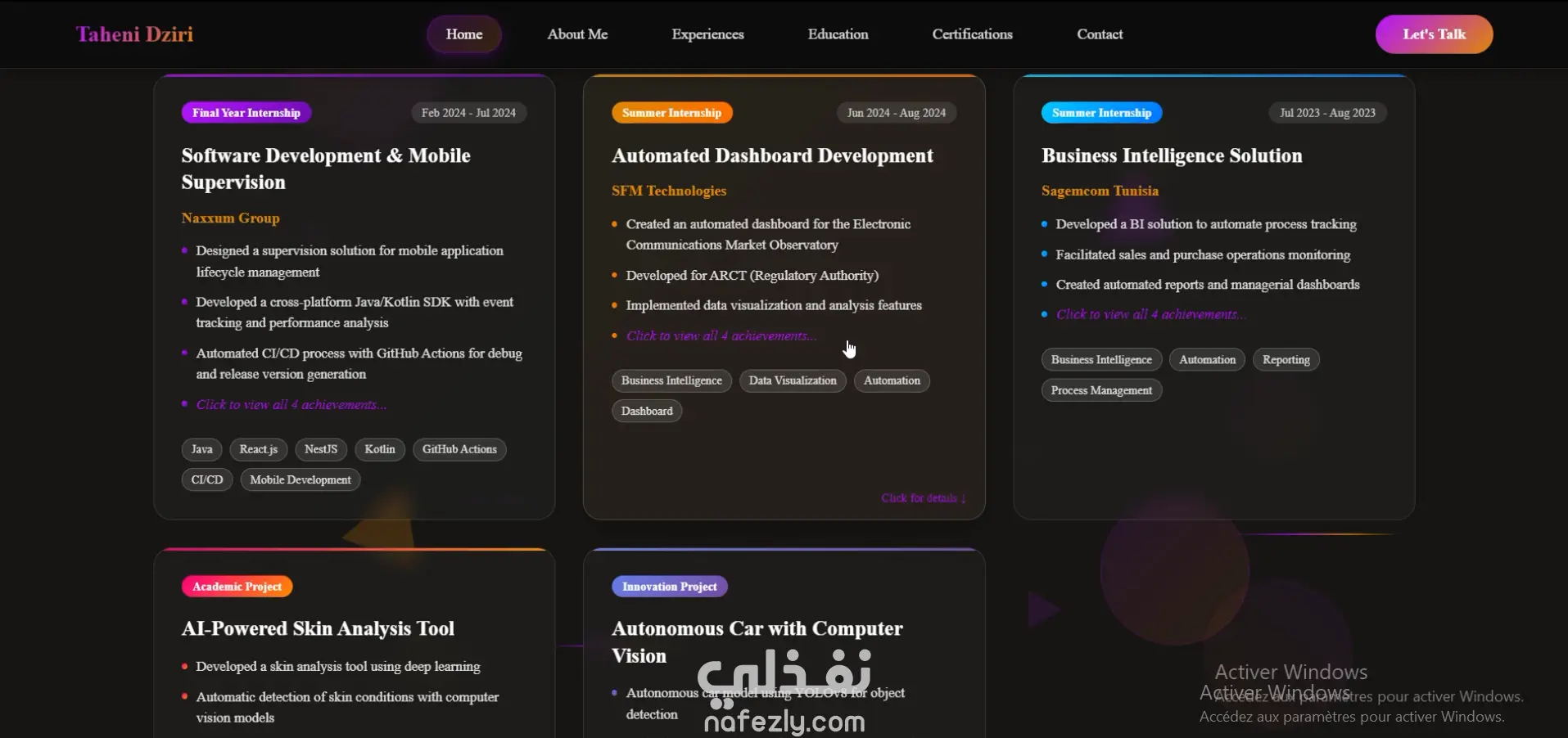 يحتوي الموقع على أقسام مثل: نبذة عني، المهارات التقنية، المشاريع، الشهادات، والخبرة المهنية، بالإضافة إلى إمكانية تحميل السيرة الذاتية والتواصل معي.
