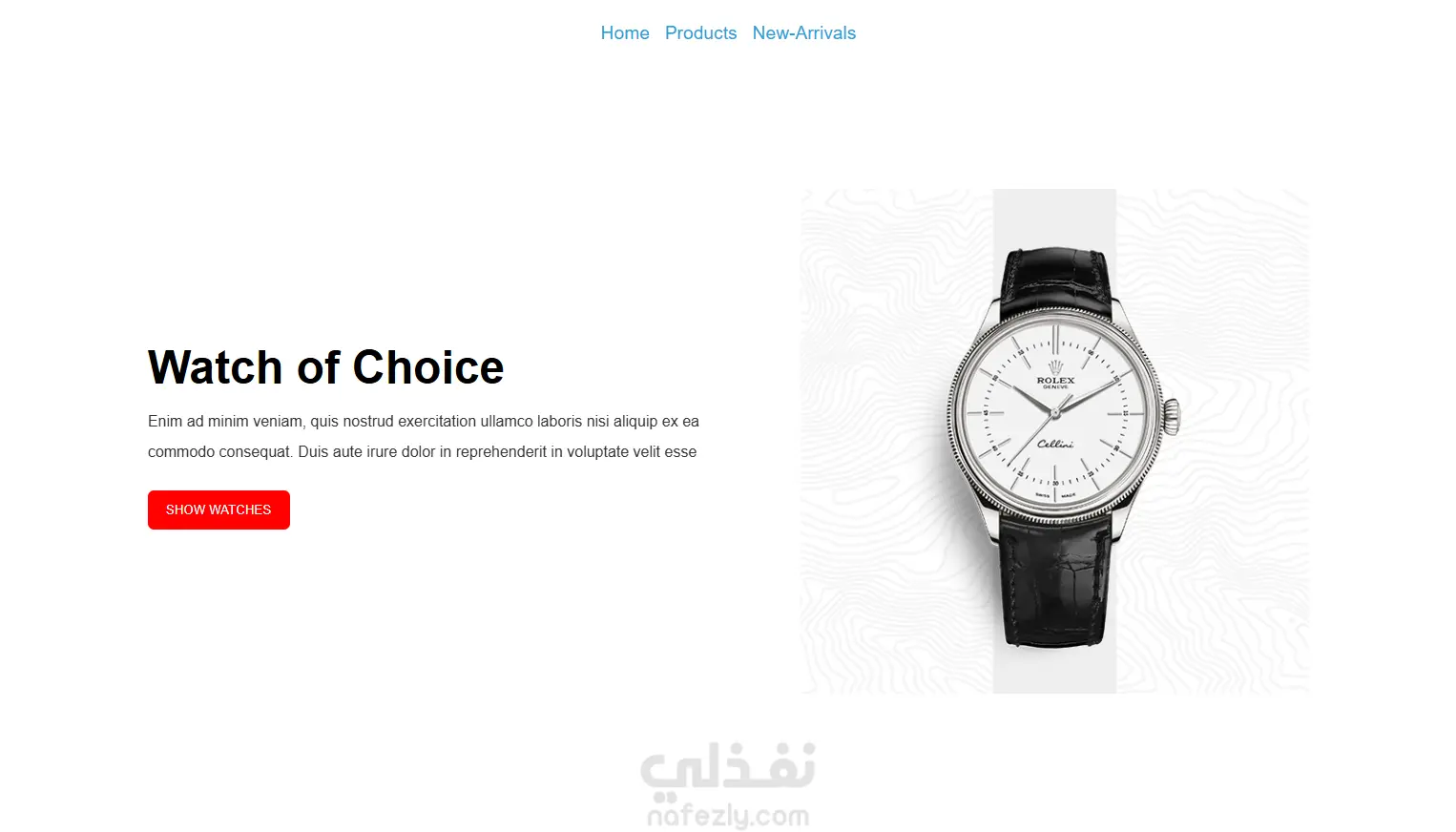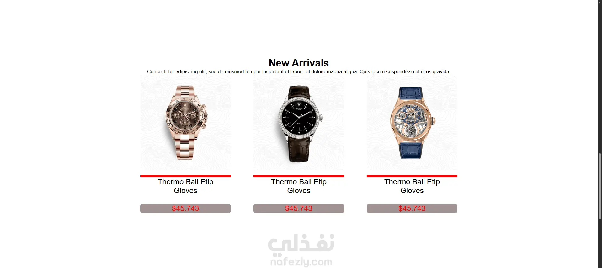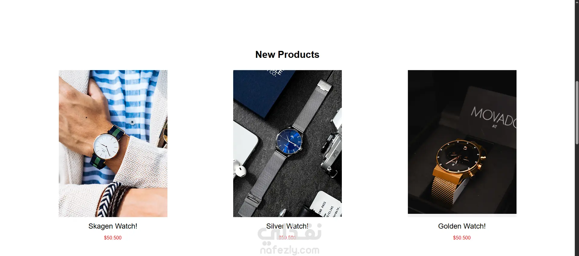 تفاصيل صفحة هبوط محل الساعات: عرض المنتجات الجديدة بشكل بارز: صور واضحة، أسماء المنتجات، والأسعار المميزة. مثلاً: Skagen Watch، Silver Watch، Golden Watch. Watches Landing قسم “New Arrivals” – يعرض منتجات ربما تكون مختلفة أو تشكيلة جديدة مع زر “Add To Cart” لتشجيع التفاعل والشراء السريع. Watches Landing معرض صور (Gallery) لعرض مزيد من الصور أو لقطات متميزة للمنتجات لإبهار الزائر. Watches Landing تصميم بسيط وسهل الاستخدام.