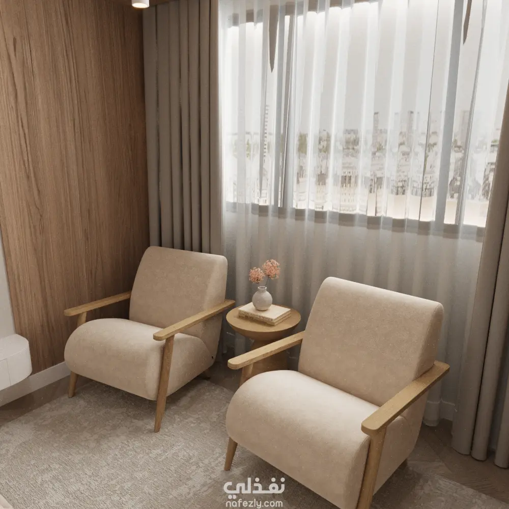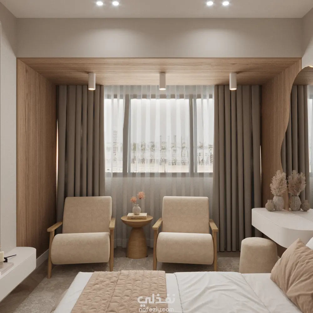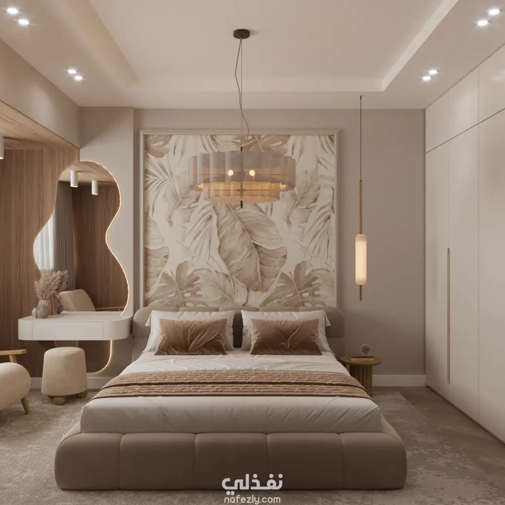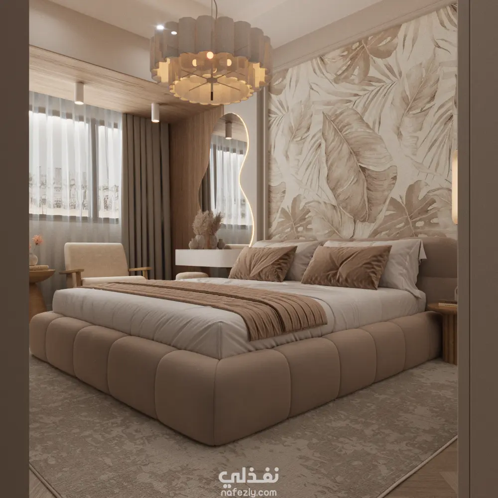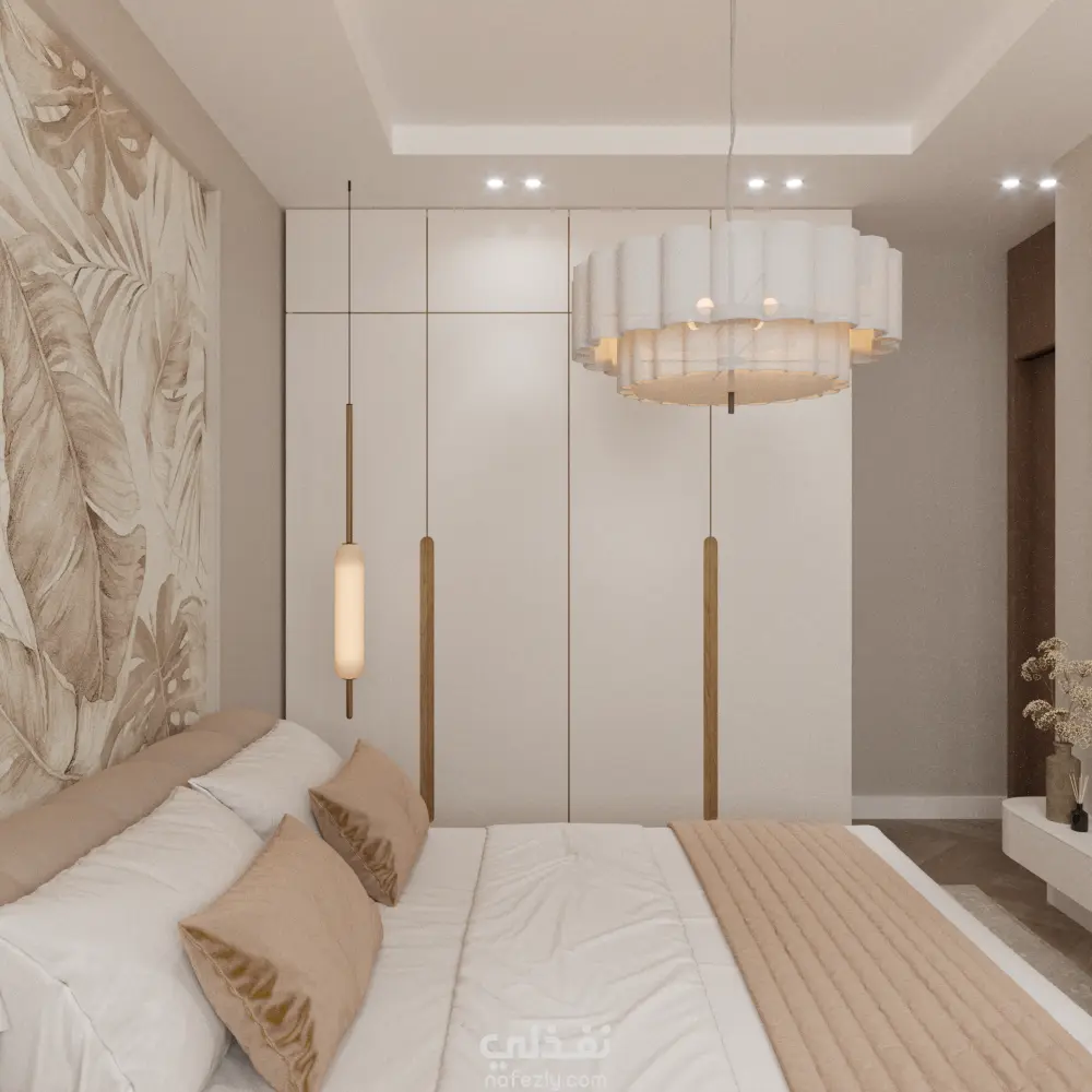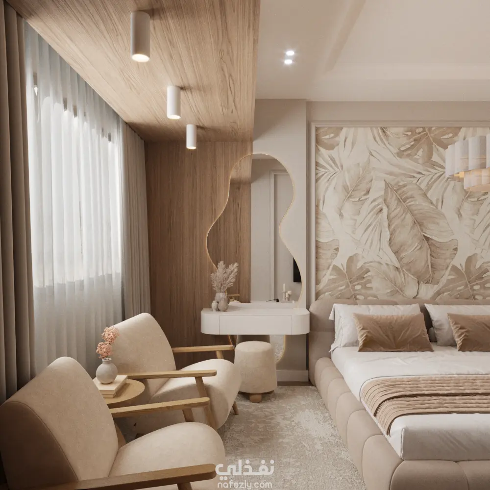 تصميم غرفة نوم عصرية وأنيقة بألوان دافئة وديكورات بسيطة تعكس روح الإسترخاء والهدوء مع توزيع الإضاءات الدافئة وتعدد مصادر الإضاءة لإتاحة التحكم فيها مع لمسة فنية فى توزيع الأثاث وإختيار الخامات المناسبة والديكور.