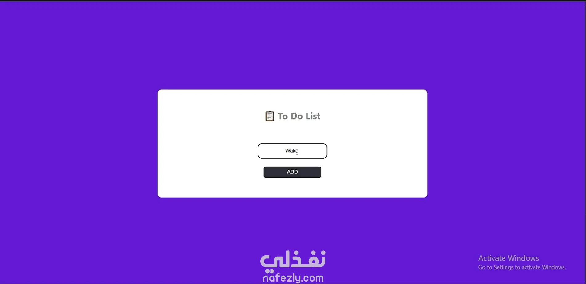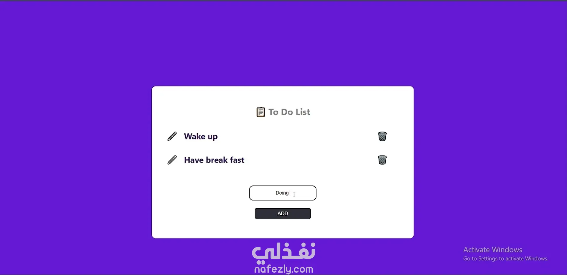 التطبيق المعروض هو تطبيق "To Do List" (قائمة المهام) بسيط وسهل الاستخدام. يتيح للمستخدم إضافة المهام اليومية مثل "الاستيقاظ" و"تناول الفطور" من خلال حقل النص "Doing" والضغط على زر "ADD". يحتوي التطبيق على خيار لمسح المهام باستخدام أيقونة سلة المهملات بجانب كل مهمة. الواجهة بسيطة مع خلفية أرجوانية وتصميم أبيض يحتوي على قائمة المهام، مما يجعله عمليًا لإدارة المهام اليومية بكفاءة.