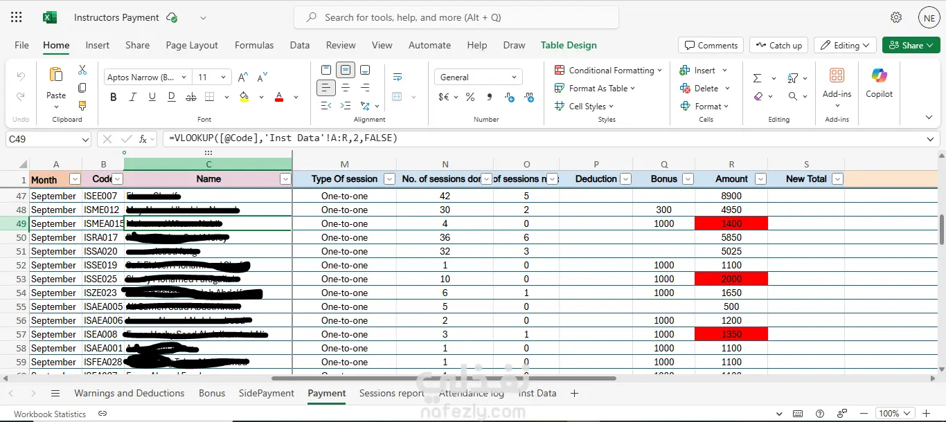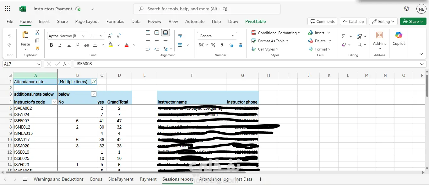 صممت برنامج Excel لحساب مرتبات المحاضرين تلقائيًا: البيانات بتجي من Microsoft Form بتسجل حضور الطلبة لكل محاضرة كل محاضرة (session) مرتبطة بمبلغ محدد بناءا علي درجه المعلم باستخدام كود المعلم نقدر نسترجع عدد السيشنز والمبلغ المستحق لكل محاضر البرنامج بيحسب أي خصومات أو بونص تلقائيًا الناتج: ملف مرتب وجاهز للصرف، يقلل وقت الحساب اليدوي ويقلل الأخطاء المخرجات: ملف Excel شامل: جداول، فورمولا، ملخص رواتب لكل محاضر إمكانية تحديث البيانات شهريًا بسهولة تقرير جاهز للطباعة أو للإرسال للإدارة الأدوات: Excel (فورمولا، دوال، فلترة، تنسيق شرطي، جداول)