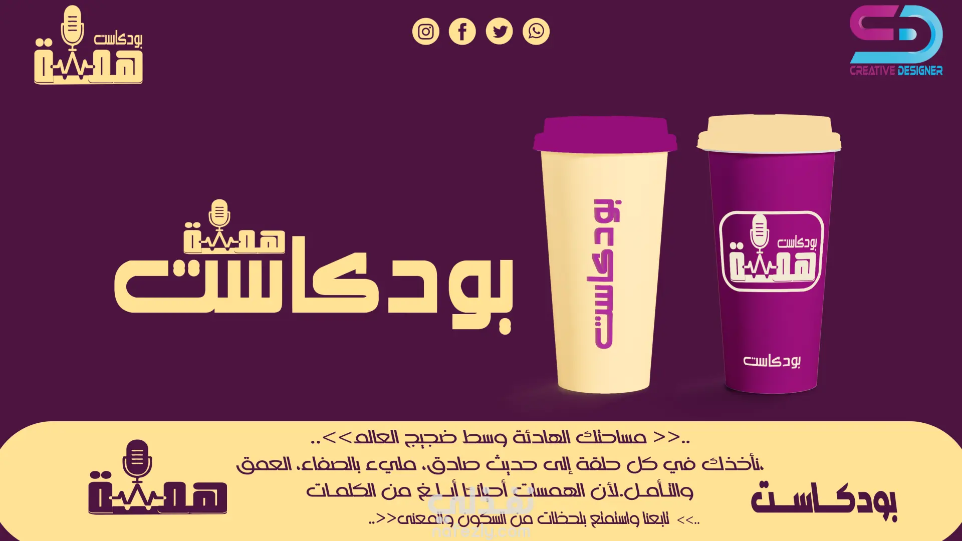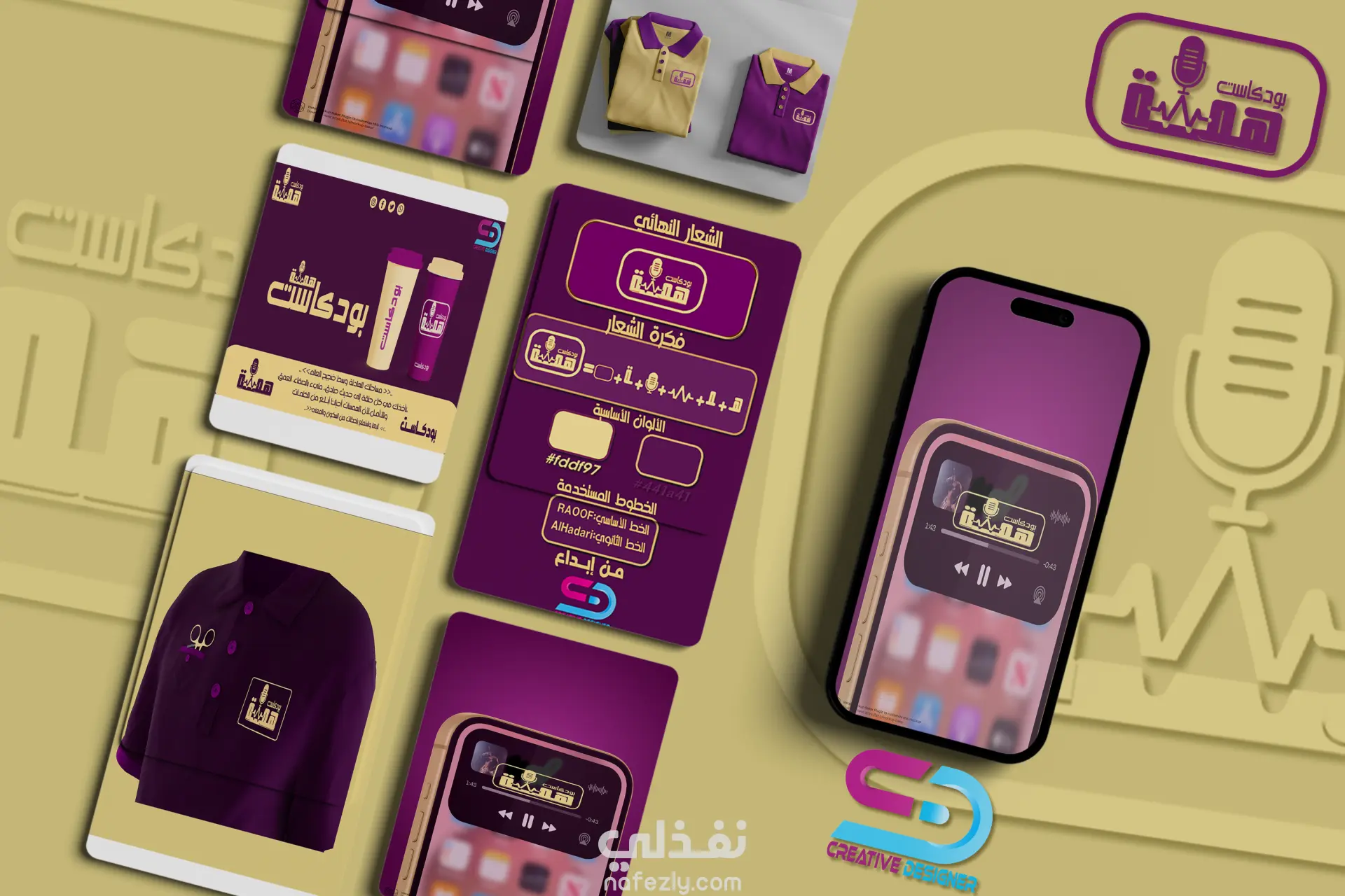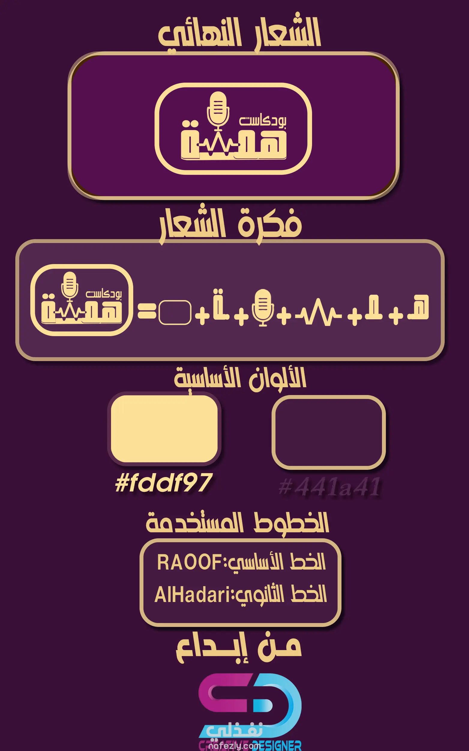 استخدام اللونين الذهبي الهادئ (#fddf97) والأرجواني الداكن (#441a41) يعكس الفخامة والتميز والدفء الصوتي، مما يجعل الشعار متناسقًا بصريًا ومناسبًا لمشروعات الإعلام الرقمي والبودكاستات الراقية.