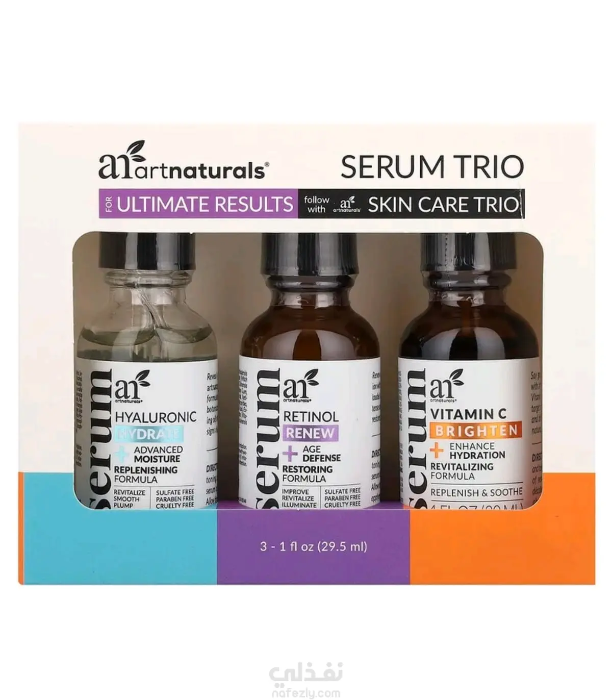 تحارب علامات تقدم سن البشرة 👵 .. التجاعيد .. الخطوط_الدقيقة .. الهالات تحت العين 👀 .. التصبغات الناتجة عن الشمس ☀ او آثار الحبوب .. يوفر النضارة والاشراق لبشرتك والتفتيح الملحوظ ✔ ✔ ✔ ... مجموعة ثلاثية لتجديد البشرة كلياً من ترطيب ✅ .. تفتيح ✅ .. وعلاج تقدم سن البشرة بكج السيرومات الثلاثي من artnaturals الأمريكية