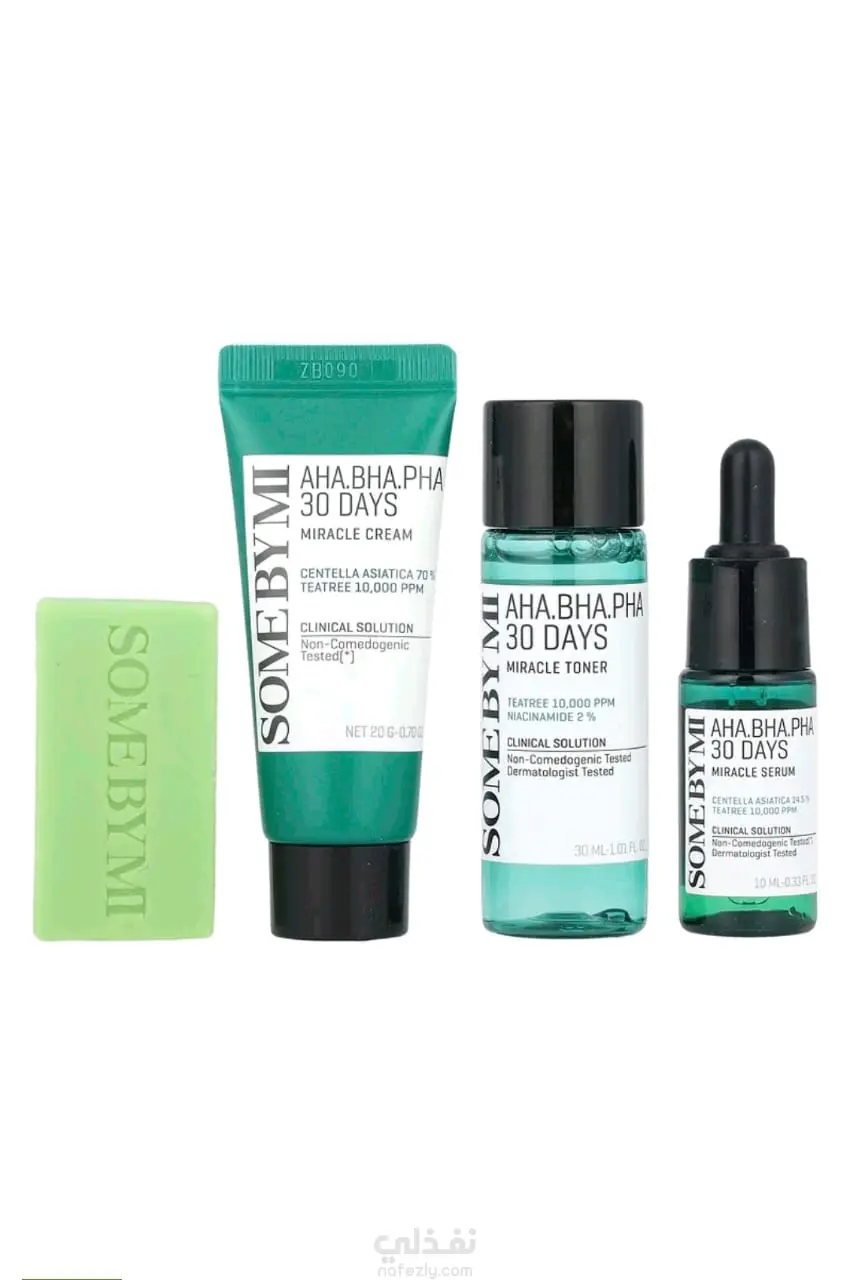 صابون 🧽 30 g + تونر 🧴30 ml + سيروم 10 ml + كريم 20 g) بأحجام تجريبية تشمل روتين علاجي (تقشير + ترطيب + تقتيح) لنقل البشرة إلى أفضل حالة ممكنة