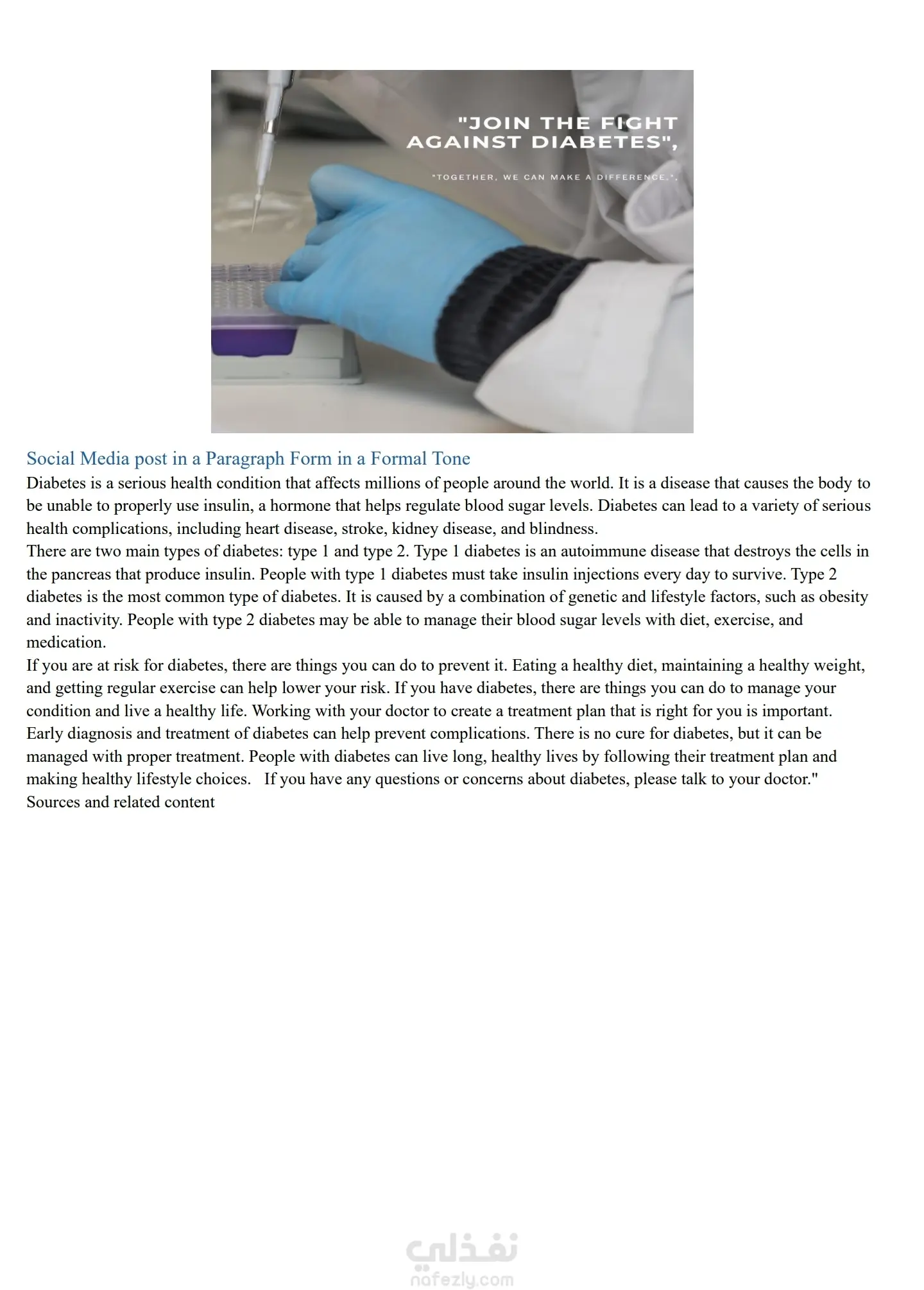 تصميم منشور توعوي لوسائل التواصل الاجتماعي بعنوان "Join the Fight Against Diabetes". يهدف البوست إلى نشر الوعي حول مرض السكري وأنواعه وأهمية التشخيص المبكر واتباع نمط حياة صحي للوقاية منه. تم استخدام نغمة رسمية ومحتوى علمي موثوق لتقديم المعلومة بشكل دقيق واحترافي يناسب المنصات الطبية أو الحملات التوعوية. الصورة المصاحبة تعكس الطابع الطبي والبحثي للموضوع، مما يعزز مصداقية المحتوى ويجذب اهتمام الجمهور. يجمع المنشور بين التصميم الهادئ والمحتوى التثقيفي لزيادة الوعي وتشجيع المتابعين على الاهتمام بصحتهم.