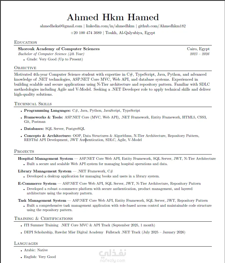 مميزات الخدمة: ✅ تحليل السيرة الذاتية الحالية ومعرفة نقاط الضعف. ✅ إعادة كتابة المحتوى باحترافية باستخدام كلمات مفتاحية مناسبة لمجالك. ✅ تنسيق احترافي باستخدام قوالب مقروءة لأنظمة ATS. ✅ تسليم بصيغ مختلفة (PDF DOCX). ✅ إمكانية تصميم نسخ إنجليزية أو عربية.