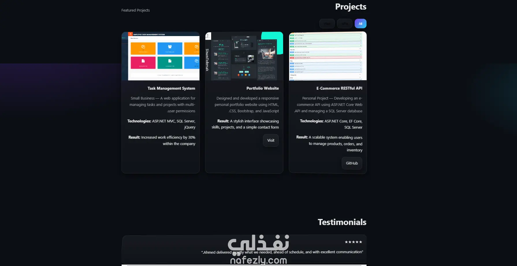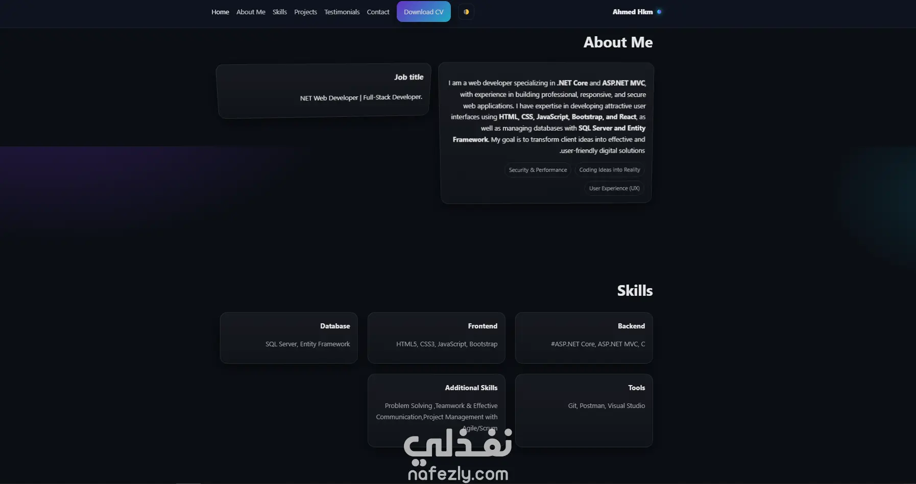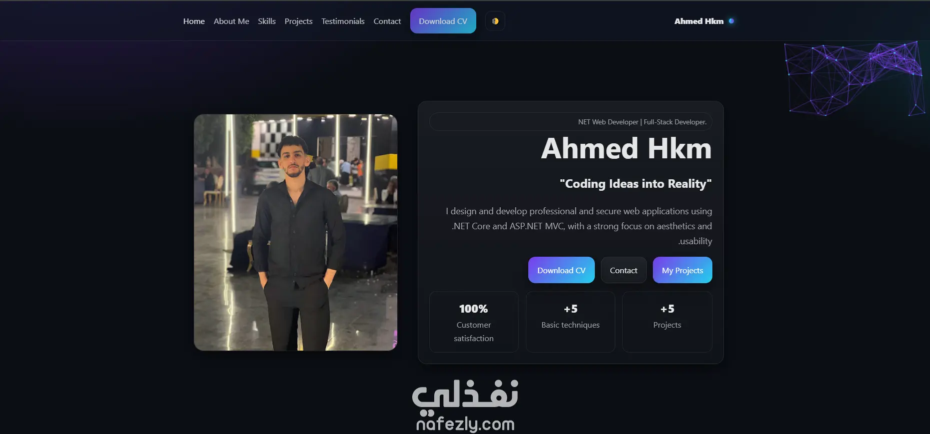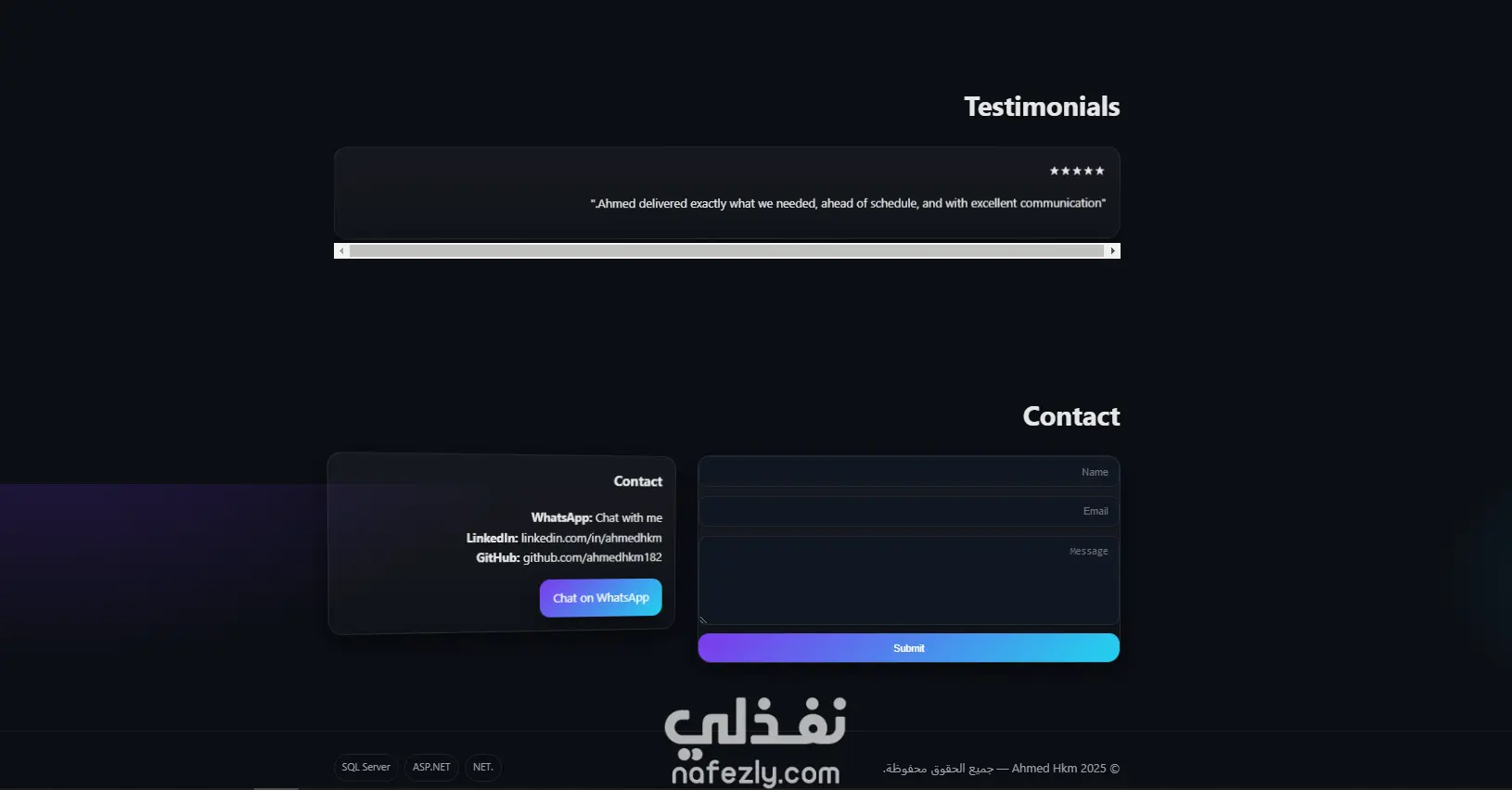 تتضمن نموذج تواصل فعّال يُرسل الرسائل إلى بريدك الإلكتروني (EmailJS أو SMTP).