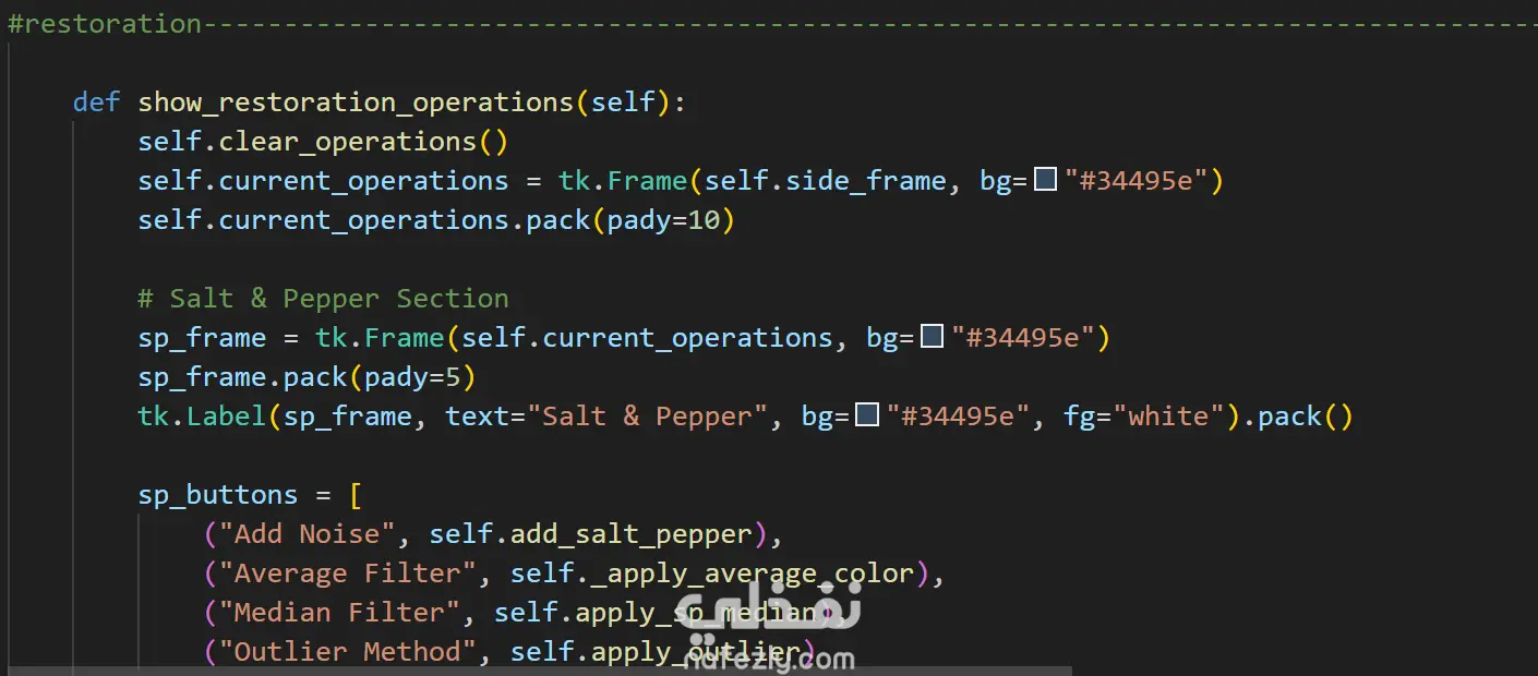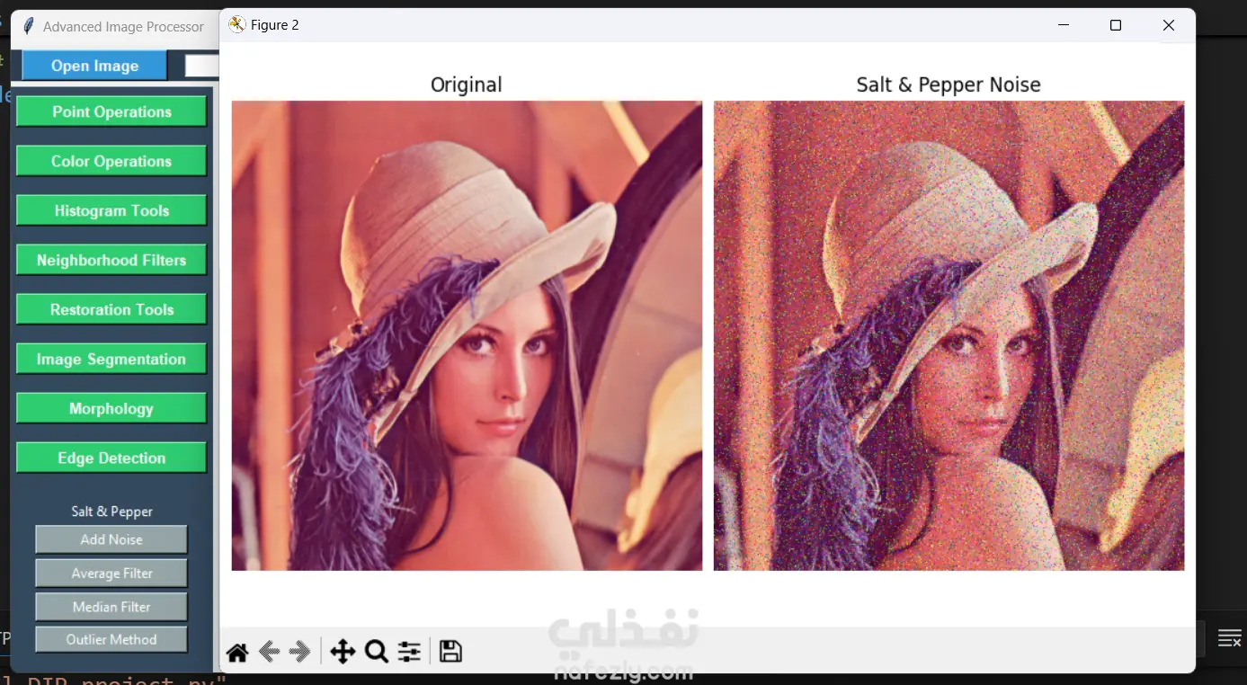 -استعادة الصور من الضوضاء (Image Restoration): معالجة صور مصابة بضوضاء "Salt and Pepper" باستخدام خوارزمية Median Filter لإزالة النقاط البيضاء والسوداء دون فقدان تفاصيل الصورة.