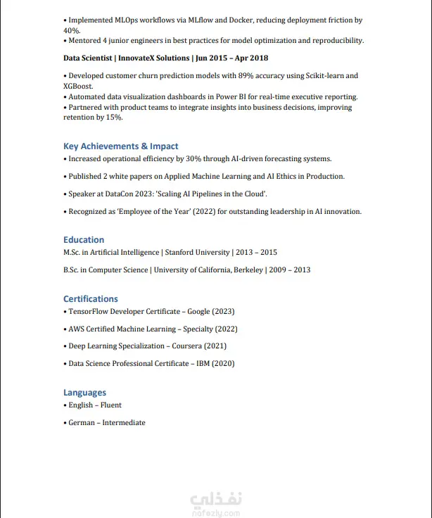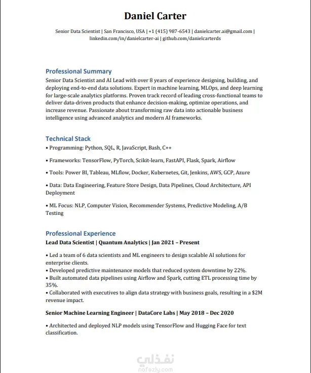 تصميم سيرة ذاتية احترافية متوافقة مع نظام ATS (نموذج: Daniel Carter – Senior Data Scientist)