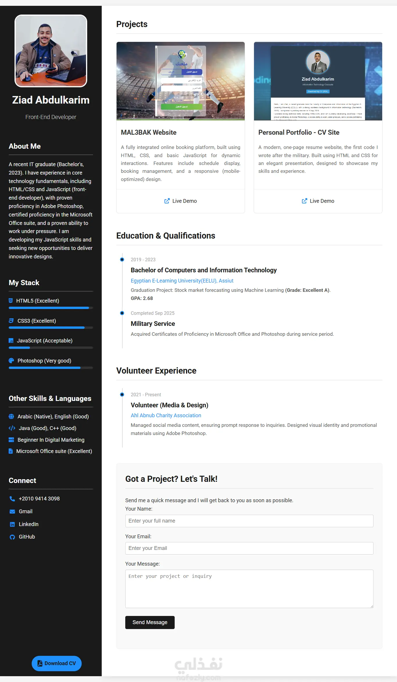 هذا المشروع هو دليل على التزامي بتقديم أعلى معايير الـ Front-End Development. لقد قمت بتطوير معرض أعمال شخصي متكامل، مُصمم ليخدم هدفين: سرعة الأداء الفائقة وجودة الكود القابلة للصيانة والتطوير. الإنجازات التقنية في هذا المشروع: - التقنيات الأساسية: HTML5، CSS3، وJavaScript (Native). - جودة الكود: تطبيق نظام CSS Variables لمرونة التعديل، وبناء الهيكل بـ Flexbox/Grid لتصميم متجاوب 100%. - تحسين الأداء: قمت بتحسين سرعة التحميل باستخدام أوامر Preconnect وتقنية التحميل الكسول (Lazy Loading) لضمان أفضل تجربة للمستخدم. - تحسين (UX): استخدام JavaScript لتقديم تفاعلات ديناميكية (مثل توحيد ارتفاع الكروت) وتحسين نظام رسائل الاتصال. النتيجة: موقع سريع، نظيف، ويعمل بكفاءة على جميع الأجهزة. إذا كان مشروعك يتطلب اهتماماً بالتفاصيل الدقيقة والالتزام بمعايير الويب الحديثة، فأنا جاهز للعمل.