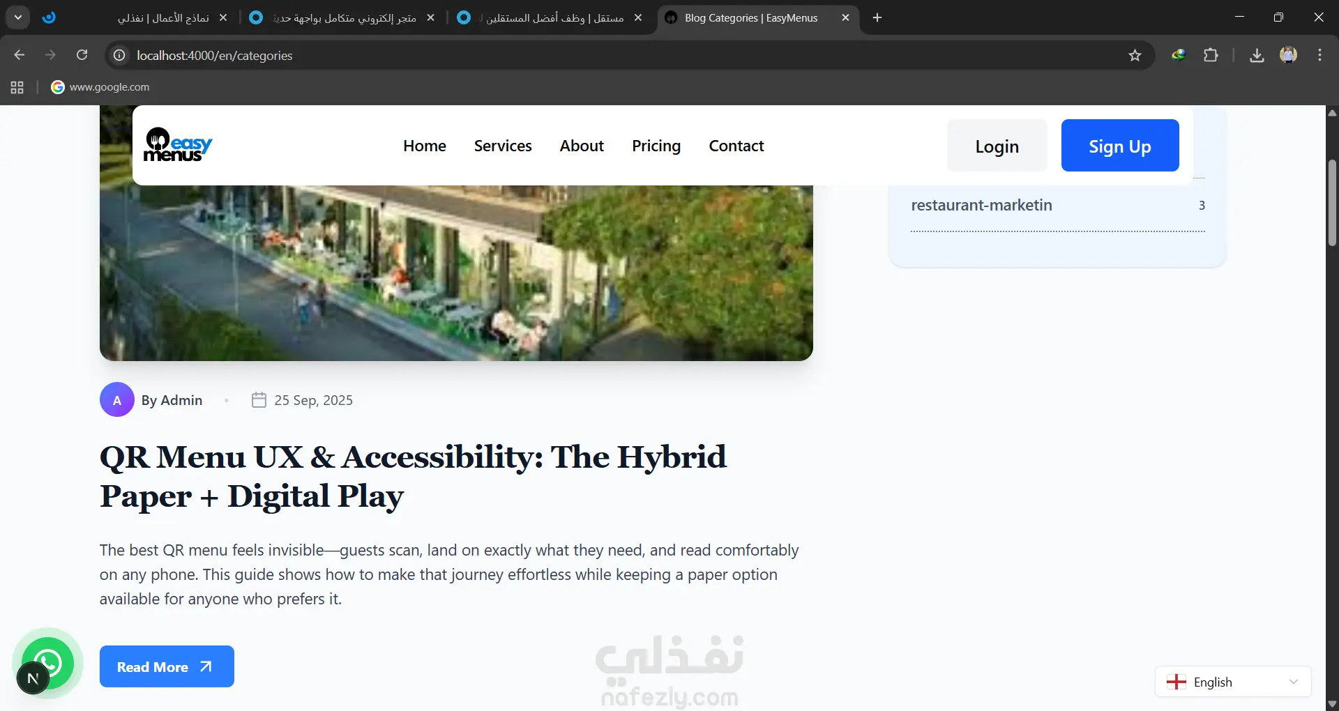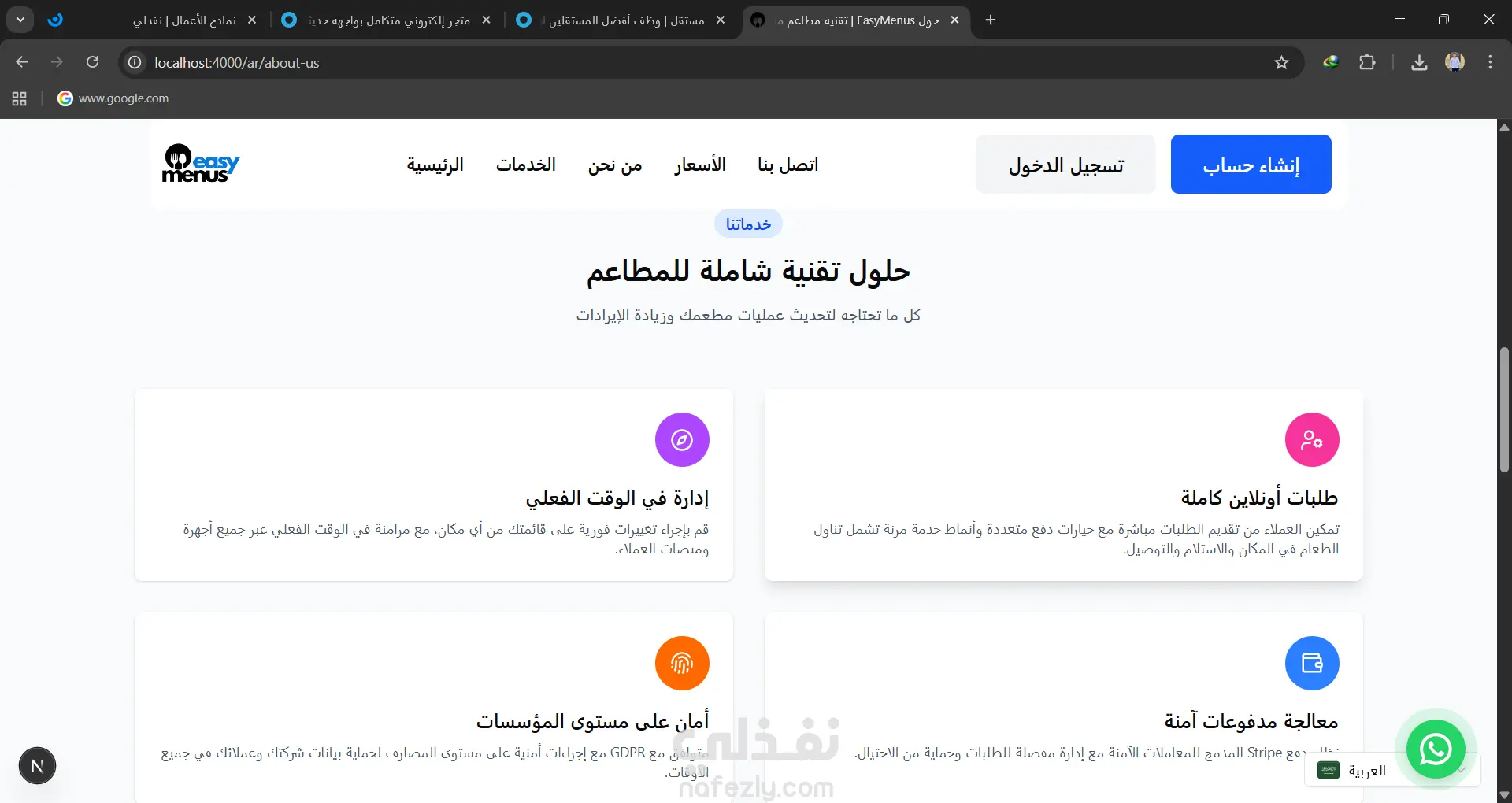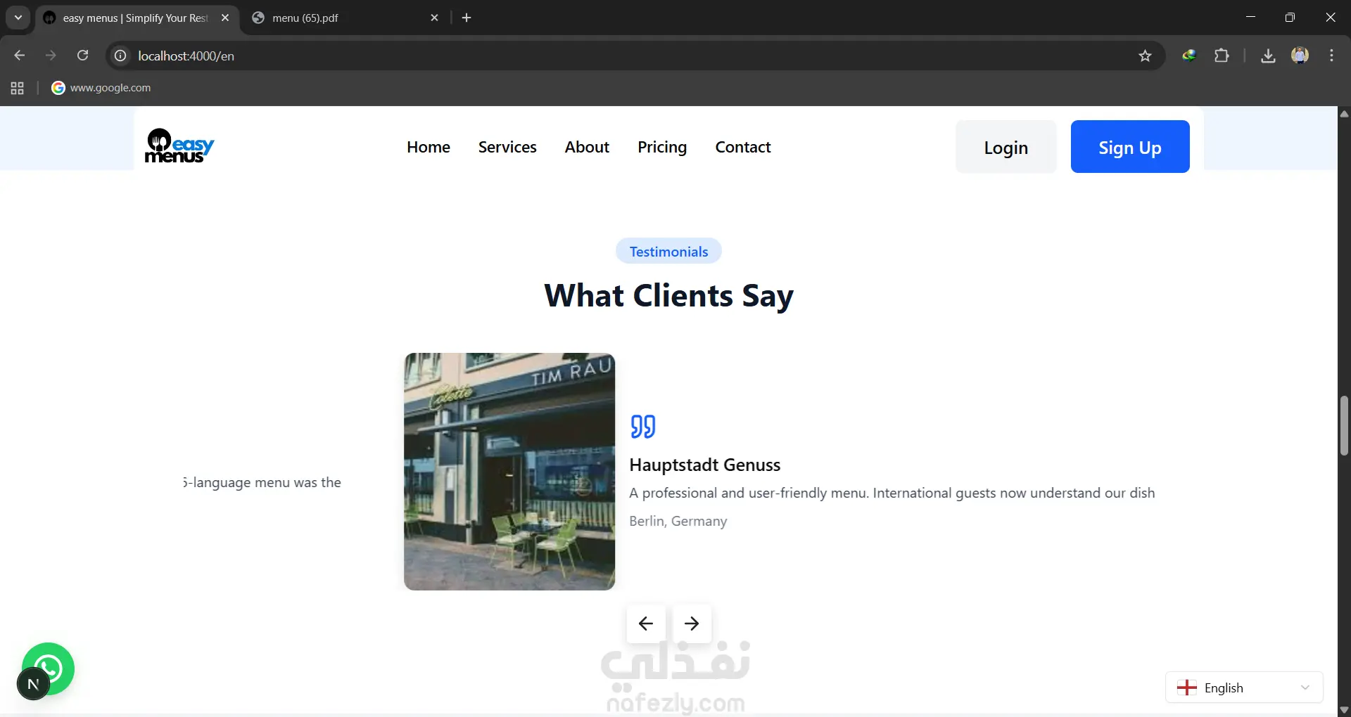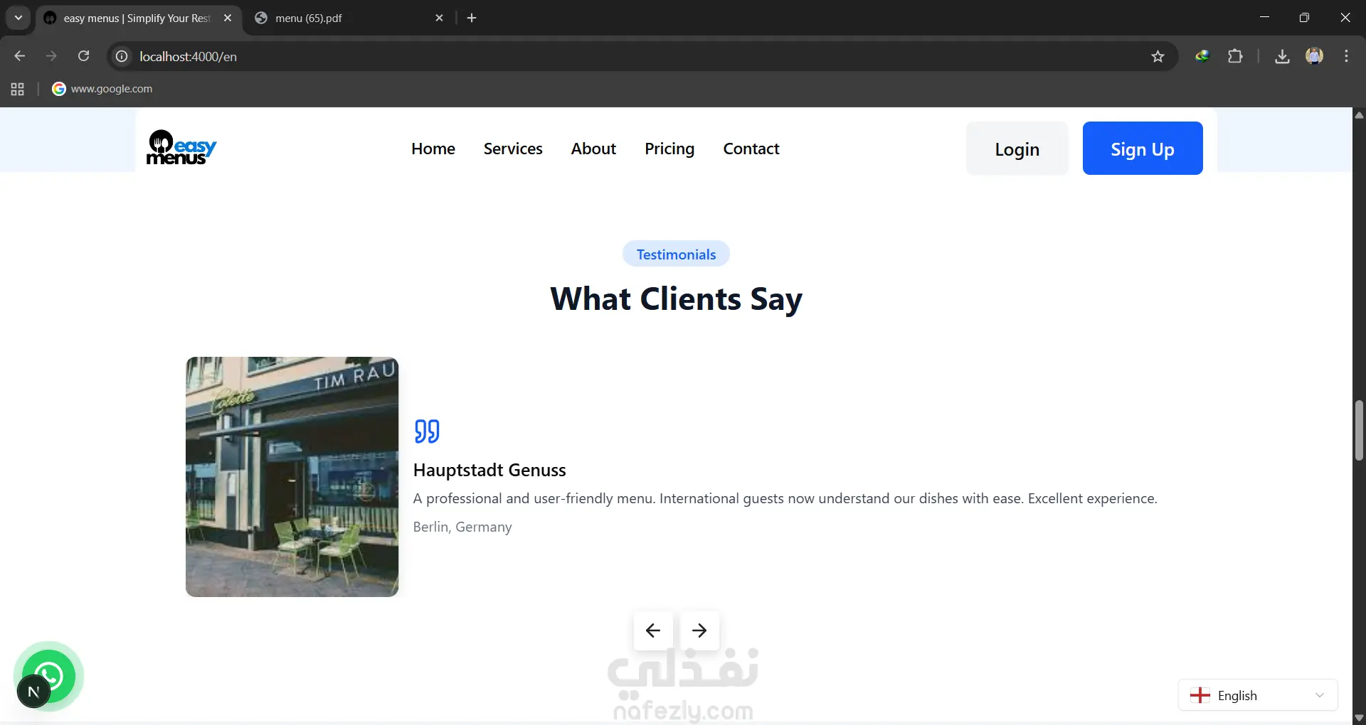 تم العمل على تطوير موقع أوروبي مبتكر يعتمد على الذكاء الاصطناعي في إنشاء وتصميم المنيوهات الخاصة بالمطاعم والكافيهات. كان دوري في المشروع هو تنفيذ وتطوير الواجهات الأمامية باستخدام تقنيات حديثة لتحقيق أداء عالي وتجربة مستخدم احترافية. شملت المهام التي تم تنفيذها: ✅ تطوير صفحات كاملة مثل: About – Contact – Blog – Blog Details – Create Menu ✅ تحسين تجربة المستخدم وإضافة أقسام ديناميكية مثل Testimonials وعرض المنيوهات ✅ دعم الموقع بـ 16 لغة مختلفة لضمان الوصول إلى مستخدمين حول العالم ✅ تنفيذ تحسينات خاصة بـ SEO Optimization لزيادة ظهور الموقع على محركات البحث الموقع تم تطويره بتقنيات React.js, Next.js, و Tailwind CSS لضمان السرعة، الكفاءة، والتصميم العصري المتجاوب مع جميع الأجهزة. هذا المشروع يعكس قدرتي على تنفيذ مشاريع احترافية موجهة للسوق الأوروبي، مع التركيز على الجودة، التفاصيل، وتجربة المستخدم المثالية 🌍