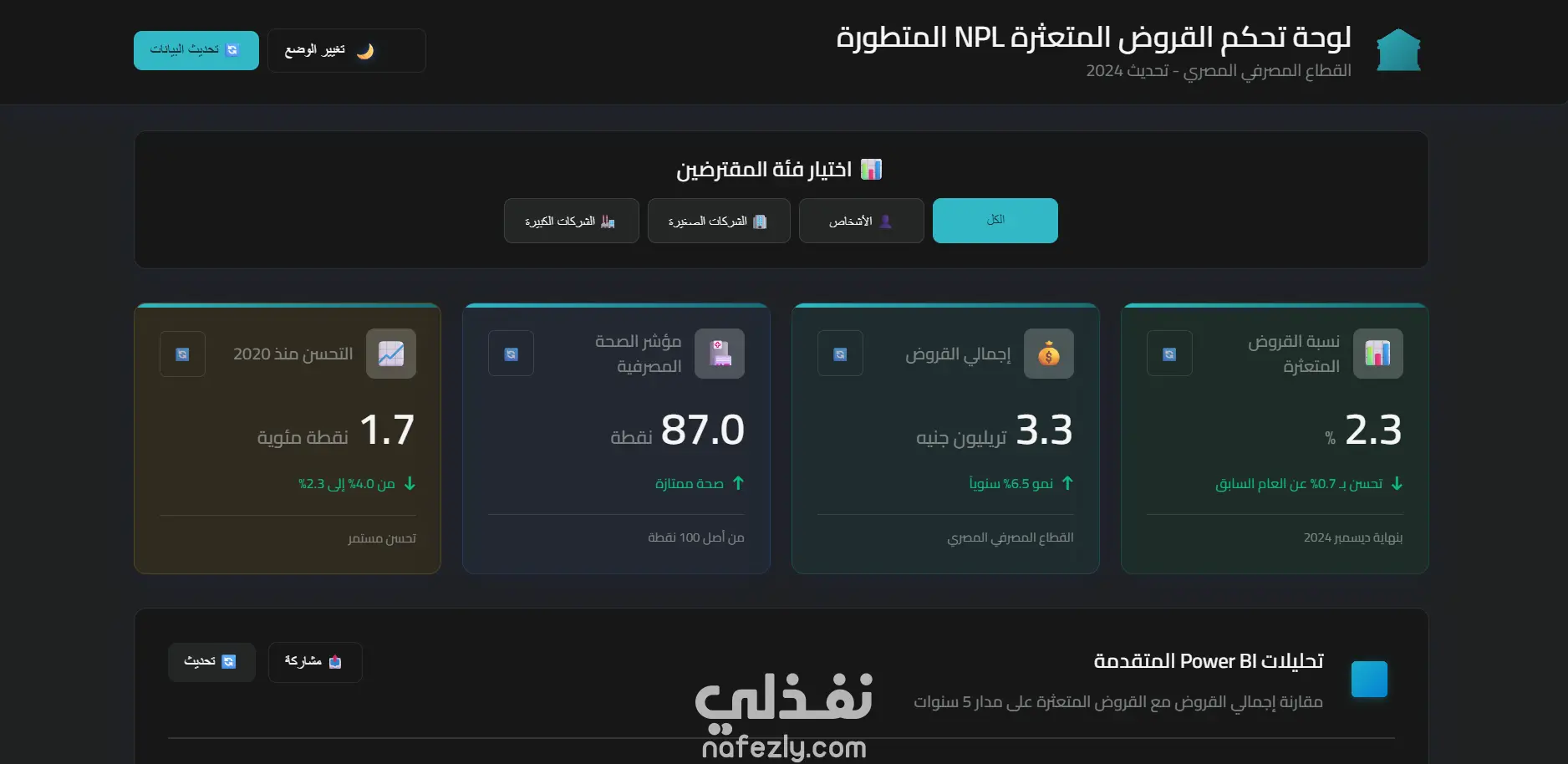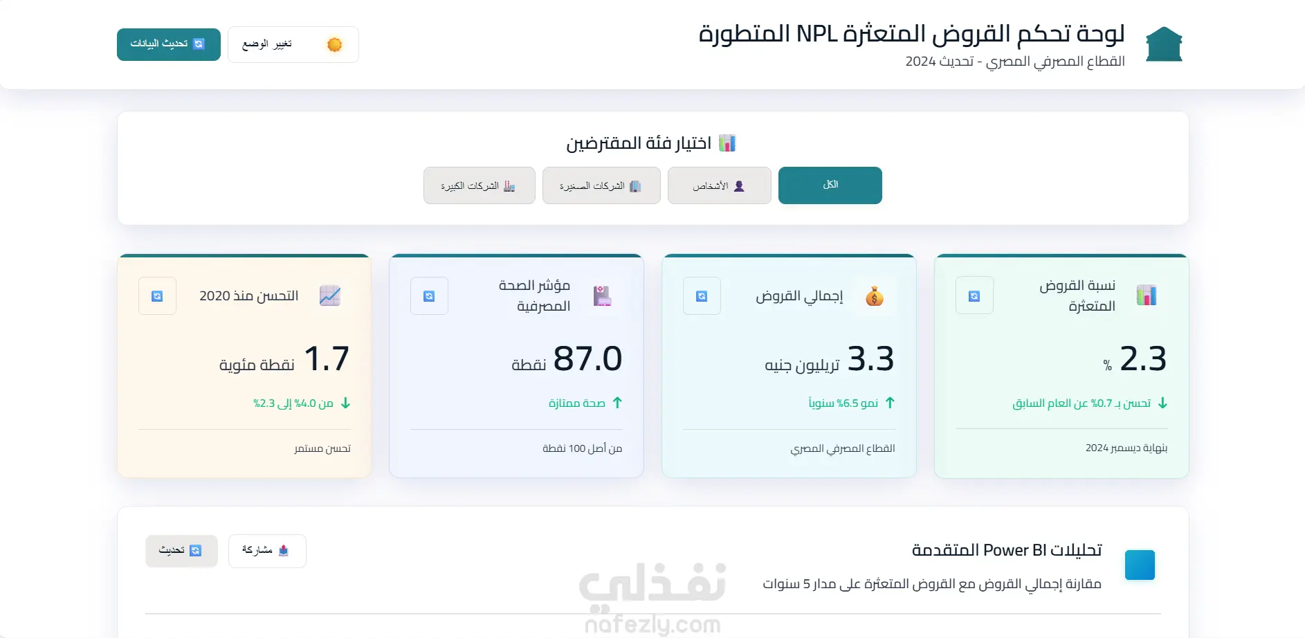 لوحة معلومات تفاعلية من Power BI تعرض رؤىً حول القروض المتعثرة علي شكل موقع جذاب ومرن. صُممت لتحليل البيانات المالية الرئيسية وتصورها، مما يساعد على تحديد الاتجاهات والحلول. تتضمن الميزات مخططات بيانية ديناميكية وفلاتر وعرضًا واضحًا للبيانات لاتخاذ قرارات فعّالة.