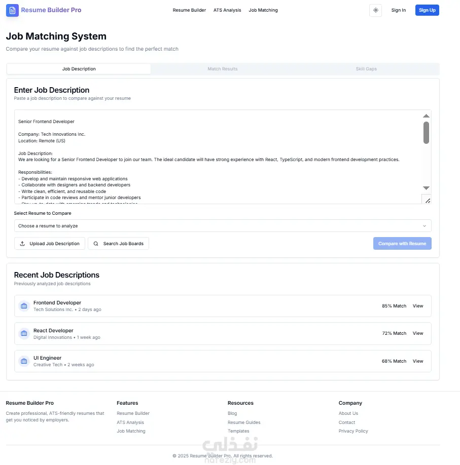 يهدف النظام إلى مساعدة المستخدم في ثلاث مراحل رئيسية. (مشروع جماعي) أولًا، من خلال CV Builder يتمكن المستخدم من إنشاء سيرة ذاتية احترافية ومنسقة بسهولة. ثانيًا، يوفر النظام ATS Analysis الذي يقوم بتحليل السيرة الذاتية للتأكد من توافقها مع أنظمة تتبع المتقدمين، مع إعطاء ملاحظات عملية لزيادة فرص قبولها. وأخيرًا، يقدم النظام ميزة Job Matching التي تقوم بمطابقة مهارات وخبرات المستخدم مع الوظائف المتاحة واقتراح الفرص الأكثر ملاءمة له.