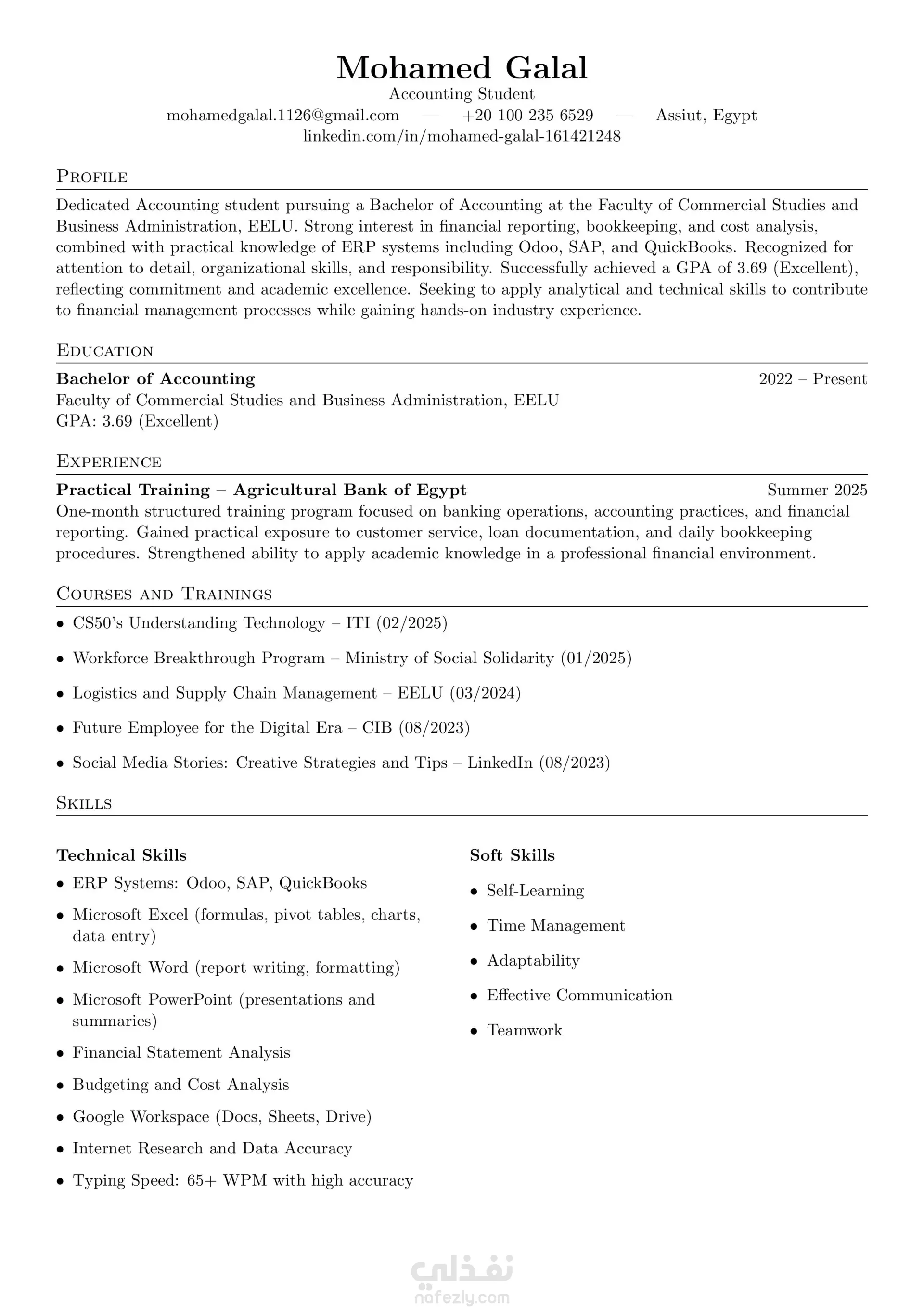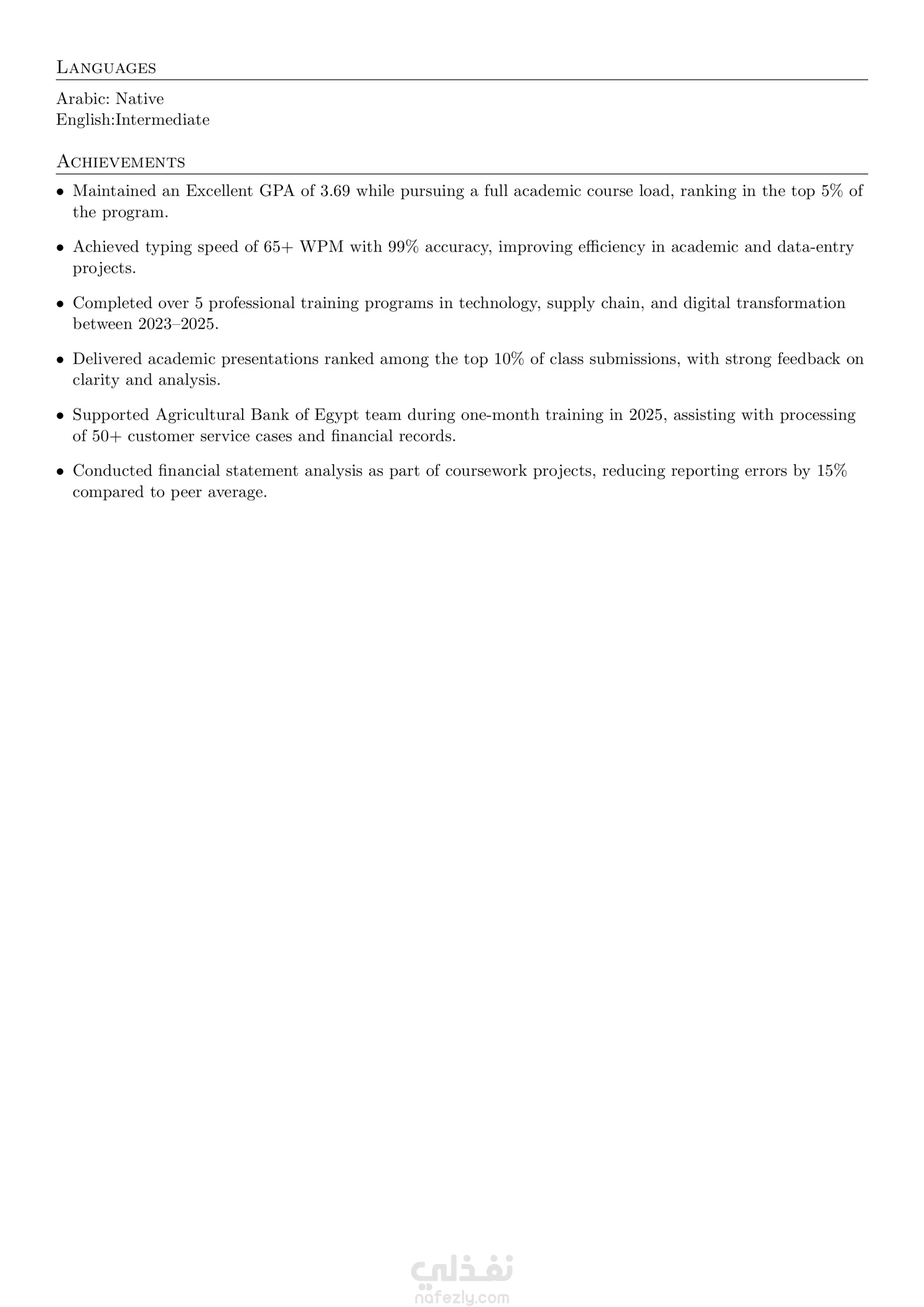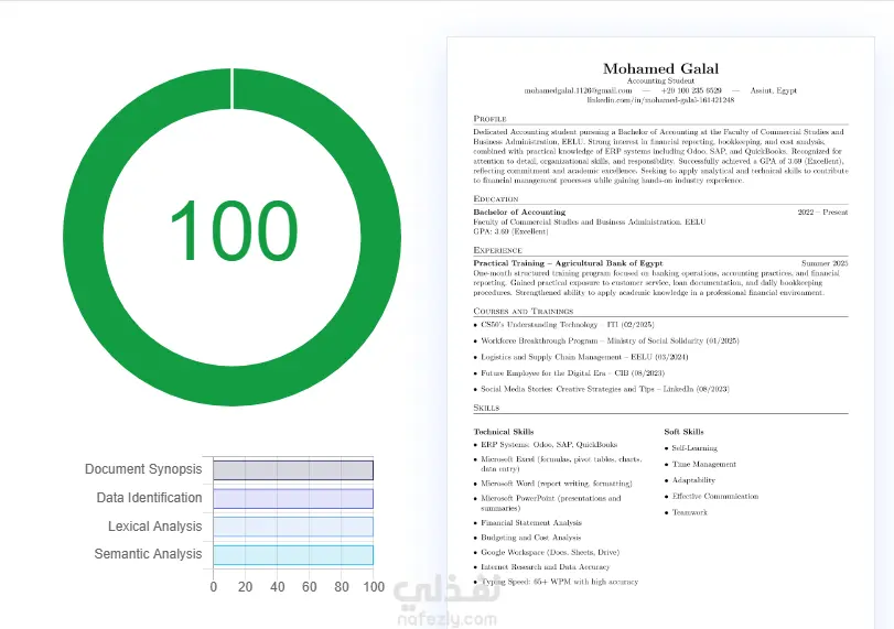 قمت بإعداد وتصميم سيرة ذاتية احترافية متوافقة بالكامل مع نظام ATS بنسبة 100%. تم تنفيذ العمل وفقاً لأحدث معايير كتابة السير الذاتية، مع التركيز على: