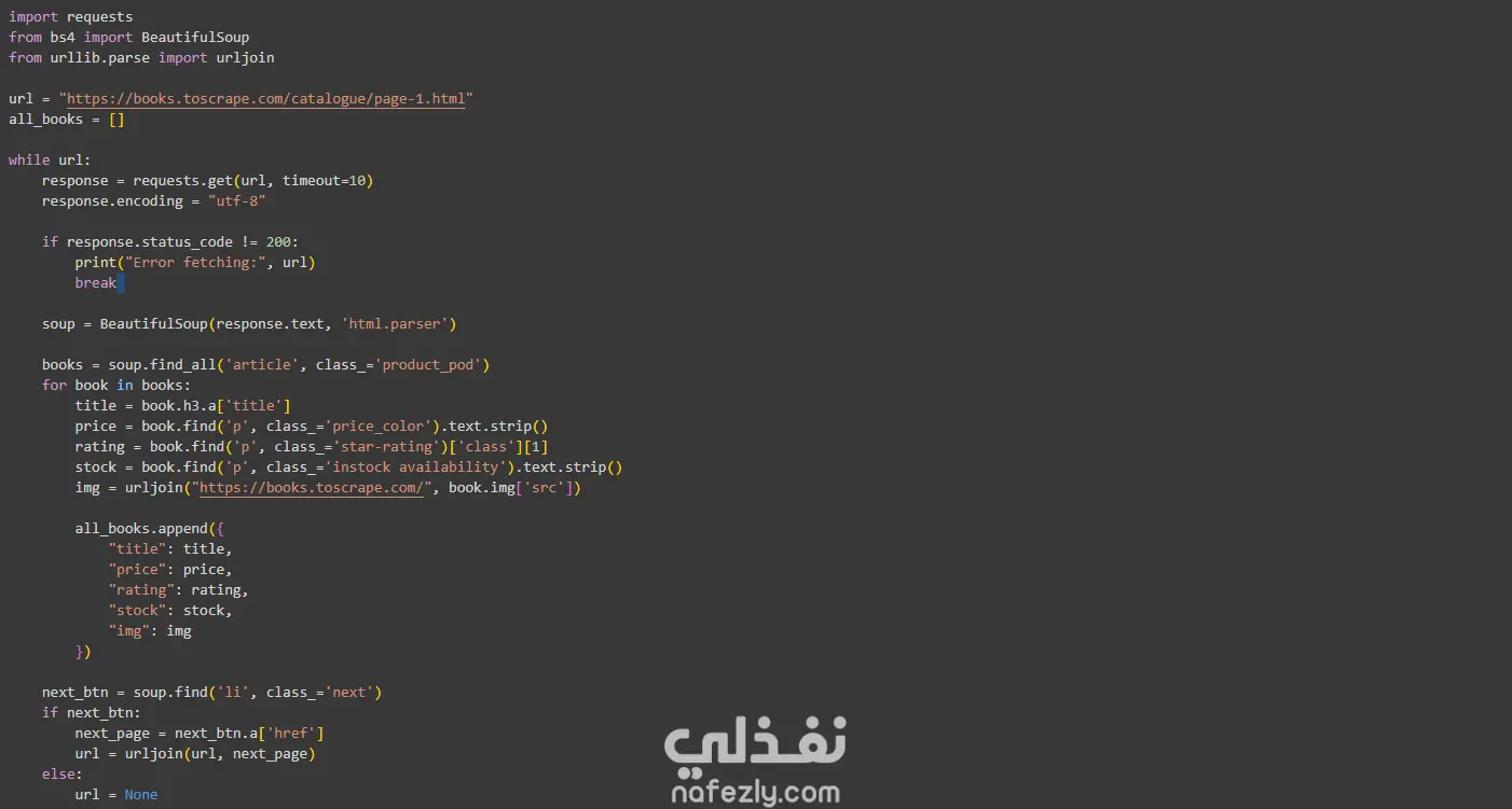 قمت بعمل مشروع Web Scraping باستخدام Python + مكتبة BeautifulSoup لاستخراج بيانات الكتب من موقع تجريبي للكتب (Books to Scrape) ويتضمن ذلك: - جمع البيانات الأساسية لكل كتاب ويتضمن (اسم الكتاب، السعر، حالة التوفر (متاح أو غير متاح)، رابط لغلاف الكتاب) ثم الانتقال لكل الصفحات. - تخزين البيانات في ملف CSV أو قاعدة بيانات (SQL). - كتابة الكود بشكل منظم ومرن لتسهيل اضافة أي تعديلات.