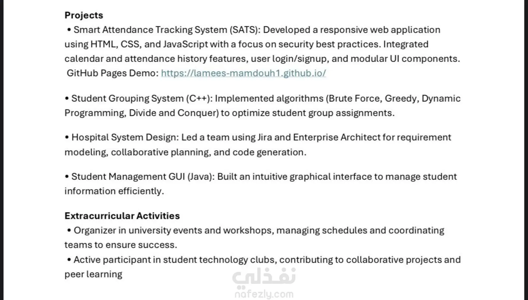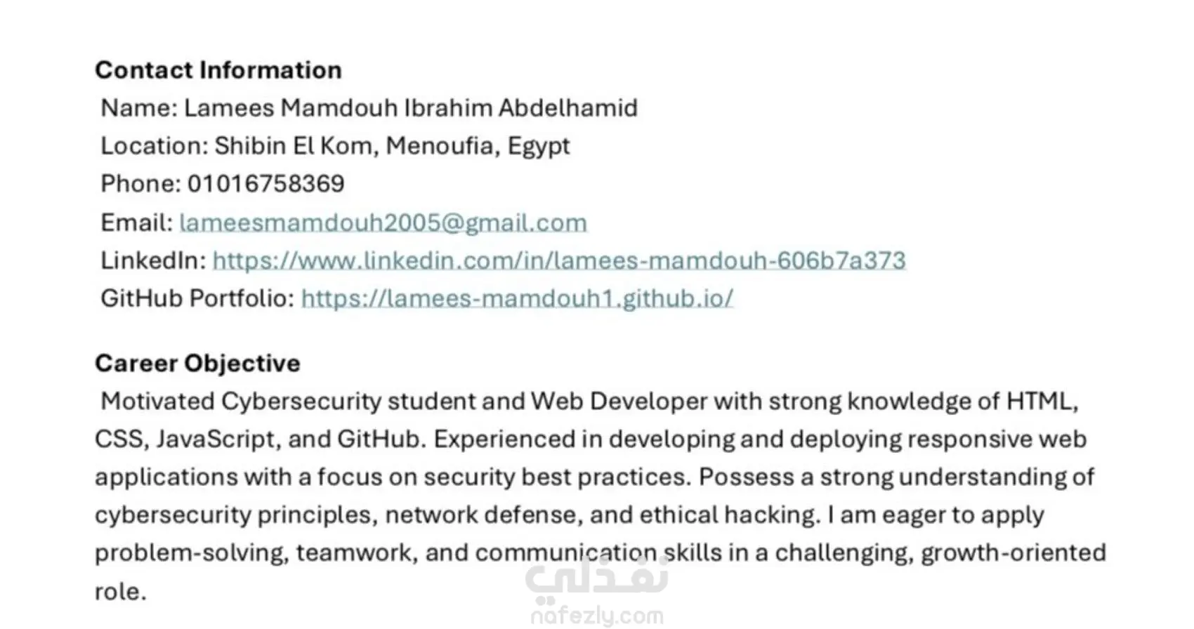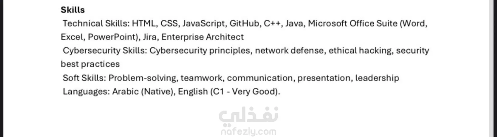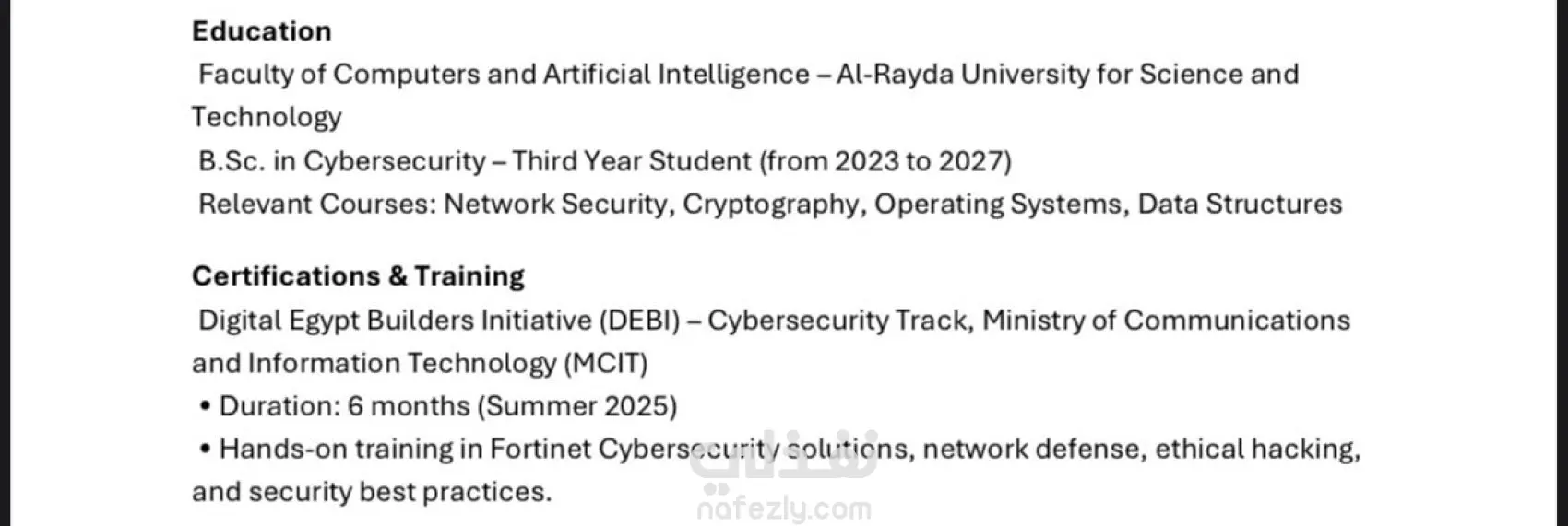 قمت بكتابة وتصميم سيرة ذاتية احترافية متوافقة مع أنظمة تتبع المتقدمين (ATS)، باستخدام تنسيق بسيط وواضح يساعد العميل على اجتياز فلاتر التوظيف الإلكترونية. ✨ مميزات العمل: تنسيق أنيق وسهل القراءة. متوافق مع نظام ATS بنسبة 100٪. متوفر باللغتين العربية والإنجليزية. تسليم بصيغتي PDF وWord