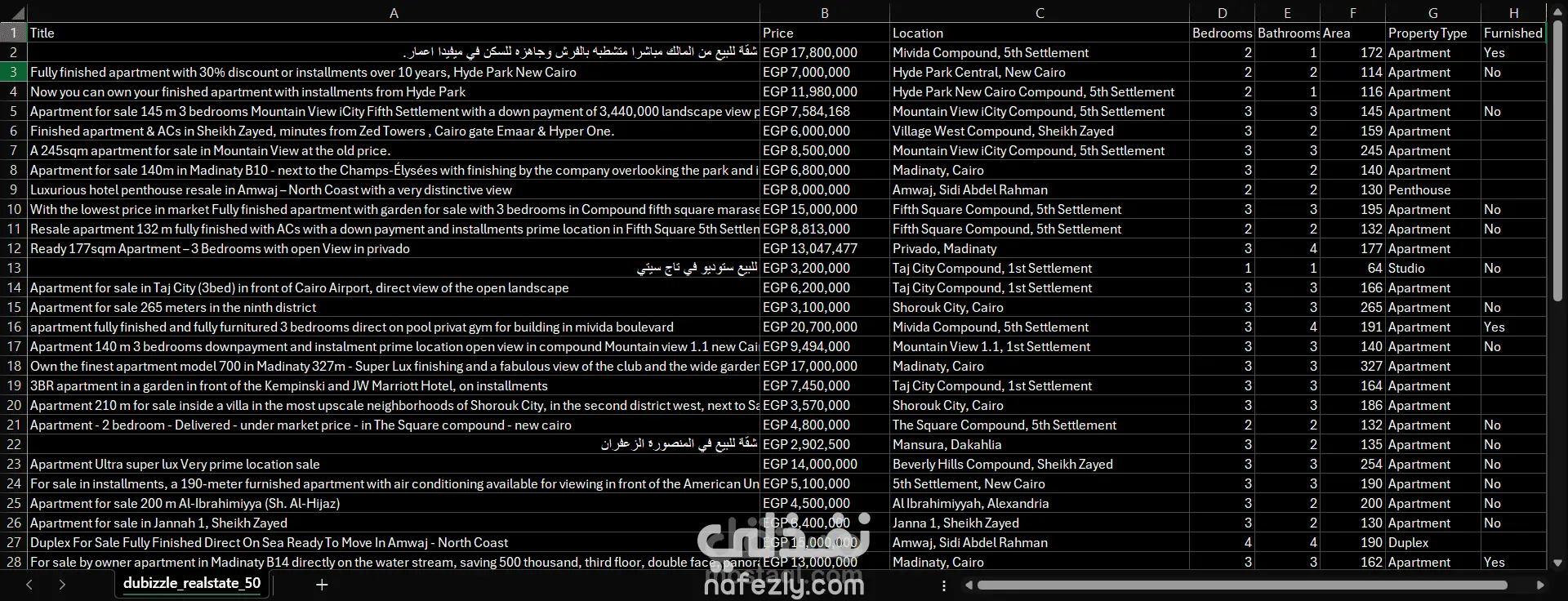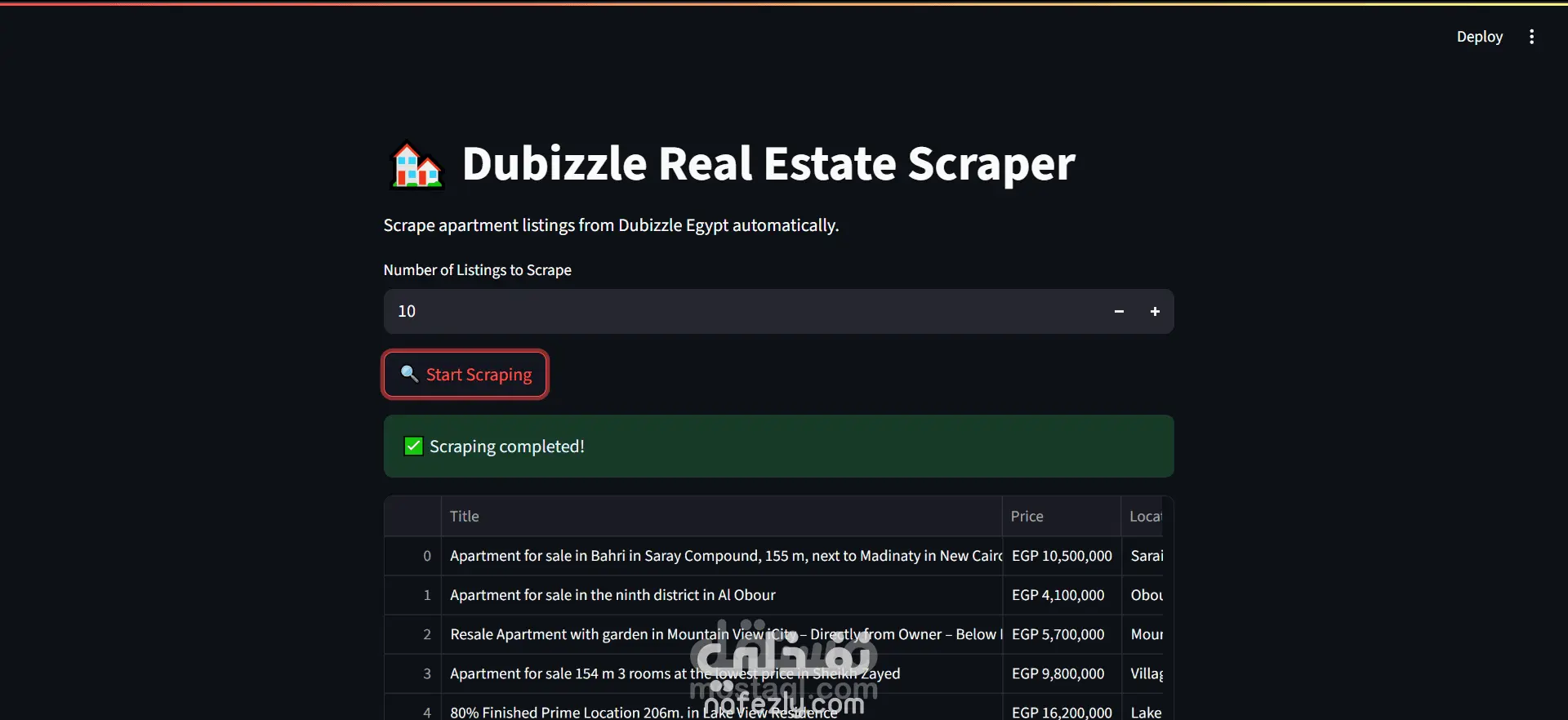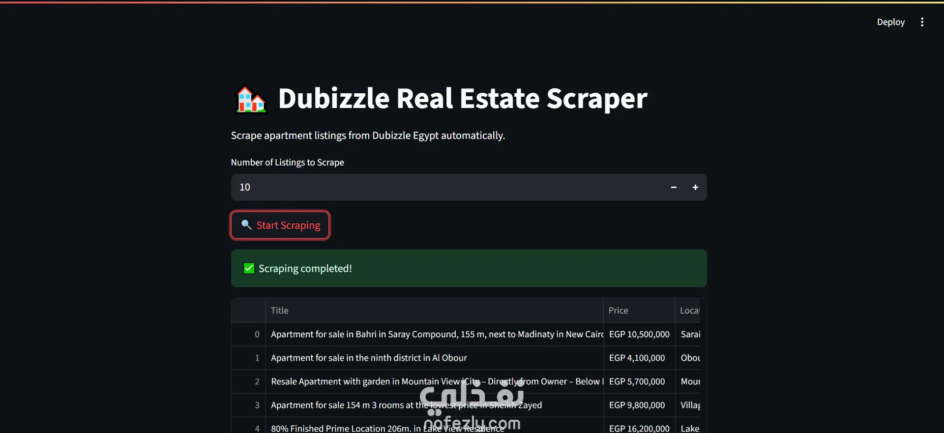 قمت بتطوير أداة Web Scraping متقدمة لاستخراج بيانات العقارات من موقع Dubizzle Egypt بشكل تلقائي، بهدف تحليل السوق العقاري وتنظيم المعلومات. المهام التي قمت بها: استخدام مكتبات Python مثل Selenium لجمع بيانات مثل: العنوان، السعر، المنطقة، المساحة، تاريخ النشر، وعدد الصور. معالجة البيانات وتحويلها إلى تنسيق CSV باستخدام مكتبة Pandas لتسهيل التحليل أو العرض في تقارير. بناء واجهة تفاعلية بسيطة باستخدام Streamlit لتحديد عدد الإعلانات، بدء عملية الجمع، واستعراض النتائج مباشرة. التعامل مع التصفح الديناميكي وصفحات التحميل الآلي (infinite scroll) والتأكد من تخطي الإعلانات غير المكتملة. دعم إعادة التشغيل الذكي، مع حفظ البيانات السابقة لمنع التكرار.