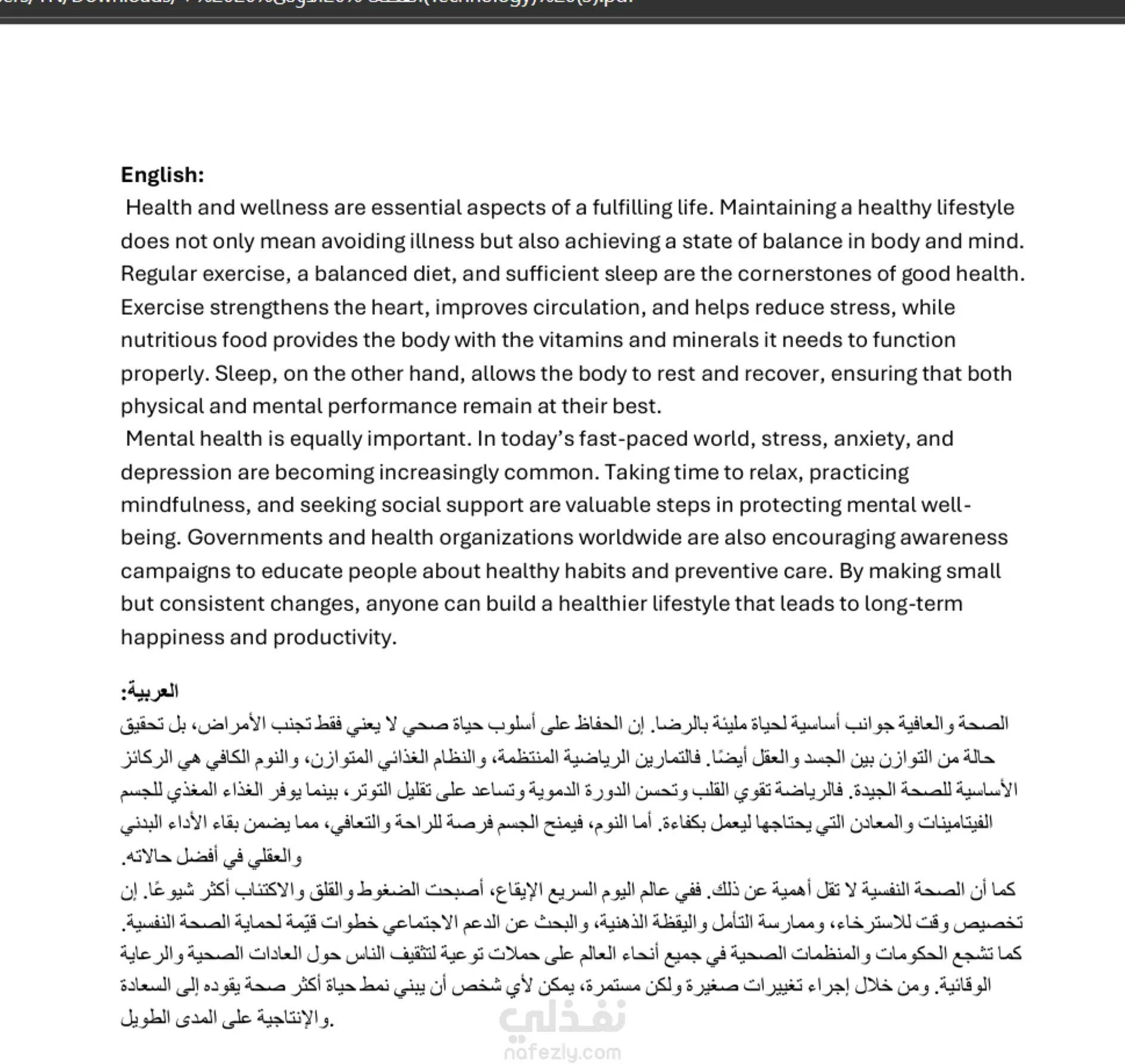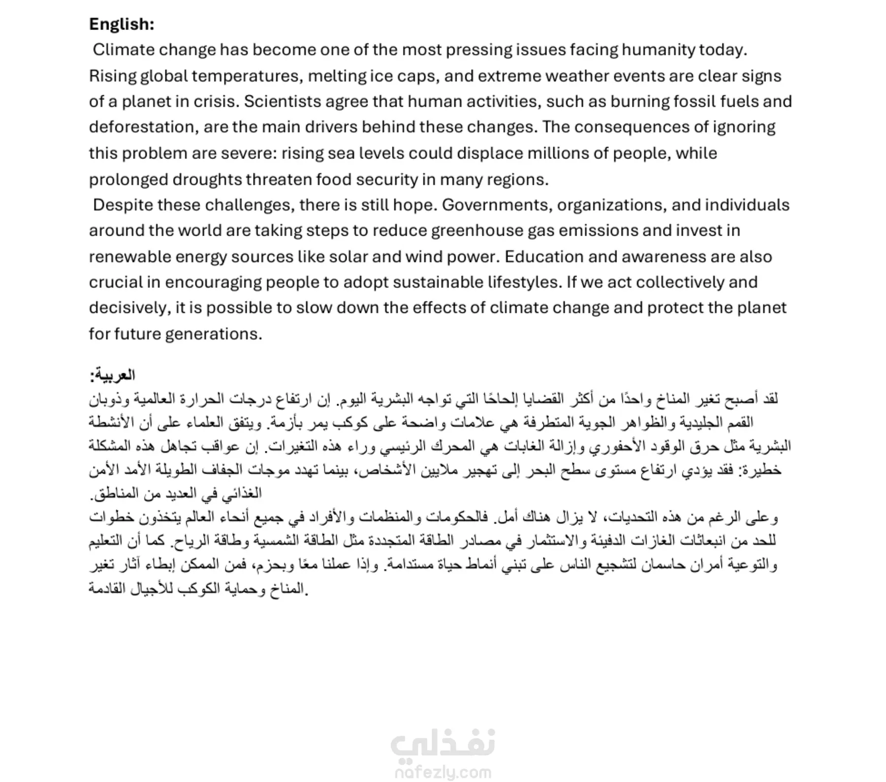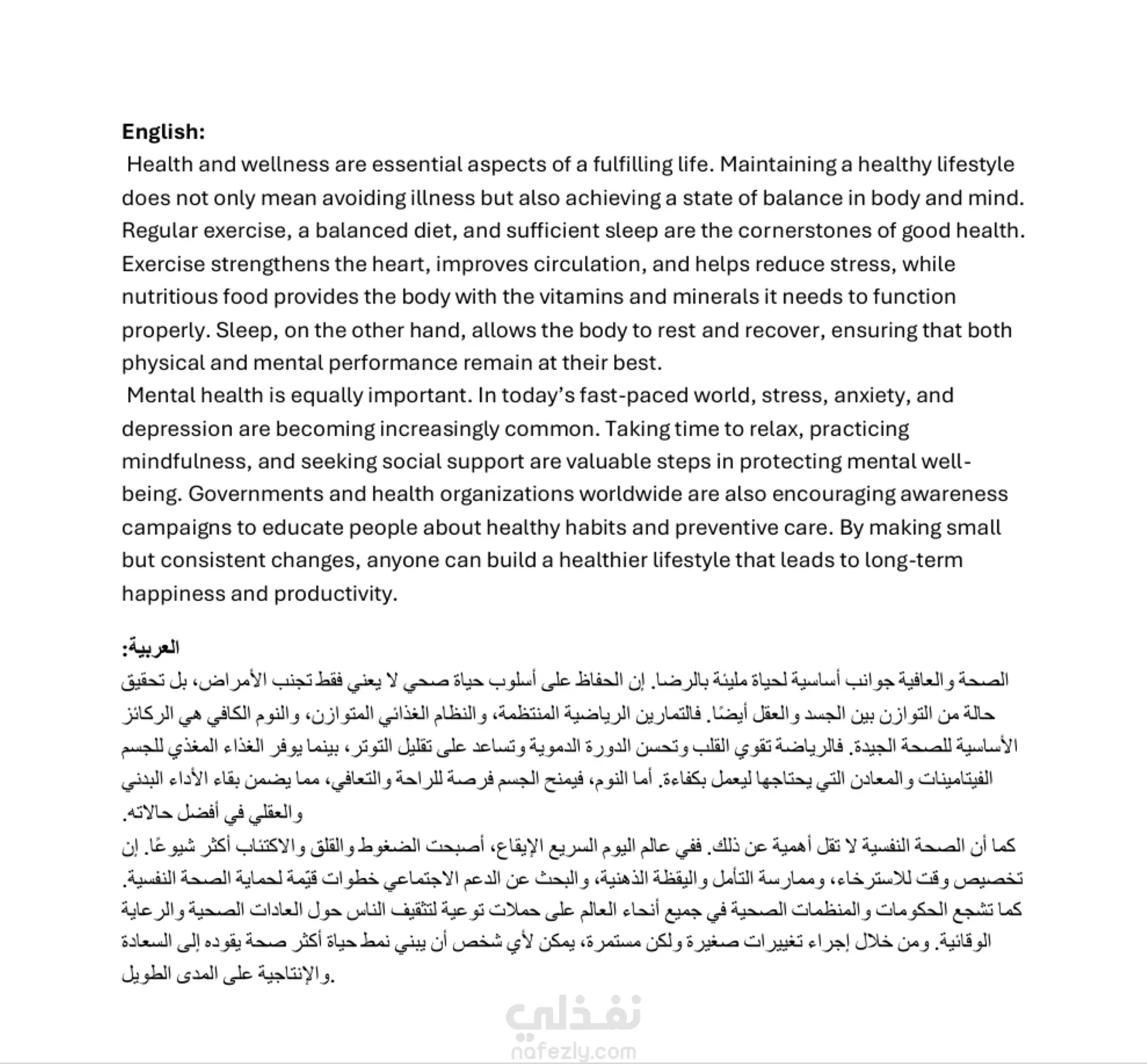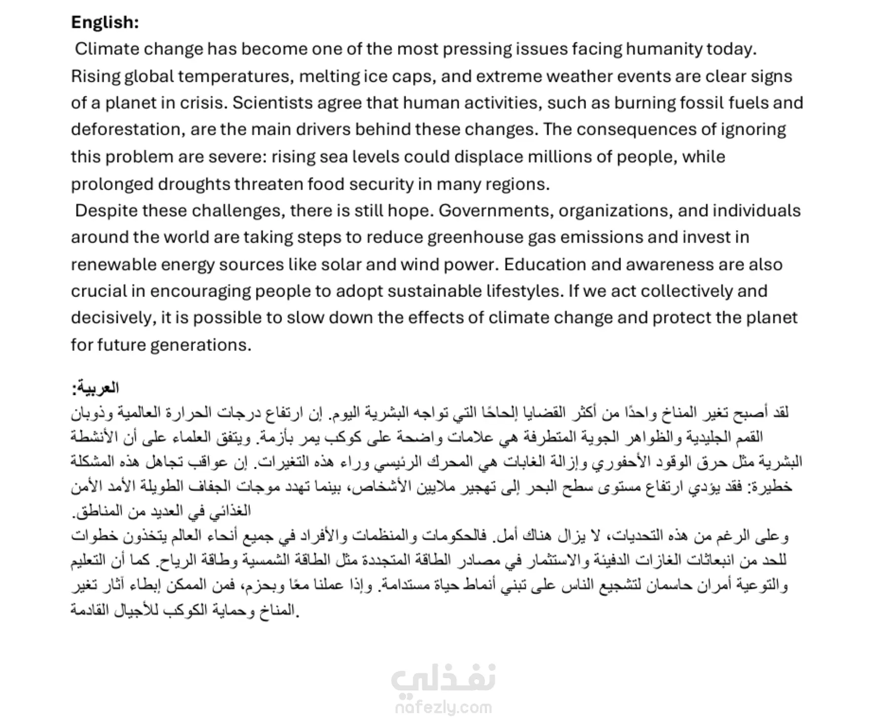 مميزات الخدمة: ترجمة بشرية 100٪ بدون استخدام برامج آلية. مراجعة لغوية وإملائية دقيقة للنص المترجم. أسلوب أكاديمي أو رسمي أو بسيط حسب الطلب. إمكانية ترجمة الملفات (Word, PDF, TXT). تسليم منسق وجاهز للطباعة أو النشر. أنواع النصوص التي أترجمها: مقالات – سير ذاتية – ملفات أكاديمية – محتوى مواقع – عروض تقديمية. الدقة، الالتزام بالمواعيد، وضمان رضاك التام هي أولوياتي.