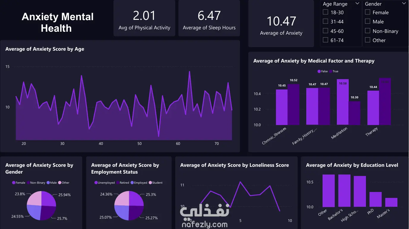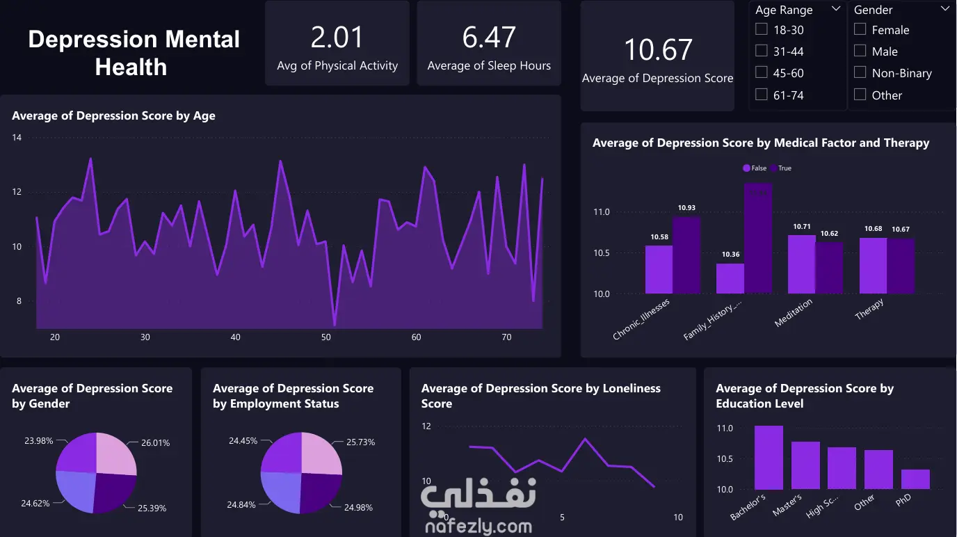 قمت في هذا المشروع بتحليل مجموعة بيانات Anxiety & Depression Mental Health Factors من Kaggle، وبناء لوحة تحكم تفاعلية باستخدام Power BI لعرض الرؤى المؤثرة على الصحة النفسية ودعم اتخاذ القرار المبني على البيانات. ما الذي يتضمنه المشروع: • تحليل متوسط درجات القلق والاكتئاب عبر الفئات الديموغرافية (الفئات العمرية، الجنس، المستوى التعليمي). • دراسة تأثير الحالة الوظيفية والشعور بالوحدة على الصحة النفسية. • استكشاف العلاقات بين ساعات النوم، النشاط البدني، التاريخ الطبي، والحصول على علاج / جلسات علاجية. • إبراز عوامل نمط الحياة (مثل النوم والنشاط البدني) وتأثيرها القوي على الرفاهية النفسية. الأدوات المستخدمة: Power BI (Power Query, DAX) – Excel – Python (Pandas, NumPy) يمكنني تنفيذ لوحات مشابهة مخصّصة لأنشطة صحية أو بحثية، مع تقديم نسخ قابلة للتعديل وشرح لطريقة التحديث والتشغيل.