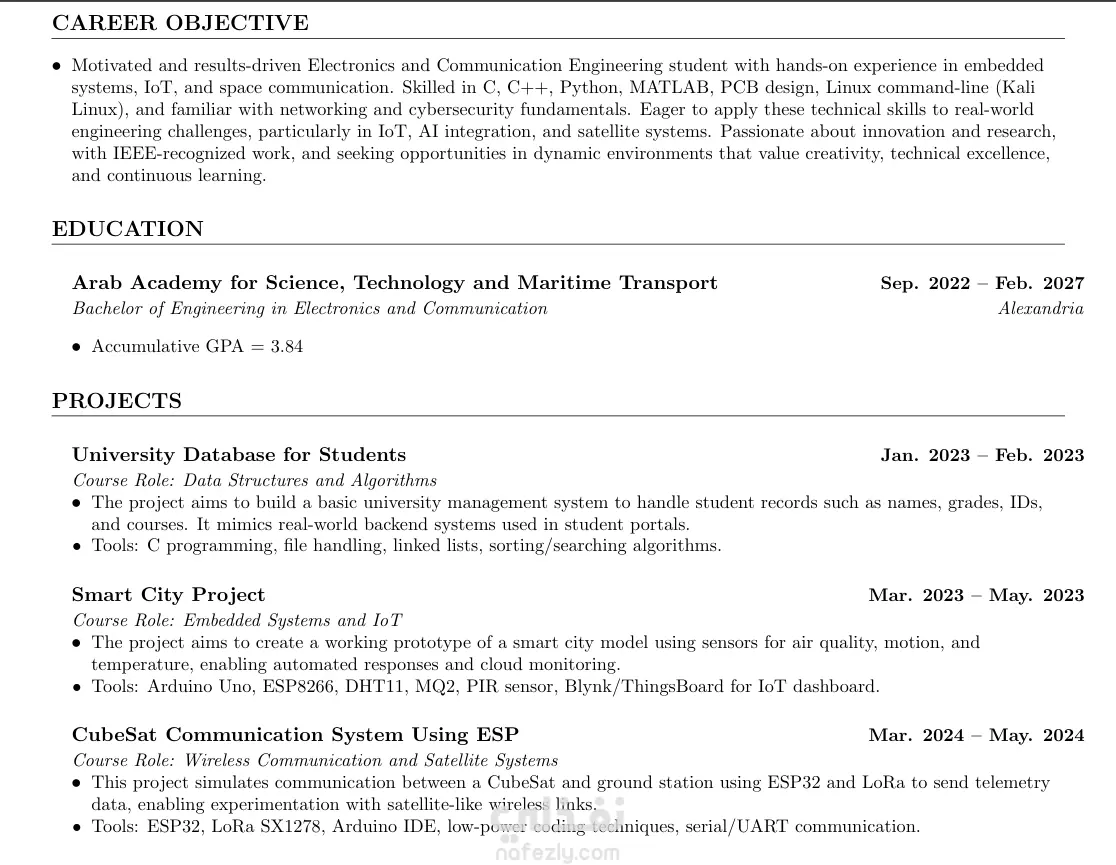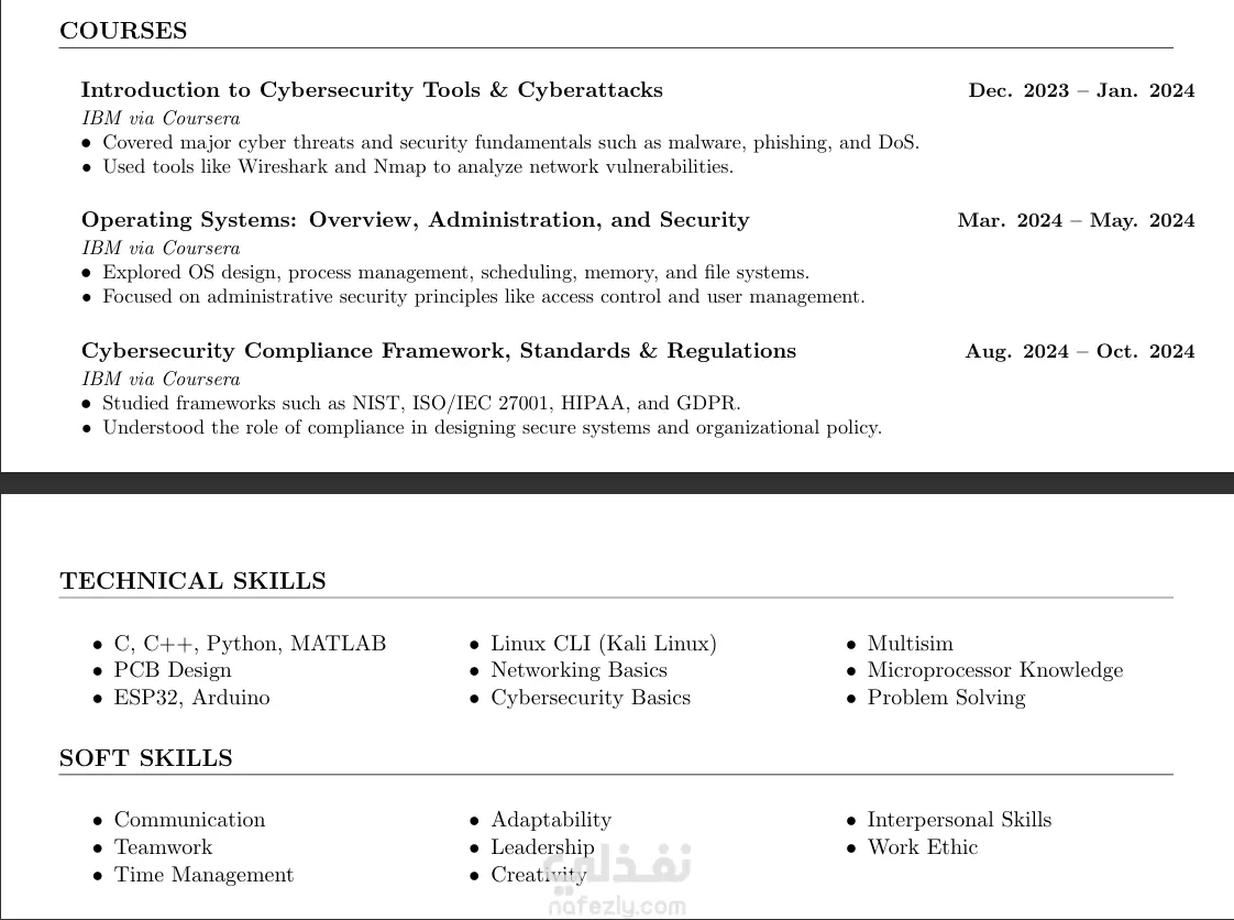 في هذا المشروع قمت بعمل تصميم احترافي لسيرة ذاتية (CV) وبورتفوليو باستخدام Overleaf، مع التركيز على التنظيم والتنسيق بما يتناسب مع المعايير الأكاديمية وسوق العمل. محتويات المشروع: CV Structure: إنشاء أقسام منظمة (Personal Info – Education – Experience – Skills – Courses – Projects). تنسيق النصوص والمسافات والخطوط لتكون واضحة واحترافية. استخدام قالب عصري مناسب للتقديم على الوظائف والمنح. Portfolio Section: تصميم قسم مخصص لعرض المشاريع أو الأعمال السابقة. تنظيم المشاريع مع عناوين واضحة ونبذة مختصرة عن كل مشروع. تحسين العرض البصري من خلال ترتيب العناصر بطريقة جذابة. Customization: دعم اللغتين (عربي / إنجليزي). إضافة أيقونات وعناصر تصميم بسيطة لزيادة الاحترافية. إمكانية تعديل الأقسام حسب احتياجات المستخدم. توافق التصميم مع متطلبات أنظمة ATS. النتائج: سيرة ذاتية منظمة بتنسيق احترافي. بورتفوليو واضح وسهل القراءة. تصميم جاهز للطباعة أو الإرسال بصيغة PDF. قابل للتعديل بسرعة لأي تحديث مستقبلي.