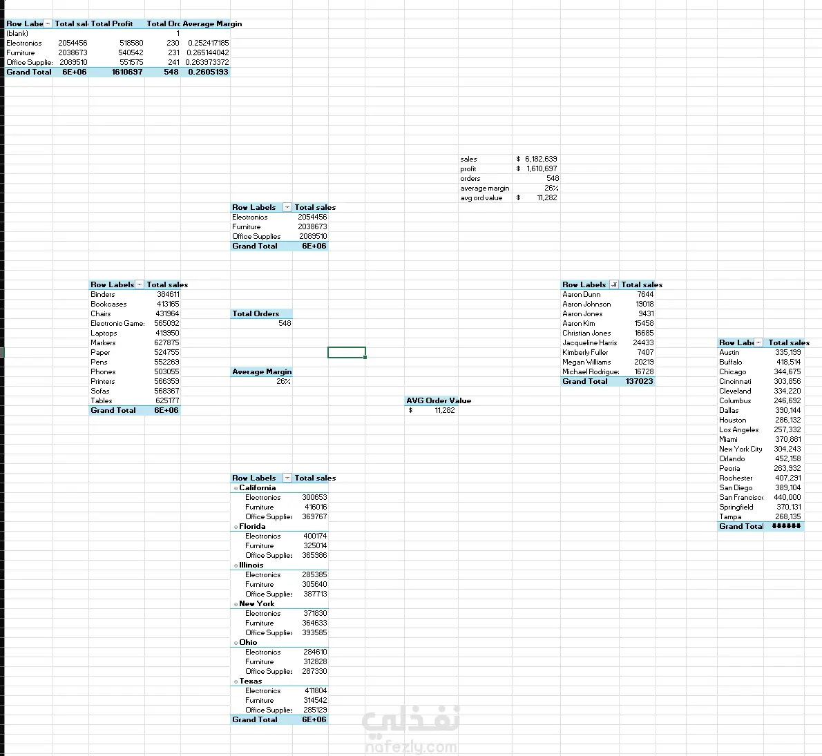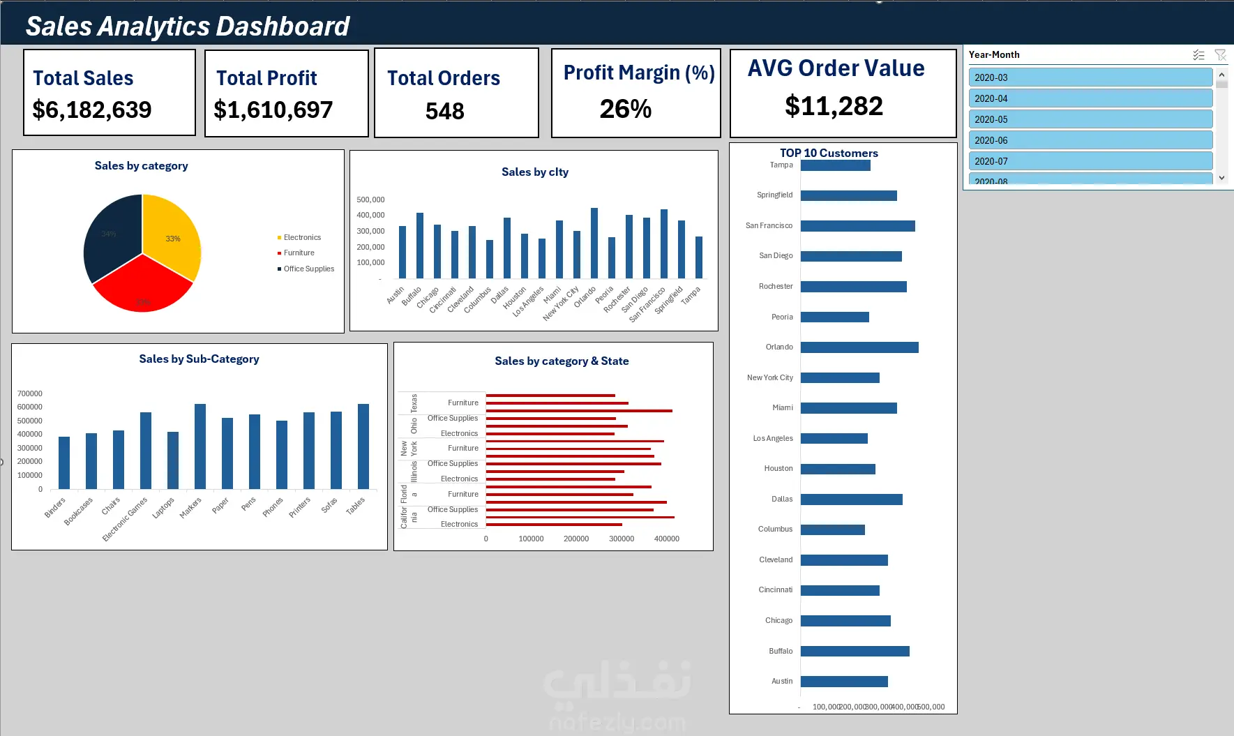 1. Total Sales (إجمالي المبيعات) بيوضح إجمالي قيمة المبيعات خلال الفترة المحددة. يساعد على معرفة حجم الإيرادات الكلي ومتابعة الأداء العام. مثلاً لو الشركة باعت بـ 250,000 جنيه في سنة 2024. 2. Total Profit (صافي الأرباح) يحسب الربح بعد خصم التكاليف من المبيعات. بيوضح مدى كفاءة العمليات وتحقيق الأرباح. يساعد الإدارة تعرف إذا كانت الأرباح بتنمو ولا لأ. 3. Orders (عدد الطلبات) بيحسب عدد الطلبات المنفذة خلال الفترة. بيساعد على معرفة النشاط التجاري — هل المبيعات جاية من عدد كبير من الطلبات الصغيرة ولا العكس. 4. Average Order Value (متوسط قيمة الطلب) يحسب متوسط قيمة المبيعات لكل طلب واحد. معادلة بسيطة: Total Sales ÷ Number of Orders كلما زاد، يدل إن العملاء بيشتروا منتجات أعلى قيمة. 5. Profit Margin (نسبة هامش الربح) بتوضح النسبة المئوية للربح من إجمالي المبيعات. معادلة: (Profit ÷ Total Sales) × 100 كلما زادت النسبة، كلما كان المشروع أكفأ في إدارة التكاليف. 6. Category & Sub-Category Analysis بتوضح أي الفئات أو الفئات الفرعية بتحقق أعلى مبيعات أو أرباح. بتساعدك تعرف المنتجات الرائجة أو الأقل أداءً. مثلاً: الإلكترونيات تحقق 40% من المبيعات. 7. Sales by City/State (توزيع المبيعات حسب المدن والولايات) بتظهر خريطة أو أعمدة توضح مناطق التركيز الجغرافي. بتساعد على تحديد الأسواق القوية أو المناطق الضعيفة. 8. Top 10 Customers جدول أو رسم بياني بأفضل العملاء حسب حجم المبيعات. بيساعد على تحديد العملاء المميزين اللي ممكن تقدم لهم عروض خاصة أو برامج ولاء.