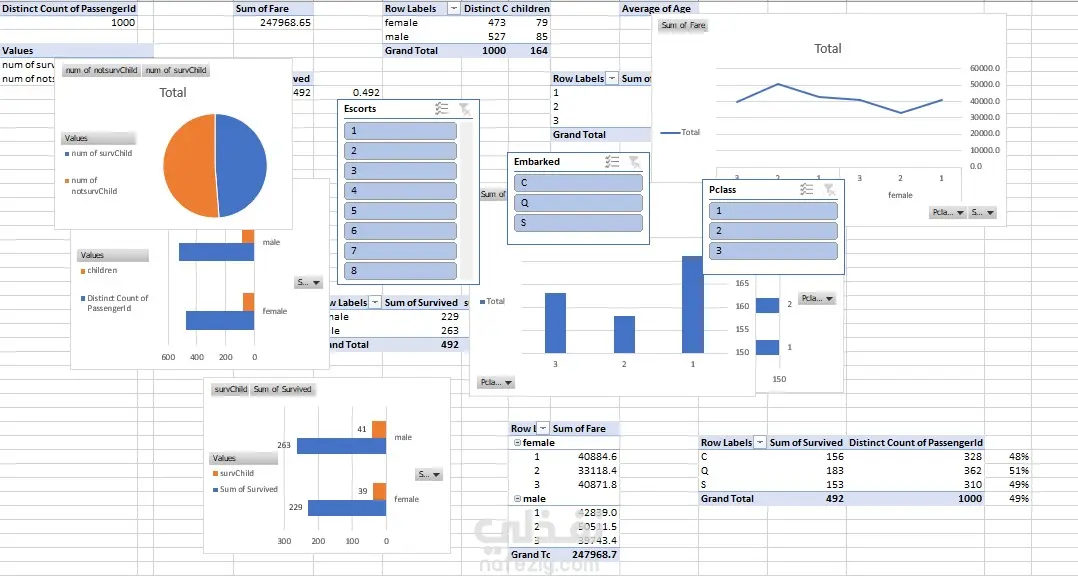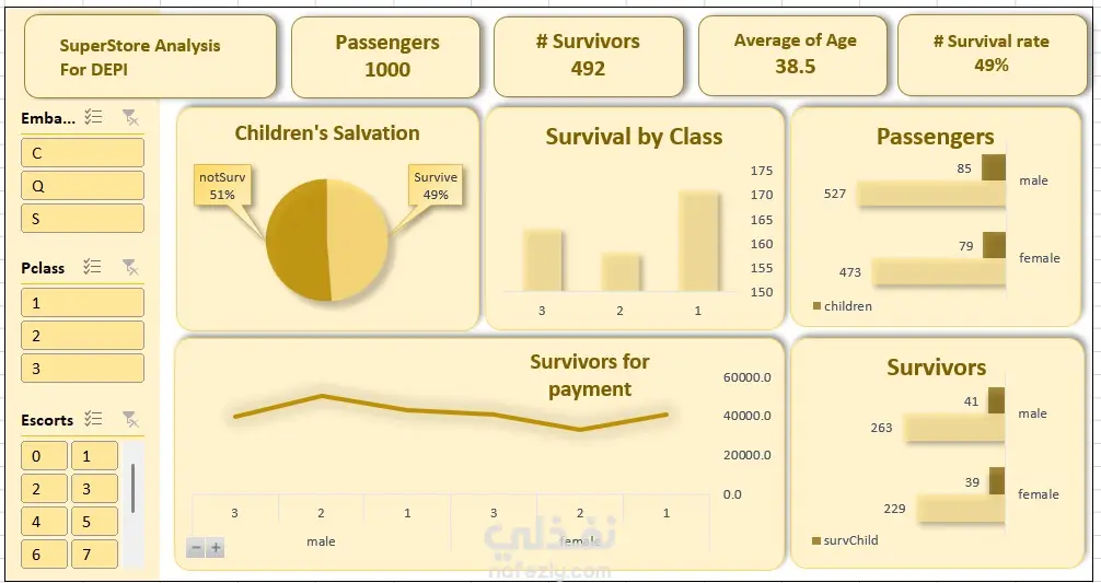 المشروع عبارة عن لوحة تحليلية تفاعلية تهدف إلى دراسة بيانات ركاب سفينة التايتانيك واكتشاف العوامل المؤثرة في معدل النجاة. توضح اللوحة عدد الركاب (1000)، عدد الناجين (492)، متوسط العمر (38.5)، ونسبة النجاة (49%). تُظهر المخططات العلاقة بين النجاة والجنس، الفئة الاجتماعية، وعدد المرافقين، مع إبراز أن النساء والأطفال وركاب الدرجة الأولى كانت لديهم فرص نجاة أعلى. تم تنفيذ المشروع باستخدام Excel مع مخططات تفاعلية وSlicers لتسهيل تحليل البيانات وعرض النتائج بشكل واضح واحترافي.
