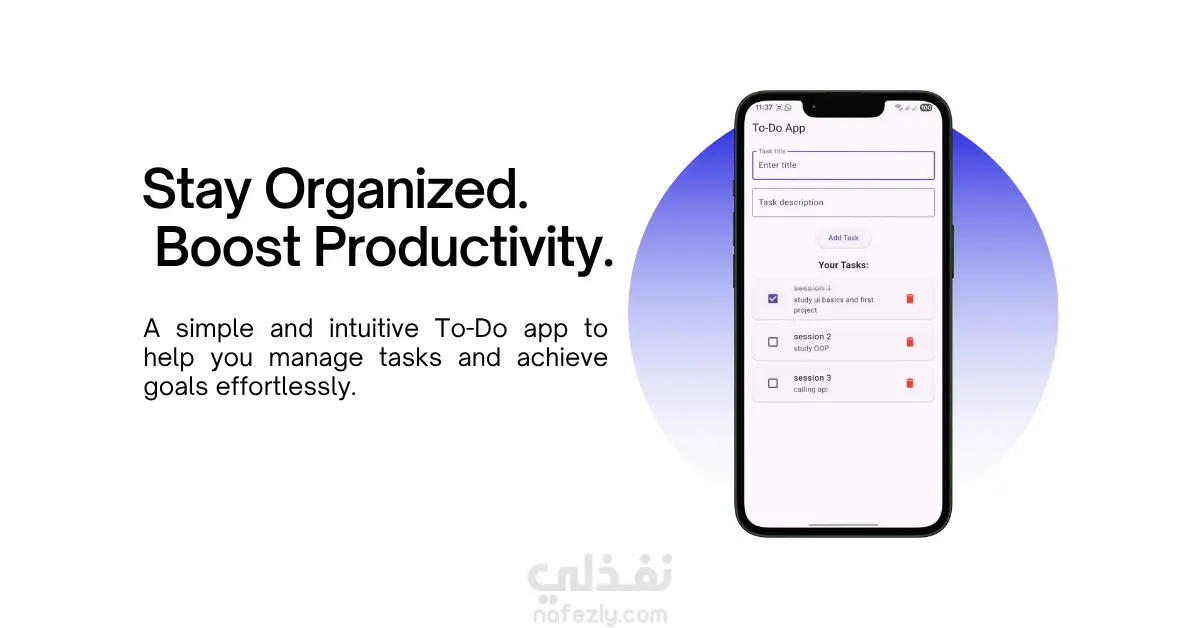 تطبيق To-Do يساعدك على تنظيم مهامك اليومية بسهولة، حيث يمكنك إضافة المهام، متابعتها، وحذفها من خلال تصميم بسيط وسهل الاستخدام.