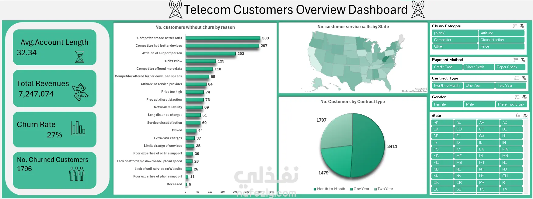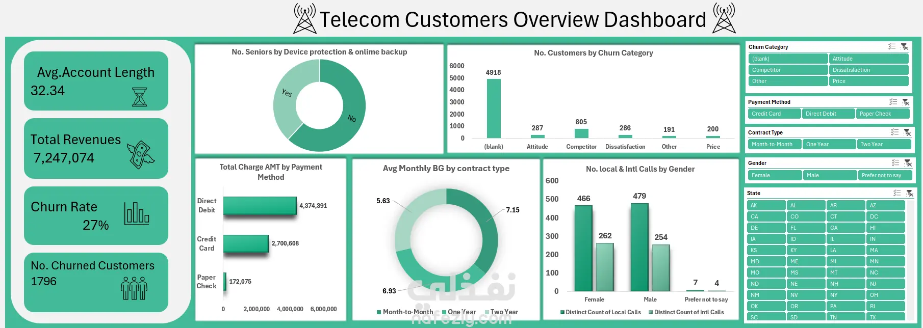 Telecom Customer Dashboard – Built in Excel I recently created this interactive dashboard using Microsoft Excel to analyze customer data from a telecom company. The dashboard provides a clear overview of key performance metrics and customer behaviour. What this dashboard highlights: Churn Rate: 27% – that’s 1,796 customers lost. ⏳ Average Account Length: 32.34 months. Total Revenue: $7,247,074. The dashboard covers: Top reasons customers are leaving, such as better offers or devices from competitors, and dissatisfaction with support. Customer distribution by contract type (Month-to-Month, One-Year, Two-Year). Payment methods breakdown and total revenue by method. Call activity by gender and state. Churn categories including Attitude, Price, Competitor, and Dissatisfaction. Senior customers' usage of device protection and online backup services. This project demonstrates how Excel can be a powerful tool for data visualization and business decision-making, especially when handling customer insights and retention analysis.