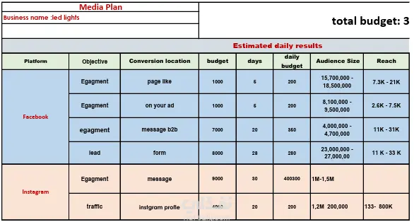 خطة أعلانية لشرح توزيع الميزانية الأعلانية وشرح التوقعات التي سوف حصل علية وعدد التفاعل