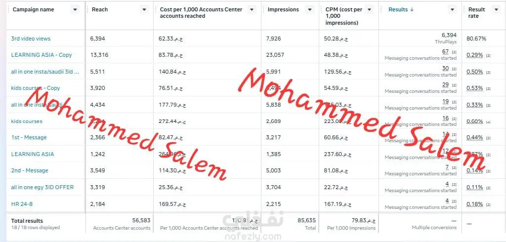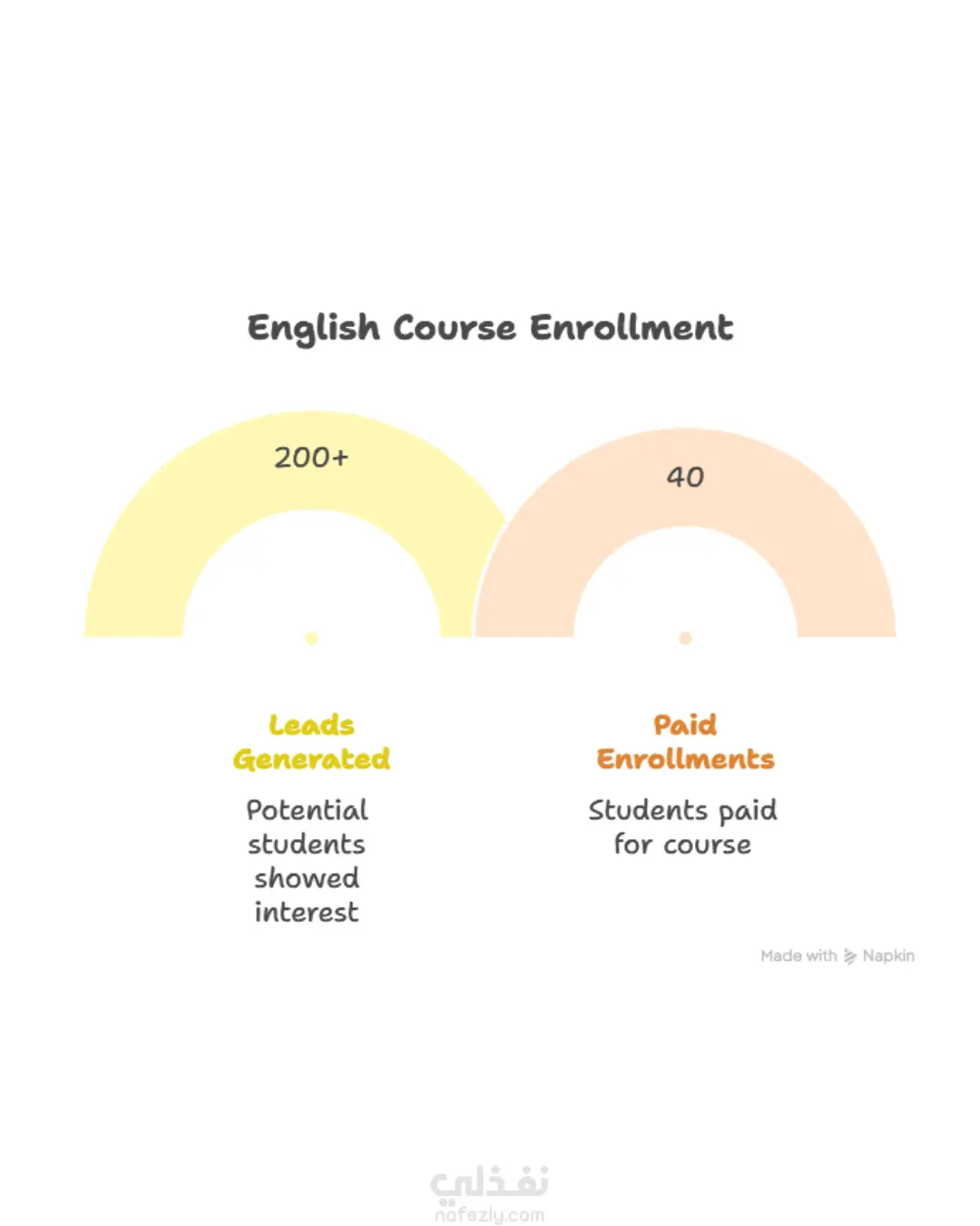 المدة: من يونيو 2023 إلى سبتمبر 2023 الدول المستهدفة: السعودية والإمارات والكويت الهدف: زيادة عدد الاشتراكات في كورسات اللغة الإنجليزية أونلاين. ما تم تنفيذه: إعداد حملات رسائل على إنستجرام لجذب المهتمين بالدورات. استخدام بيانات الحملات السابقة لبناء جماهير مشابهة (Lookalike Audiences). تحسين معدل التحويل وتقليل تكلفة الـ Lead. النتائج: أكثر من 200 Lead مؤهل. 40 اشتراك فعلي خلال 4 شهور. إجمالي مبيعات: 32,000 جنيه مصري. متوسط ROAS: 6.1x