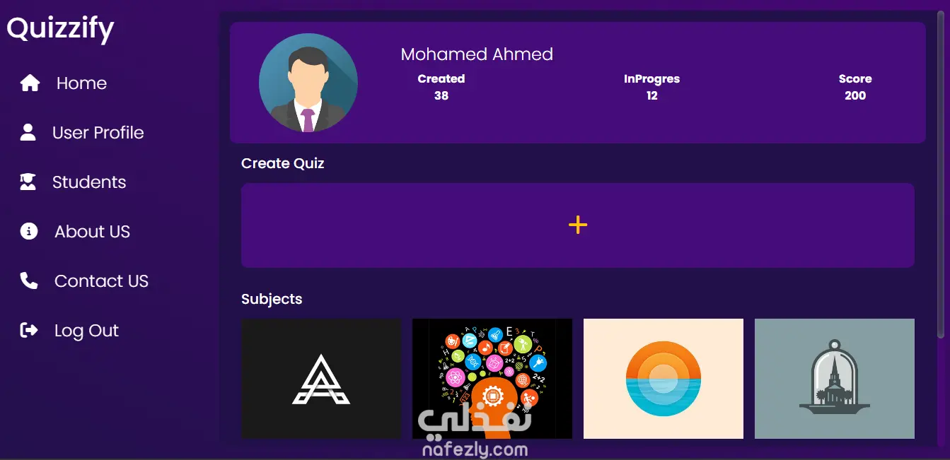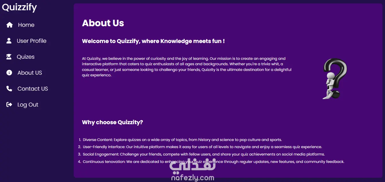 Quizzify هو مشروع تفاعلي يهدف إلى تحويل عملية التعلّم إلى تجربة ممتعة وشيّقة من خلال تقديم اختبارات ذكية مخصصة للمستخدمين. يوفّر المنصة للمستخدمين أدوات لإجراء اختبارات سريعة، تتكيّف مع مستواهم وتساعدهم على قياس معارفهم واكتشاف نقاط القوة والضعف لديهم.