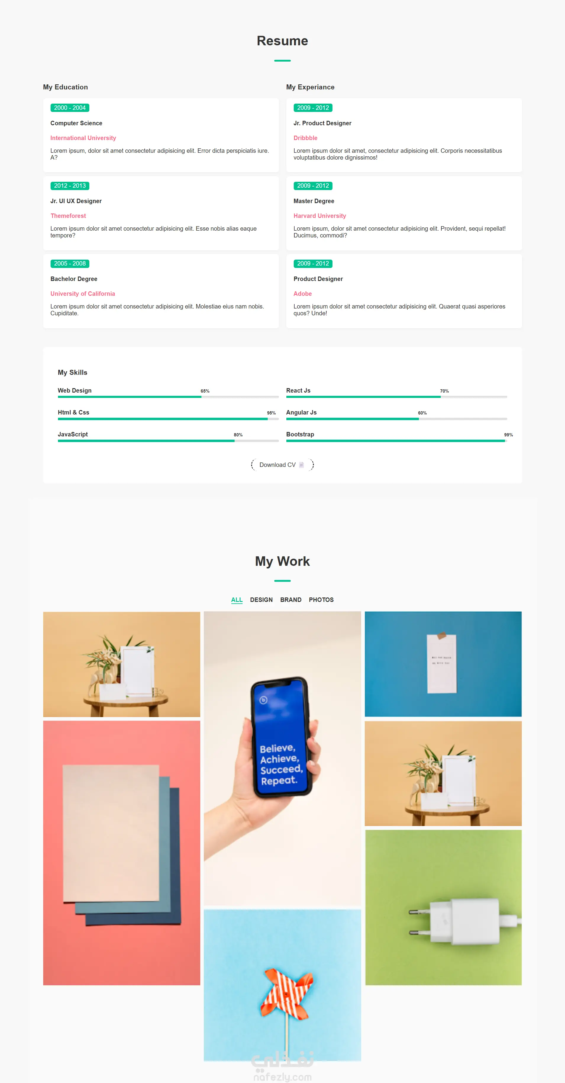 قمت بعمل موقع سيره ذاتيه تجريبى سردت فيه تفاصيل التعليم والخبرات ونسب المعرفه وقمت بعرض الاعمال فى تصميم عصرى وجذاب