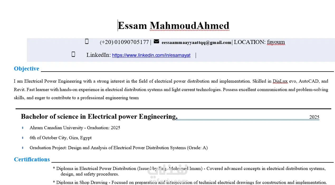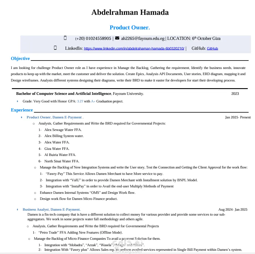 أنا مطورة full stackوخريجة حاسبات ومعلومات، وعندي خبرة في تصميم السير الذاتية الاحترافية المتوافقة مع نظام ATS بحيث تكون مقروءة تمامًا من أنظمة التوظيف وفي نفس الوقت شكلها جذاب ومنظم.