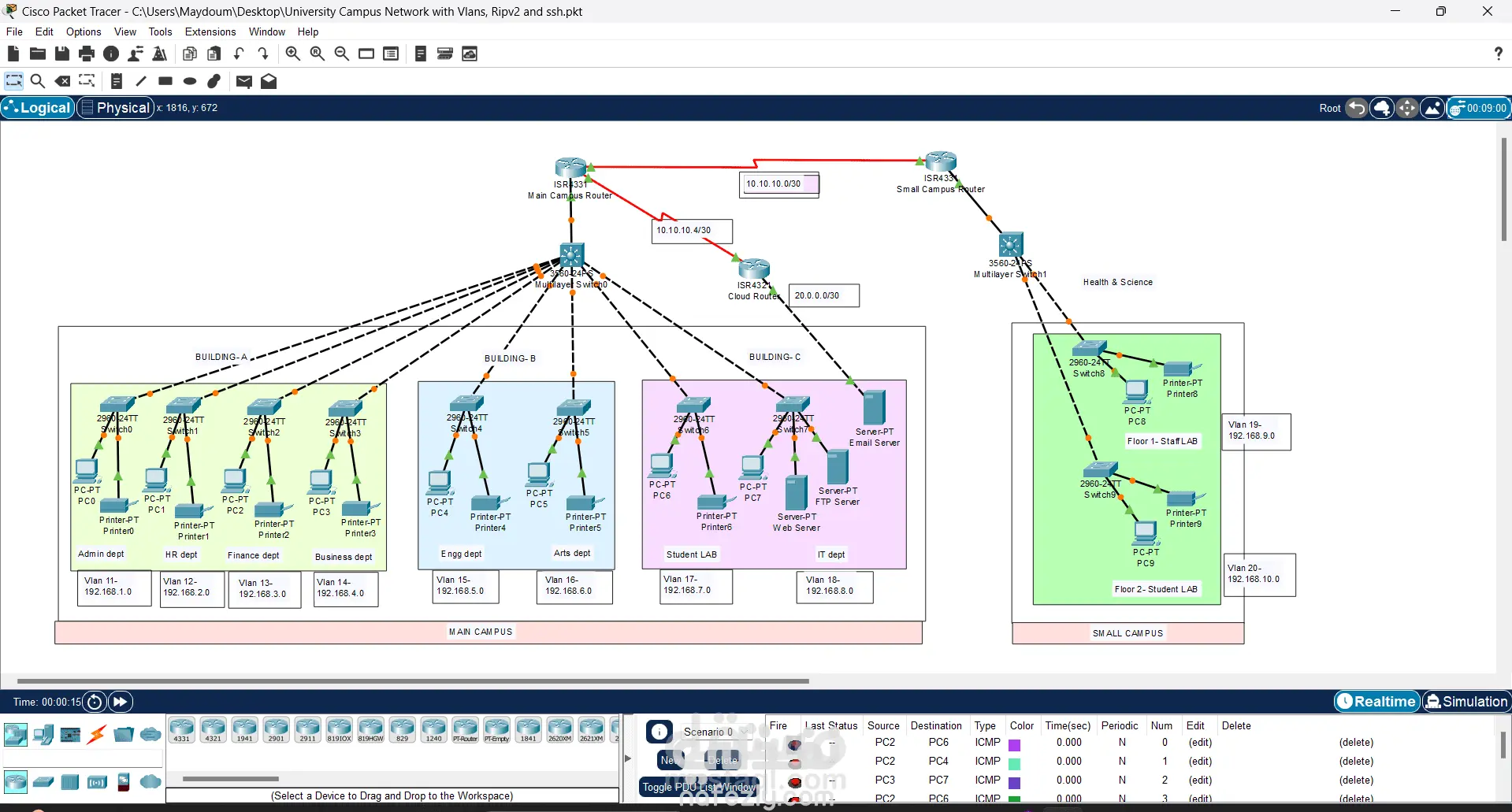 تم تصميم وتنفيذ شبكة لجامعة كاملة باستخدام Cisco Packet Tracer، تشمل المباني الإدارية، الأقسام المختلفة، ومبنى فرعي منفصل.