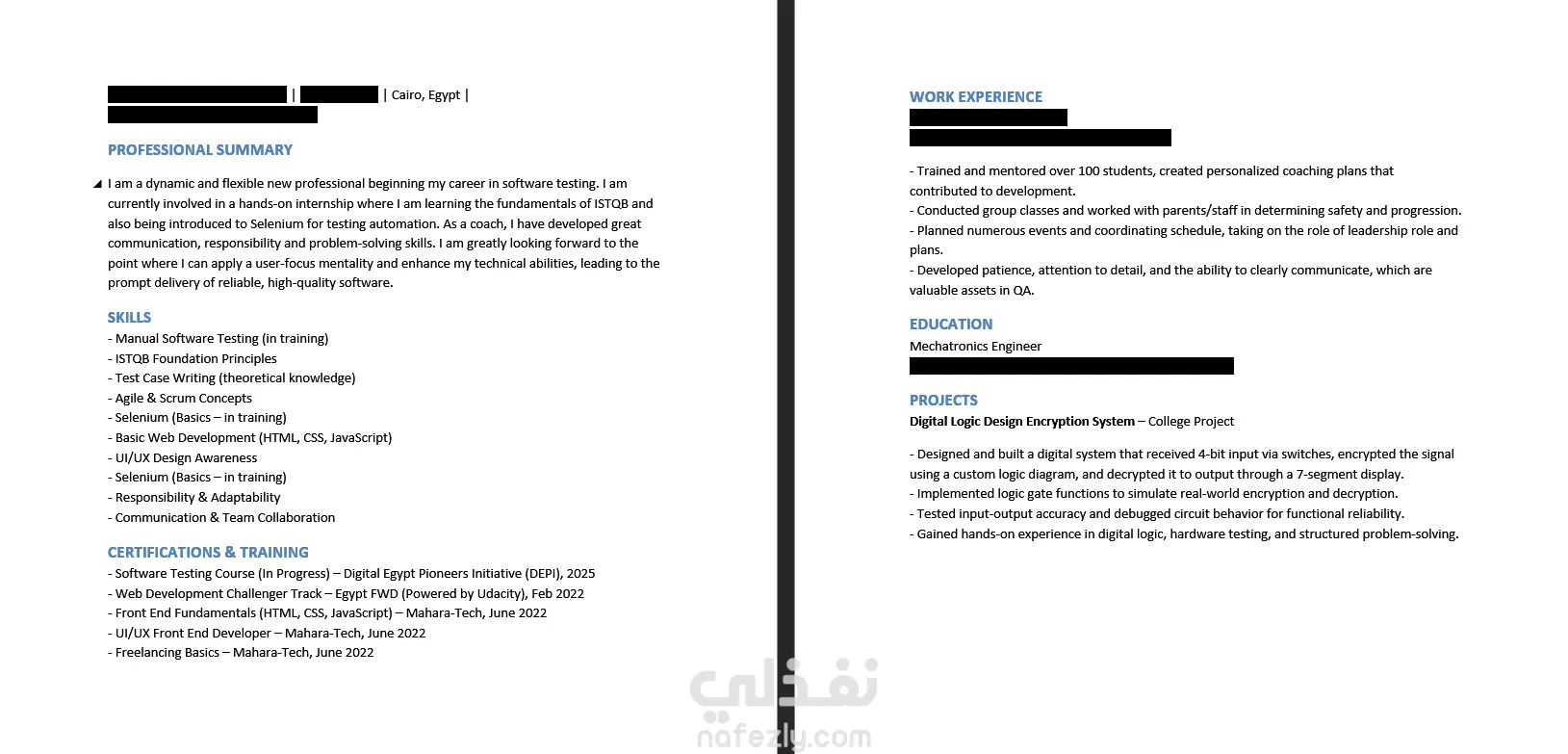 قمت بإنشاء سيرة ذاتية احترافية لمتخصص في اختبار البرمجيات (Software Testing)، مستخدمًا أفضل ممارسات التنسيق والتوافق مع أنظمة تتبع المتقدمين (ATS). حرصتُ على تضمين كلمات مفتاحية خاصة بالمجال، وتنسيق السيرة لتمر بسهولة عبر أنظمة الفحص الرقمي دون فقدان تنسيق أو محتوى هام. المهام التي نفذتها: جمع وتحليل المعلومات المهنية للعميل إعادة كتابة المحتوى بشكل احترافي ومؤثر مطابقة السيرة مع متطلبات وظائف Software Testing اختبار التوافق باستخدام مواقع ATS مثل Jobscan تسليم الملف بصيغتي Word وPDF النتيجة: حصل العميل على سيرة ذاتية قوية زادت فرص ظهوره في نتائج فرز التوظيف، وتم قبولها لاحقًا في أكثر من شركة.