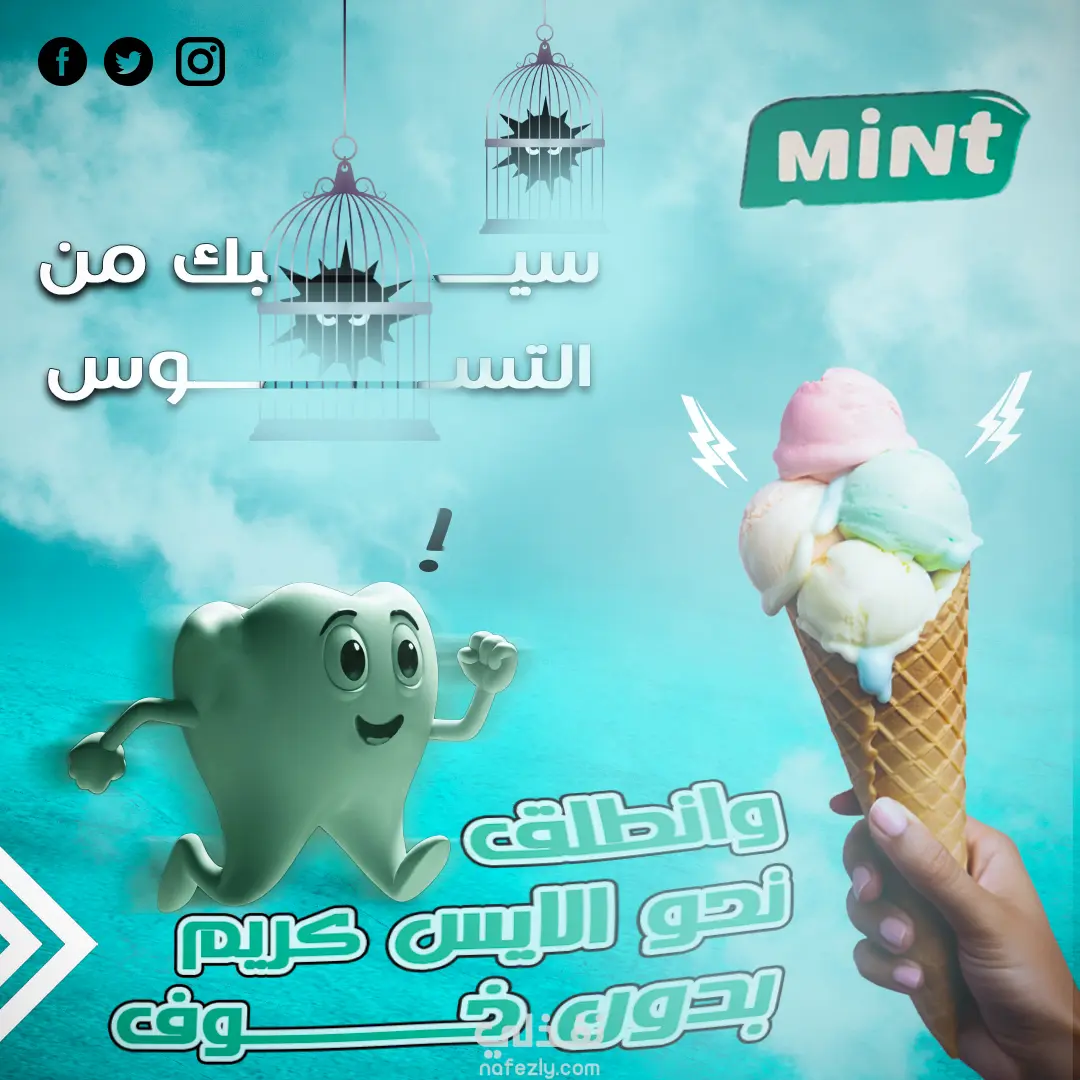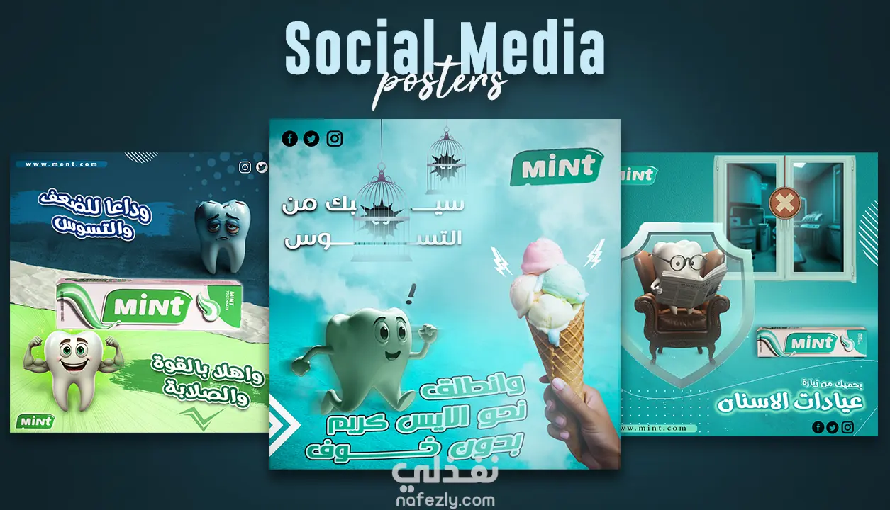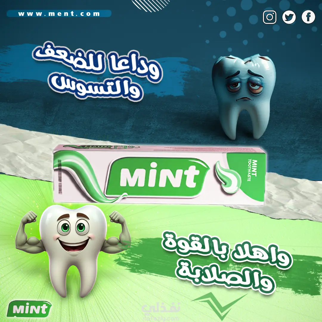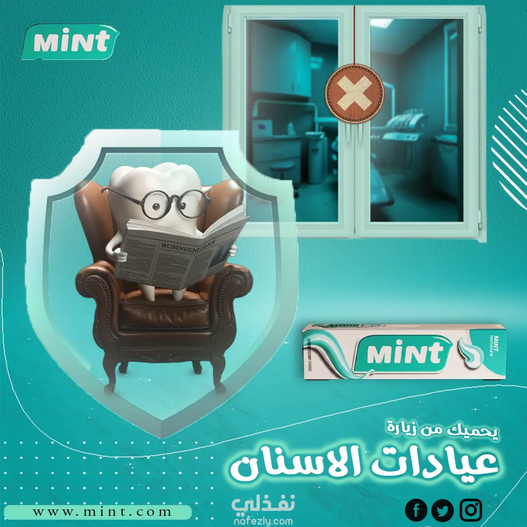 تصميمات سوشيال ميديا احترافية لشركة تصنيع معجون اسنان, الهدف من هذه التصميمات هو الترويج لمنتجات "MINT" للعناية بالأسنان كوسيلة للحفاظ على صحة الأسنان وتجنب مشاكل التسوس وزيارات طبيب الأسنان، وذلك بأسلوب مرح وتفاعلي.