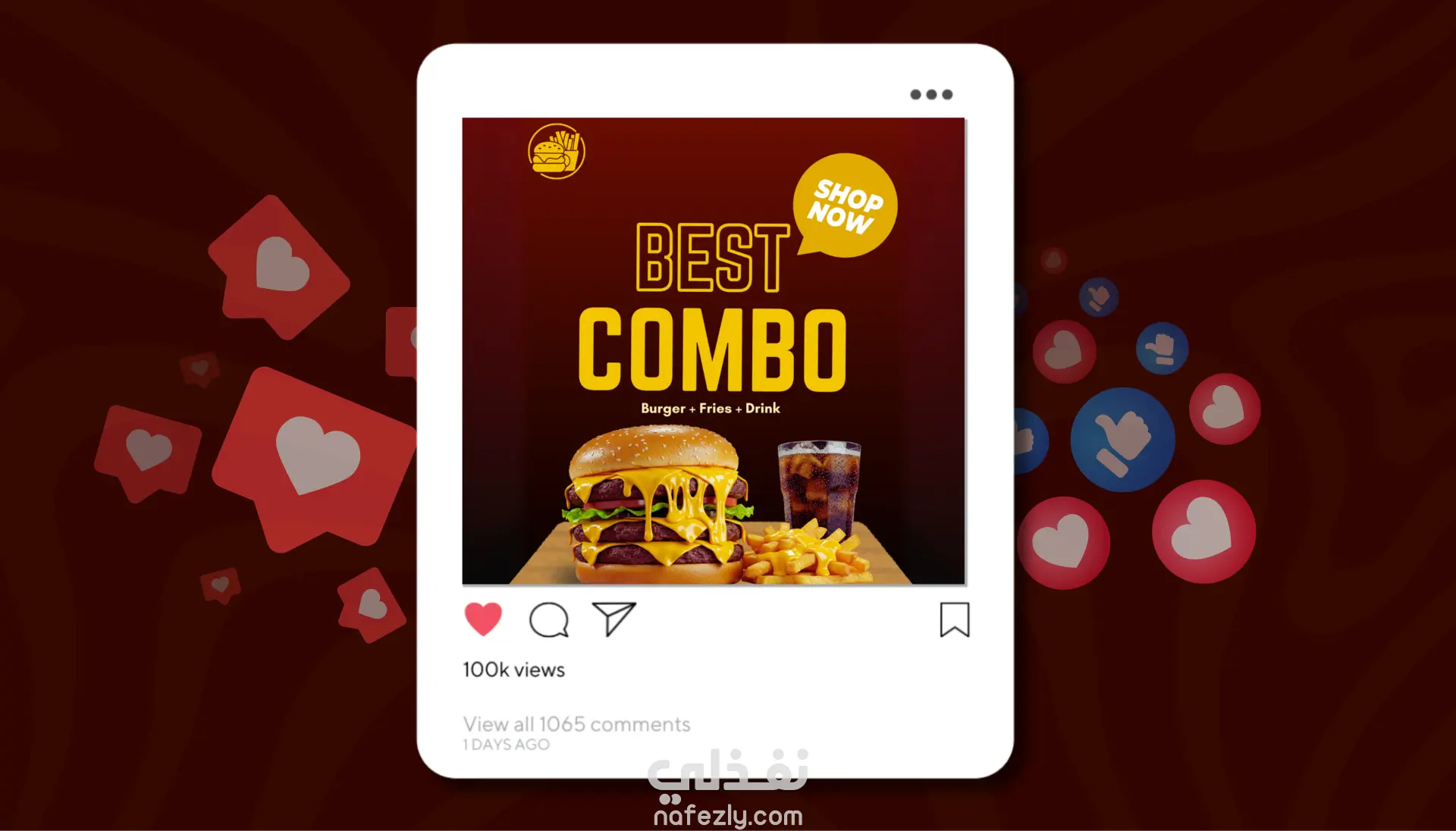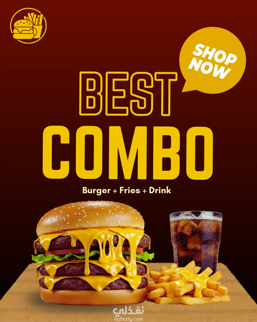 في التصميم ده ركزت على إبراز الوجبة بطريقة تفتح الشهية من أول نظرة استخدمت خلفية بتدرج من الأحمر الغامق للفاتح عشان تعكس دفء الأكل وإحساس الجوع اللذيذ وهي ألوان دايمًا مرتبطة بالمطاعم والوجبات السريعة خليت البرجر هو العنصر الأساسي في المنتصف بتفاصيل واضحة وجبنة سايحة عشان تدي إحساس بالطراوة واللذة ومعاه البطاطس والمشروب كعناصر مكملة تعزز فكرة الكومبو الكامل كتبت كلمة “BEST COMBO” بخط قوي وجريء بالأصفر عشان تكون هي محور التصميم وتجذب العين فورًا، وضفت عنصر الكلام “SHOP NOW” باللون الذهبي في الأعلى لتشجيع المشاهد على الشراء بشكل مباشر الستايل العام للتصميم ممتع وشبابي ومثالي لإعلانات السوشيال ميديا الخاصة بالمطاعم أو العروض المميزة