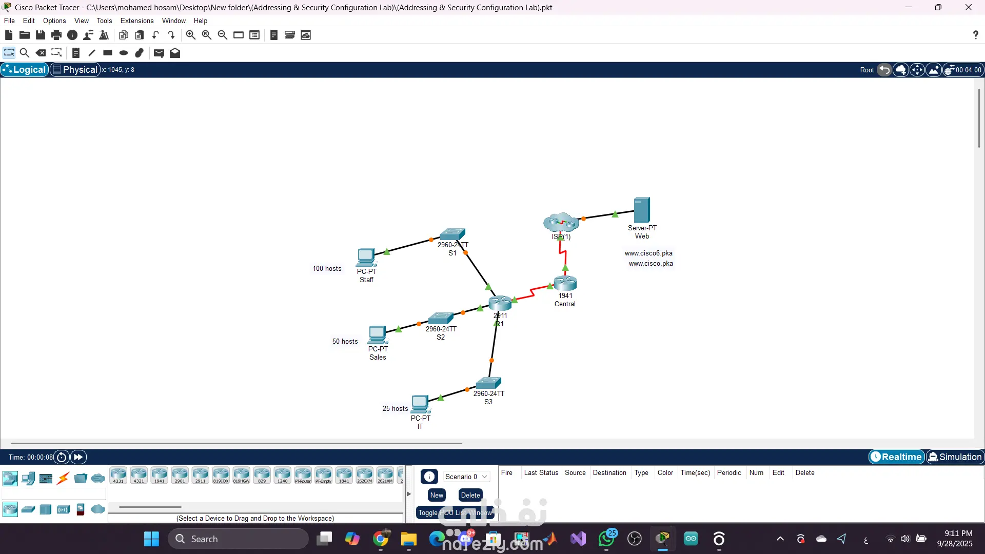 عنونة IPv4/IPv6 وإعدادات الأمان (Addressing & Security Configuration Lab) الخلفية هدف المشروع هو تصميم مخطط IPv4 addressing جديد باستخدام الشبكة 192.168.0.0/24 لتقسيمها إلى 4 شبكات فرعية (Staff – Sales – IT – Guest). بعد ذلك تم تكوين عناوين IPv6، وضبط الراوتر R1 بالإعدادات الأساسية وإعدادات الأمان، بالإضافة إلى تهيئة واجهات الإدارة (SVI) على السويتشات S1, S2, S3. كما تضمن المشروع تفعيل الدخول عبر SSH، تطبيق سياسات كلمات المرور، وإنشاء رسالة تحذيرية (Banner)، وتأمين منافذ الـ Console و VTY. ️ الأدوات المستخدمة برنامج Cisco Packet Tracer راوتر سيسكو (R1) سويتشات سيسكو (S1, S2, S3) أجهزة حاسب (Staff – Sales – IT) خادم ويب (www.cisco.pka / www.cisco6.pka ) ️ خطوات التنفيذ 1. تقسيم الشبكة IPv4 Subnetting (192.168.0.0/24): Staff: 192.168.0.0/25 → 100 جهاز Sales: 192.168.0.128/26 → 50 جهاز IT: 192.168.0.192/27 → 25 جهاز Guest (مستقبلي): 192.168.0.224/27 → 25 جهاز 2. تكوين IPv6 Addressing: VLAN10 (Staff): 2001:db8:acad:10::/64 VLAN20 (Sales): 2001:db8:acad:20::/64 VLAN30 (IT): 2001:db8:acad:30::/64 VLAN40 (Guest): 2001:db8:acad:40::/64 3. إعداد أجهزة الحاسب (PCs): تكوين عناوين IPv4 و IPv6، الـ Subnet Mask، والـ Default Gateway لكل شبكة (Staff, Sales, IT). استخدام link-local fe80::1 كبوابة افتراضية لـ IPv6. 4. إعدادات الراوتر (R1): تغيير اسم الجهاز (hostname) وإلغاء DNS lookup. تفعيل سياسات كلمات المرور (حد أدنى 10 حروف) وتشفيرها. تعيين كلمات مرور مشفرة لـ EXEC والـ Console. إنشاء Banner تحذيري ضد الدخول غير المصرح. تهيئة الـ Sub-Interfaces لكل VLAN مع عناوين IPv4/IPv6. تفعيل SSH (domain name، مفاتيح RSA 1024-bit، مستخدم Admin1 بمستوى 15). إعداد خاصية حظر الدخول (login block) بعد 4 محاولات فاشلة. 5. إعدادات السويتشات (S1, S2, S3): ضبط أسماء الأجهزة (hostname). تكوين واجهة الإدارة (SVI) بعنوان IPv4/IPv6 لكل VLAN. إضافة Default Gateway لكل سويتش. تعطيل DNS lookup. تشفير جميع كلمات المرور. تفعيل مهلة تسجيل الخروج (exec-timeout) على الـ Console و VTY. النتائج تمكّن مستخدمو Staff, Sales, IT PCs من الوصول إلى مواقع الاختبار www.cisco.pka و www.cisco6.pka . تم تحقيق الاتصال بين جميع الأجهزة عبر IPv4 و IPv6 مع دعم Inter-VLAN Routing من خلال R1. تأمين الراوتر والسويتشات عبر كلمات مرور مشفرة، وصول آمن بـ SSH، وتطبيق سياسات أمان. نجاح اختبار Ping بين جميع الأجهزة (PCs – Switches – Router – Server) بما يضمن الاتصال الكامل. الشبكة أصبحت قابلة للتوسّع مستقبلًا مع حجز شبكة خاصة بالضيوف (Guest).