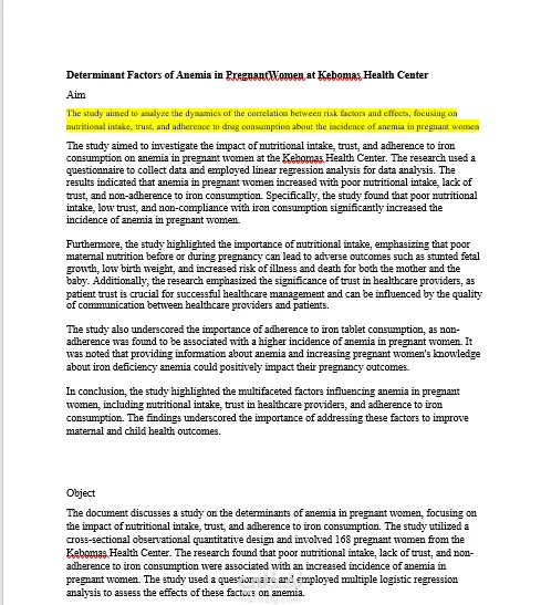 دراسة بحثية باللغة الإنجليزية تبحث في العوامل المحددة لفقر الدم لدى النساء الحوامل في مركز Kebomas الصحي. تتناول العلاقة بين التغذية، والثقة بمقدمي الرعاية الصحية، والالتزام بتناول أقراص الحديد وتأثيرها على الإصابة بفقر الدم أثناء الحمل.