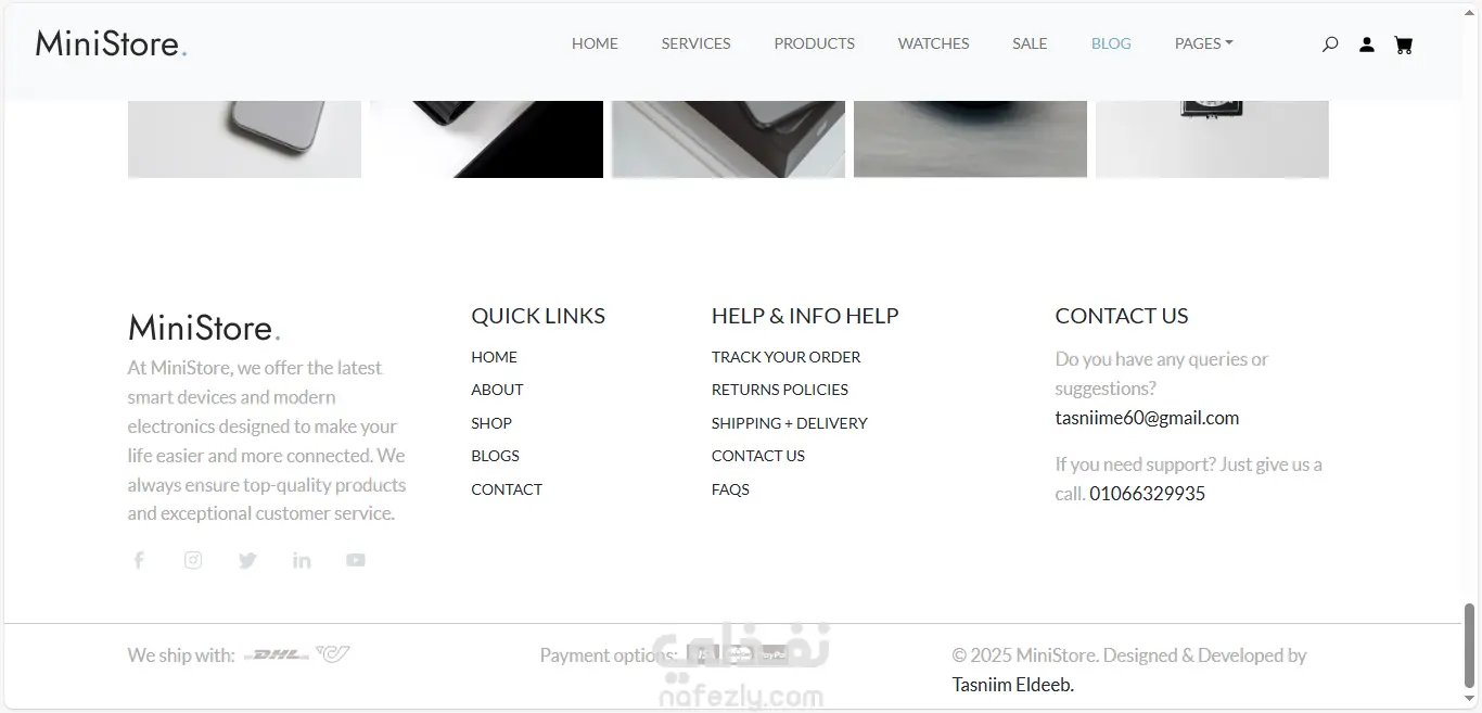 تم إنشاء هذا الموقع الإلكتروني ليكون متجرًا متكاملًا لبيع الأجهزة الذكية والإلكترونيات الحديثة. يتميز الموقع بواجهة مستخدم أنيقة وسهلة الاستخدام، وتصميم متجاوب يعمل على جميع الأجهزة سواء كمبيوتر أو هاتف محمول أو تابلت. - مميزات الموقع: تصميم احترافي بسيط ومرتب يعرض المنتجات بوضوح. سلايدر ديناميكي في الصفحة الرئيسية لعرض المنتجات المميزة. أقسام متعددة لعرض أنواع الأجهزة الذكية (هواتف، سماعات، ساعات ذكية...). سلة مشتريات ونظام تصفح سهل للمستخدم. فوتر احترافي يحتوي على وسائل التواصل والدعم الفني. إمكانية تعديل المحتوى بسهولة مستقبلًا. - الأدوات والتقنيات المستخدمة: HTML5, CSS3, JavaScript Bootstrap (لتصميم الواجهة المتجاوبة) Swiper.js (لعرض السلايدر في الصفحة الرئيسية) Font Awesome (للأيقونات) Photoshop (لتعديل وتحسين الصور)