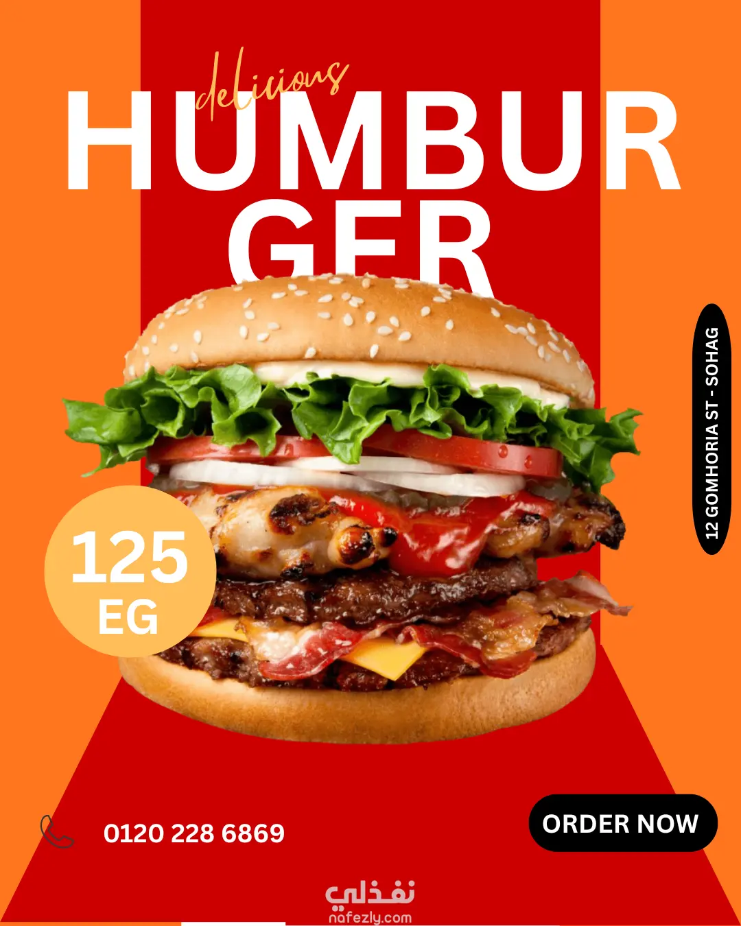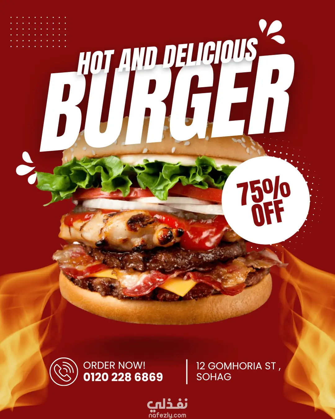 تم الاعتماد على ألوان دافئة تعكس حرارة الشواء وتثير شهية المشاهد، مع إبراز البرجر بشكل بارز في المنتصف لخلق هوية بصرية قوية للمطعم.