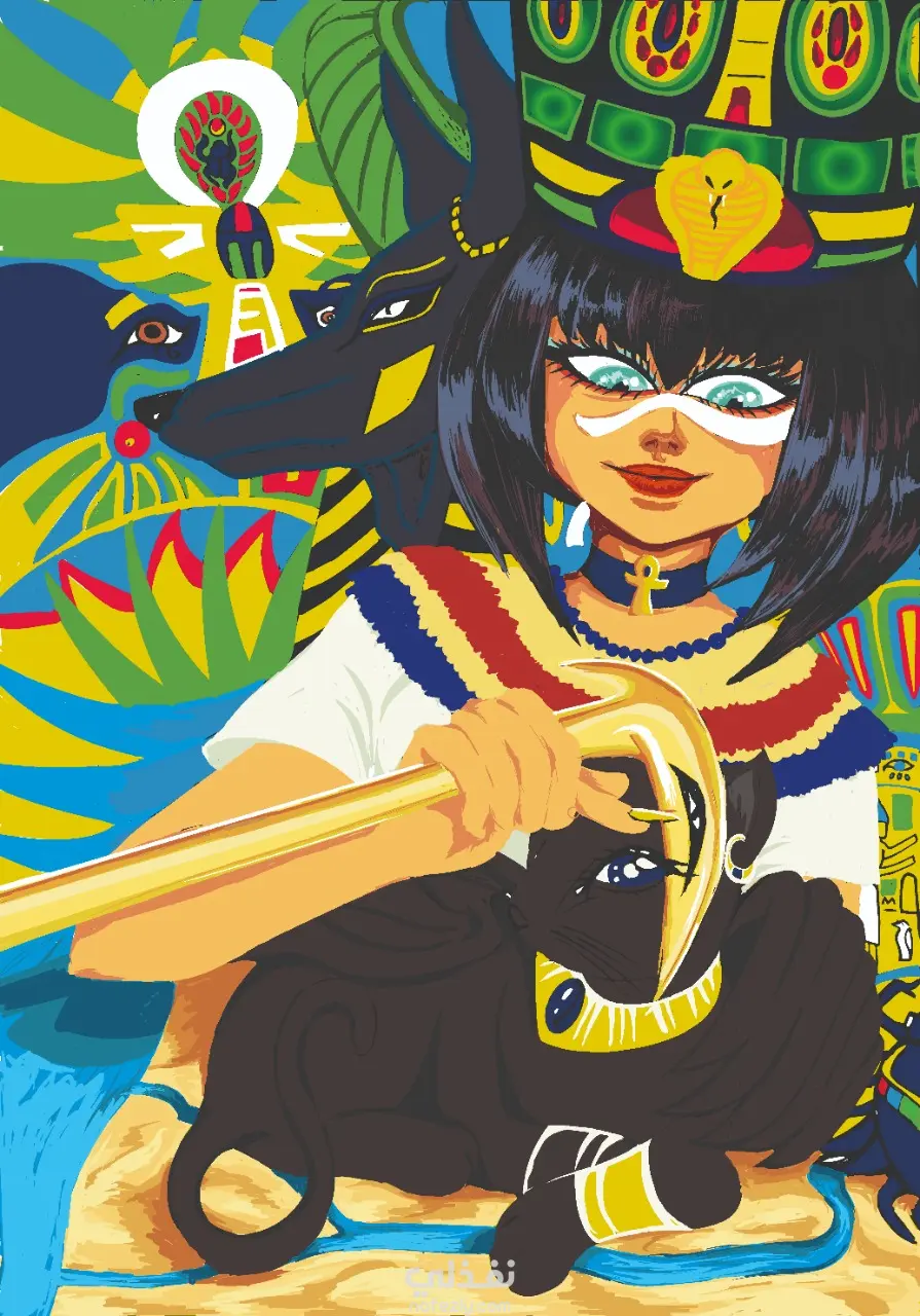 عملتلها تصميم إليستريشن غني بالتفاصيل، ركزت فيه على التاج والزينة الملكية، وأضفت عناصر رمزية زي القط المقدس وأنوبيس وقرص الشمس، مع باليتة لونية مبهجة وتباين قوي يدي إحساس بالقوة والرهبة.