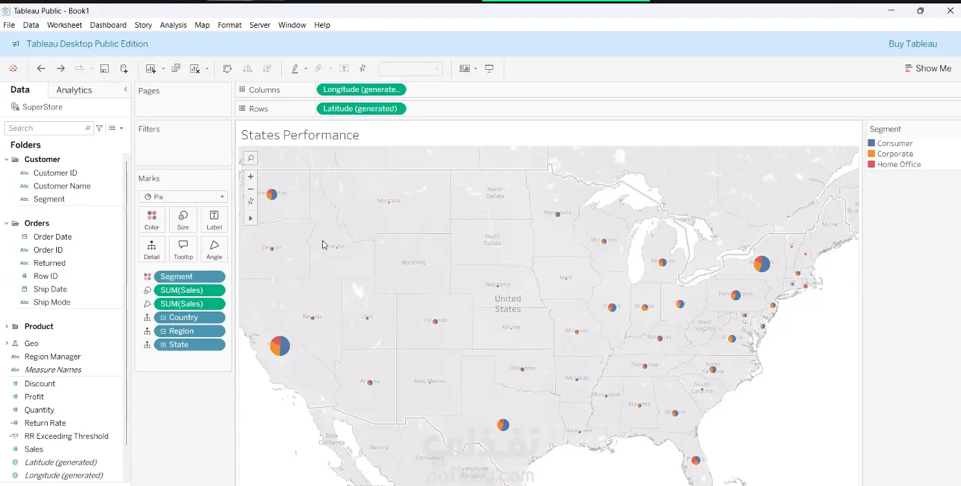 خريطة لUS مع تظليل لمناطق المبيعات.