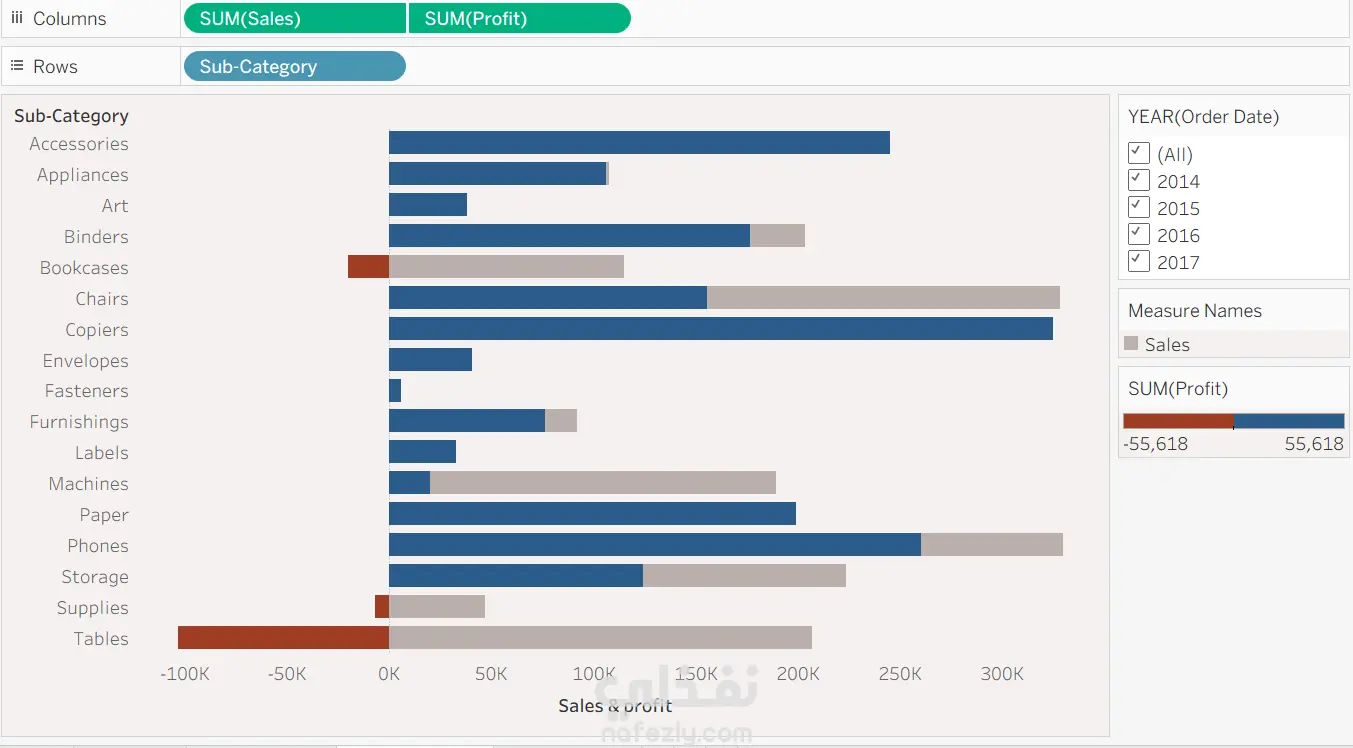 لكل فئة شريط أفقي يوضح المبيعات والأرباح: