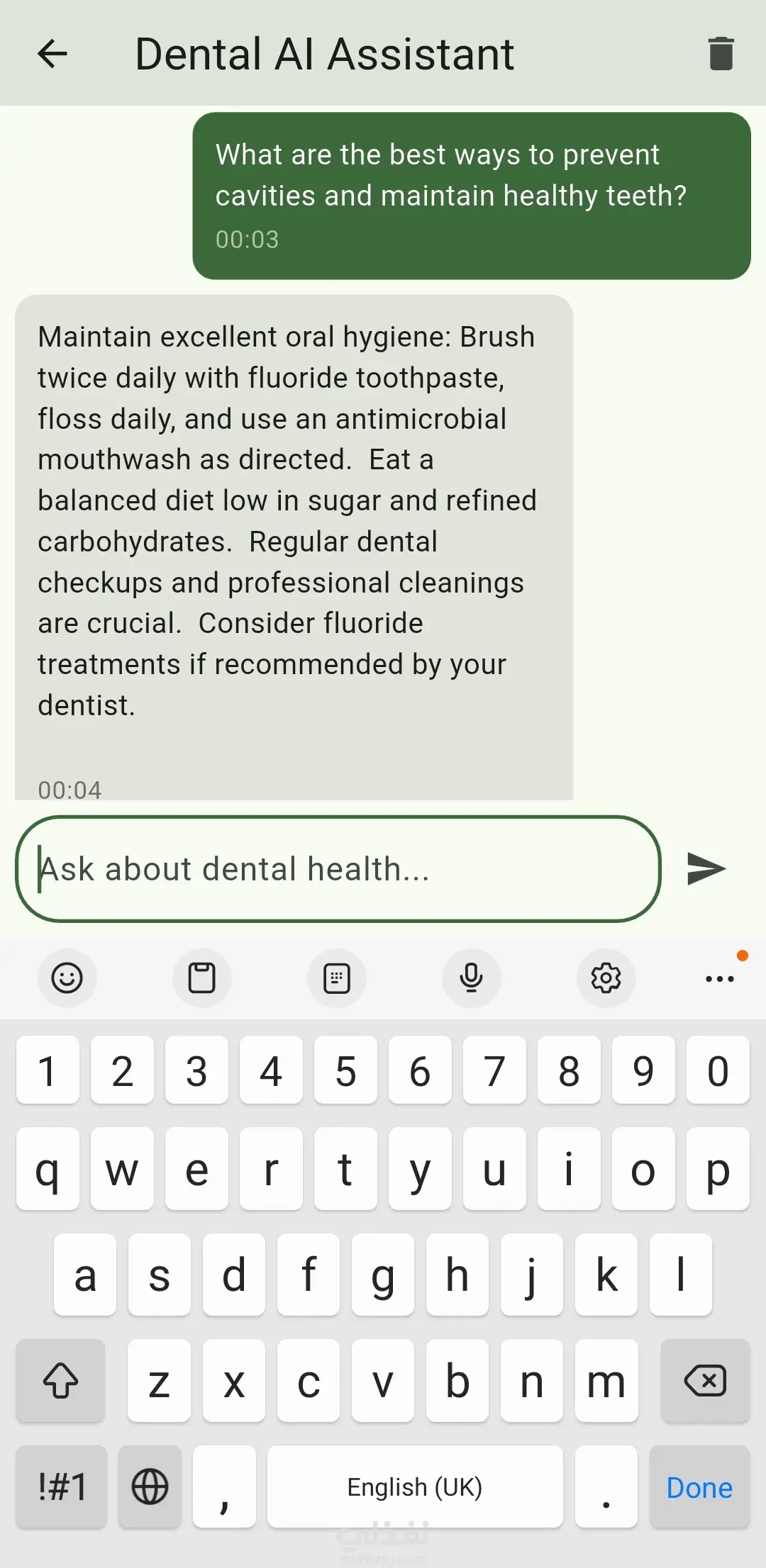 دوري: مطوّر Flutter (تصميم الواجهة + البرمجة + التكامل مع Firebase) الوصف: تطبيق متعدد المنصات يساعد المستخدمين على تتبع عادات التغذية والعناية بصحة الأسنان. صممت وطوّرت واجهة المستخدم بالكامل باستخدام Flutter، وأعددت الـ Backend باستخدام Firebase (Firestore وAuthentication وMessaging). التطبيق يرسل إشعارات تلقائية كل ساعتين في حال لم يقم المستخدم بتسجيل أي مهام صحية، ويحتوي على مساعد ذكي (AI Assistant) للإجابة على استفسارات المستخدم وتقديم مقالات وفيديوهات مفيدة. المهارات: Flutter & Dart، Firebase Firestore، Firebase Authentication، Firebase Messaging، تصميم واجهة المستخدم، إدارة الحالة باستخدام Provider، App Routes