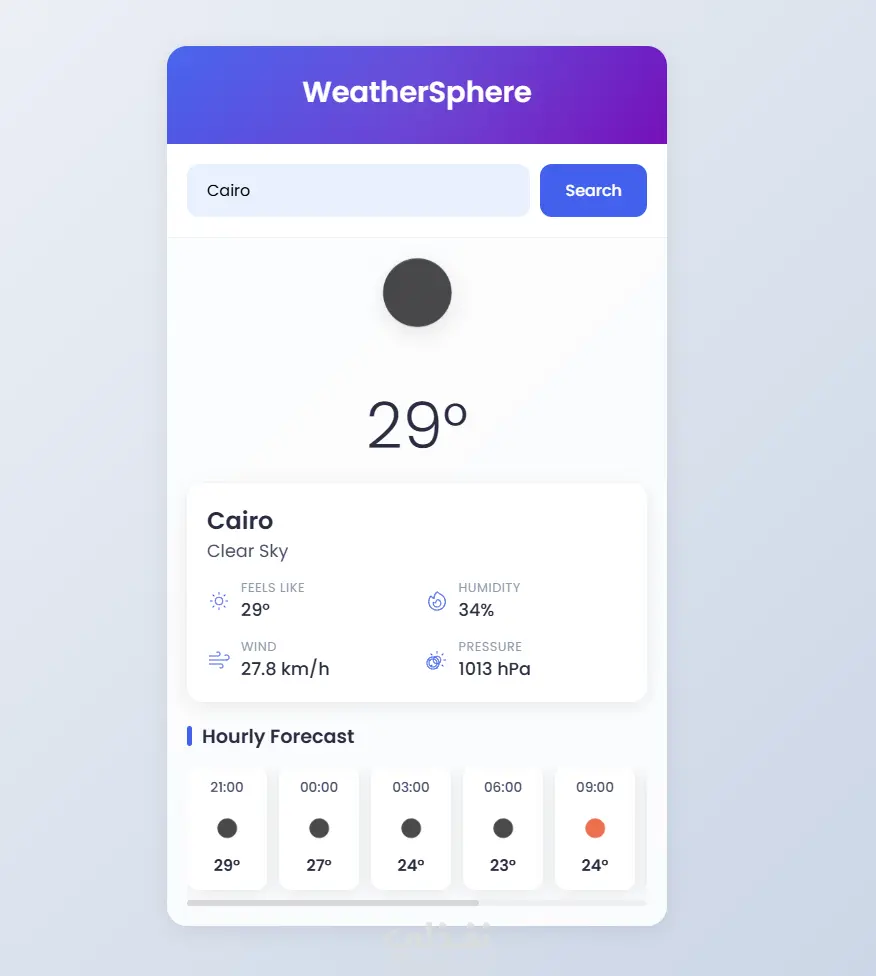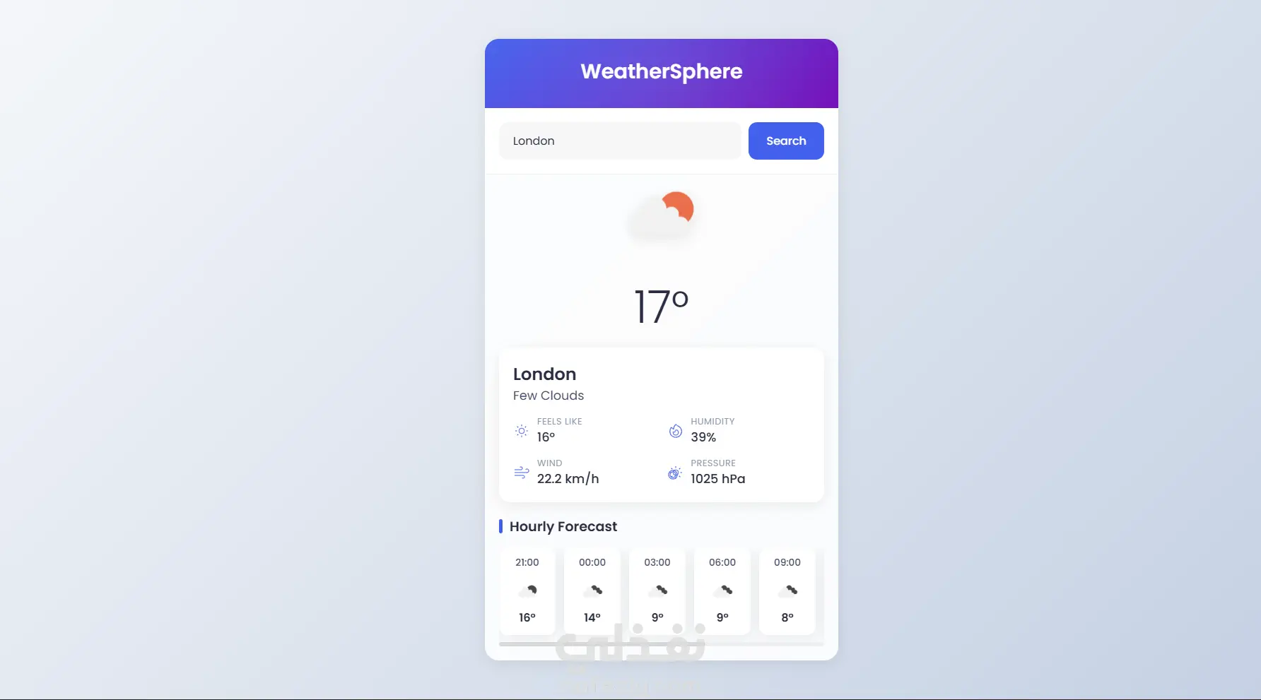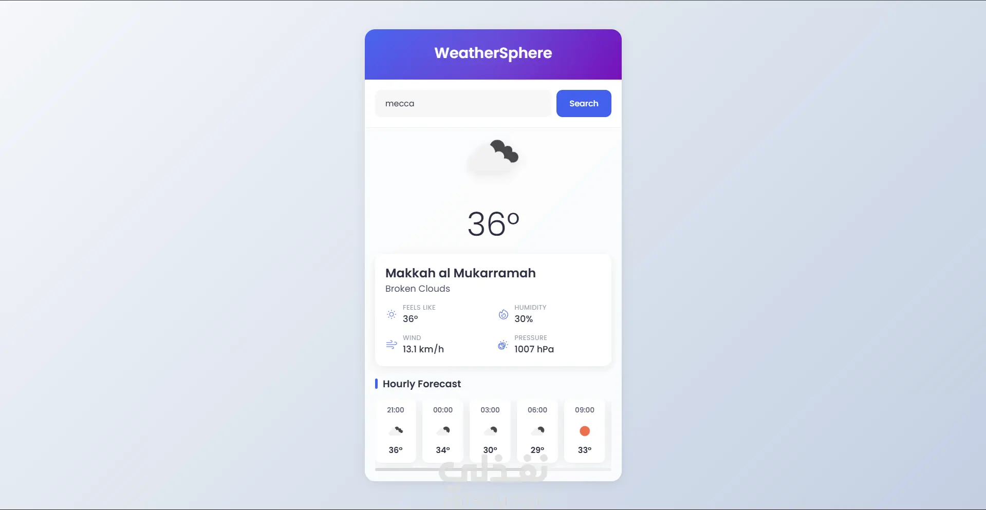 WeatherSphere هو تطبيق ويب تفاعلي لعرض حالة الطقس في الوقت الفعلي، مطور باستخدام HTML, CSS, JavaScript مع الاعتماد على OpenWeather API. يوفر للمستخدم إمكانية البحث عن الطقس في أي مدينة حول العالم، مع عرض: درجة الحرارة الحالية والشعور الفعلي. حالة الطقس (وصف وصورة أيقونية). تفاصيل إضافية مثل الرطوبة، سرعة الرياح، والضغط الجوي. توقعات الساعات القادمة في واجهة مرتبة وسهلة التصفح. التطبيق يتميز بتصميم عصري ومتجاوب يعمل على جميع الأجهزة (كمبيوتر، موبايل، تابلت)، مع مؤثرات بصرية وحركات سلسة تعزز تجربة المستخدم.