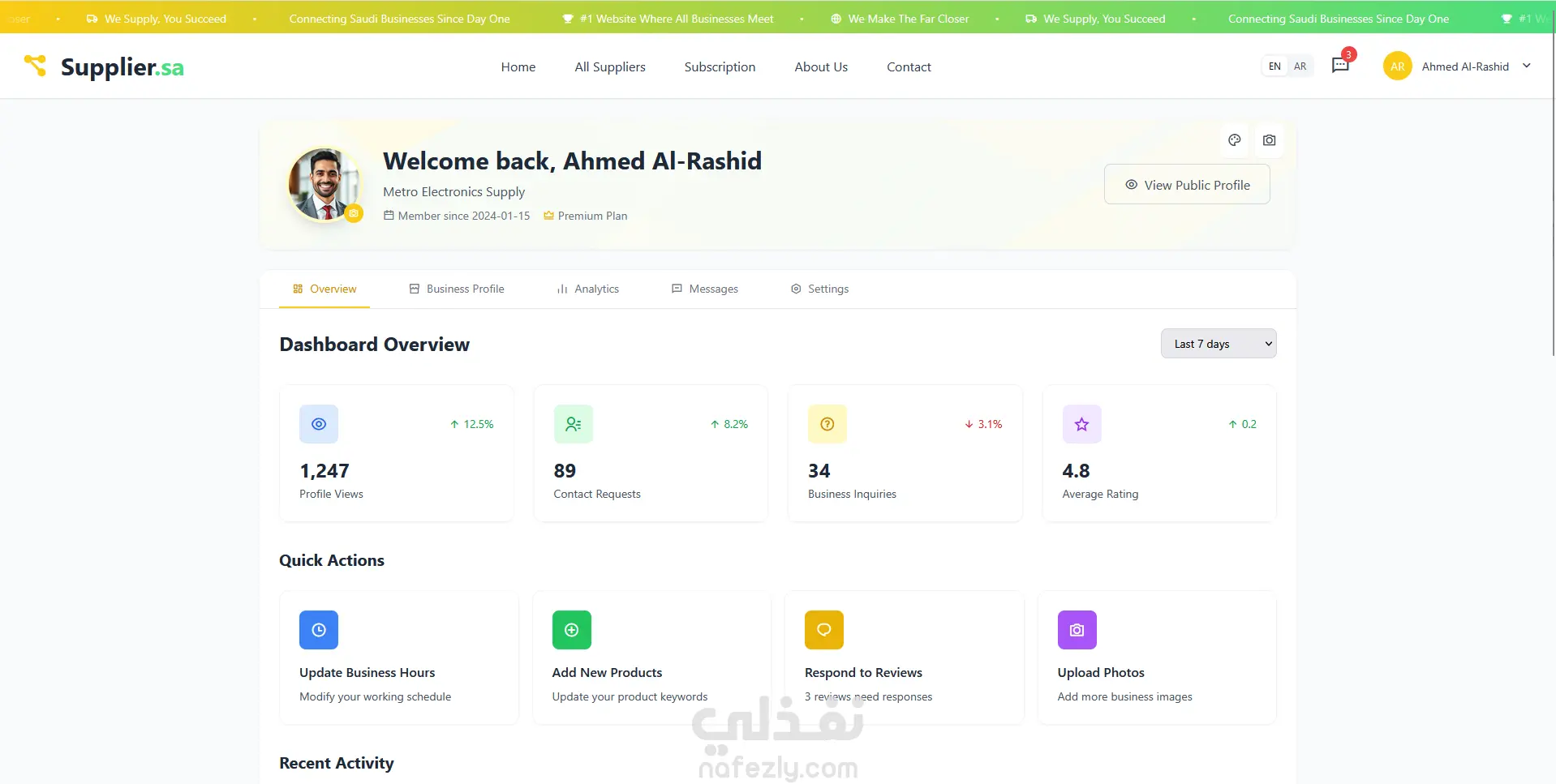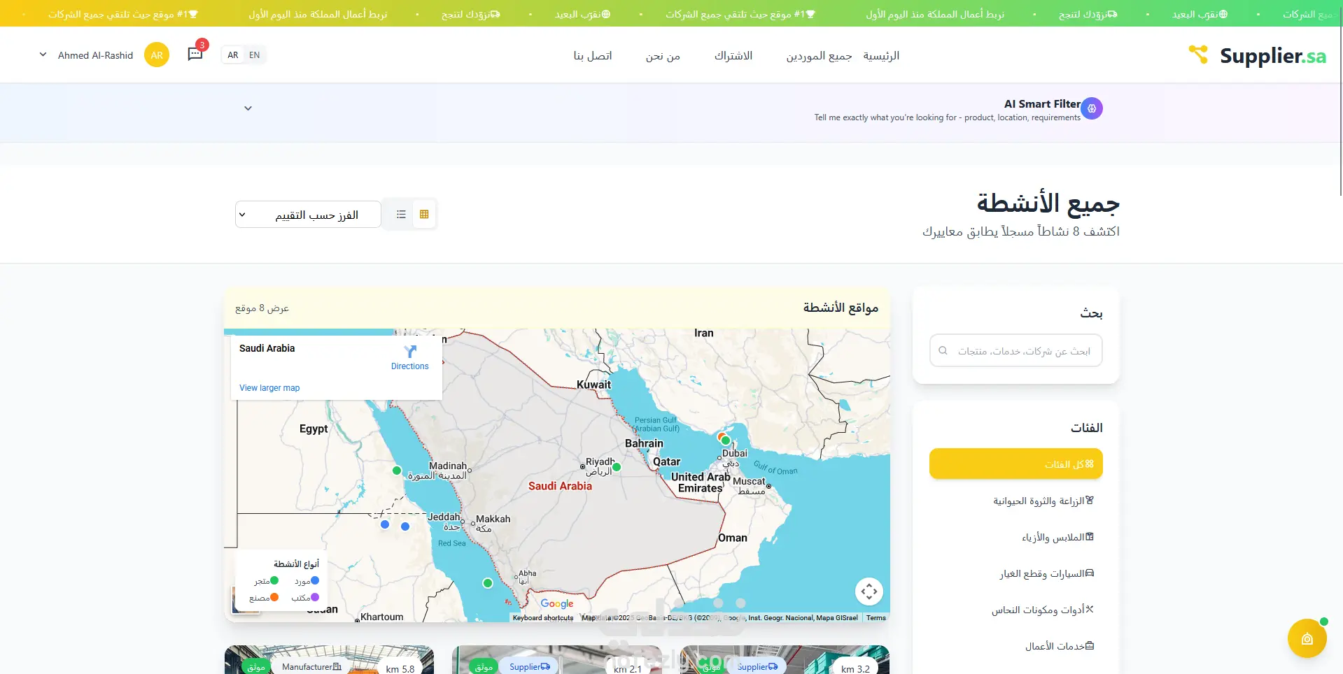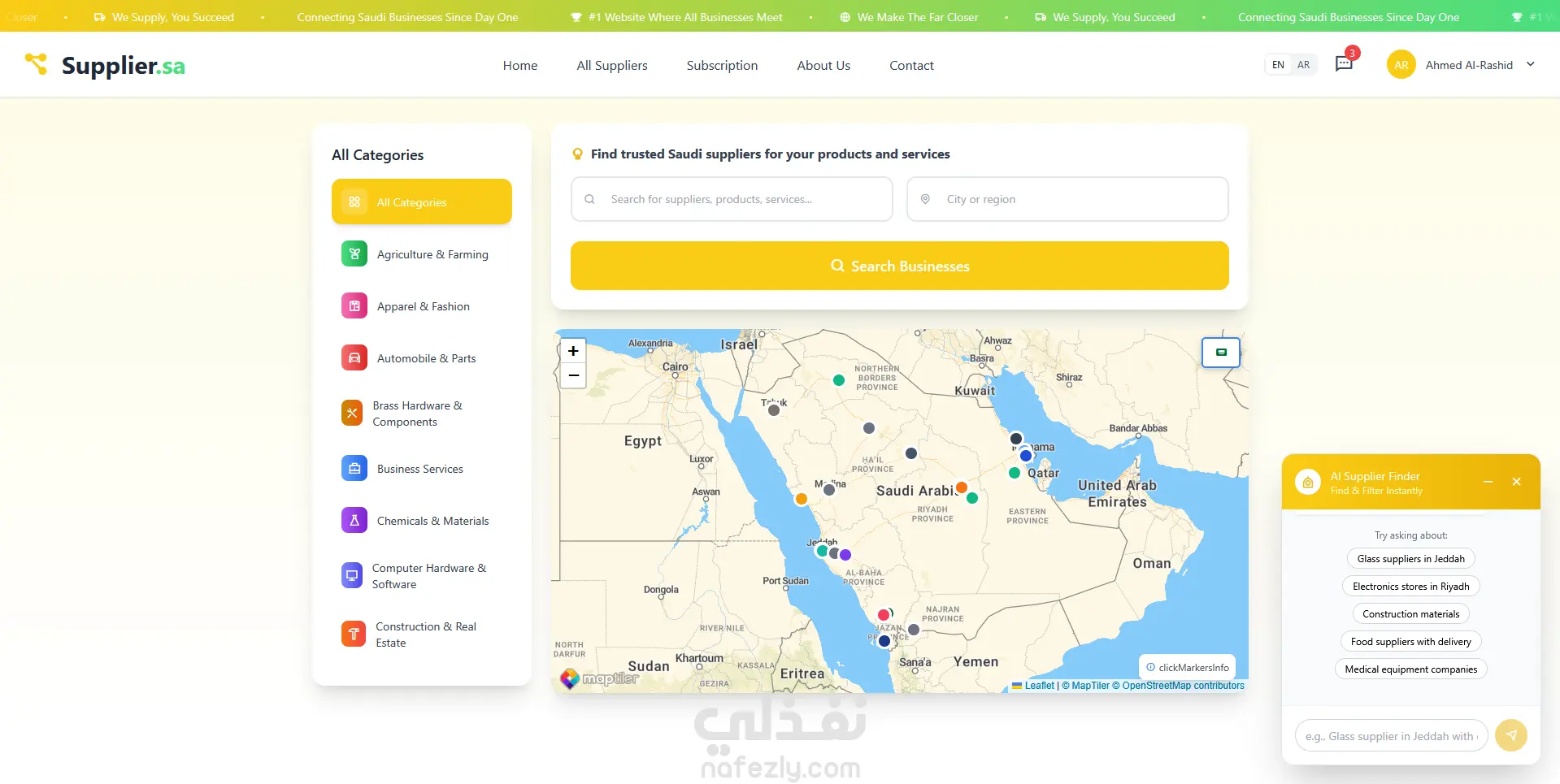 تطوير واجهة منصة Supplier.sa لربط الشركات السعودية بالموردين، باستخدام Next.js 14 وReact 18 وTypeScript. يشمل المشروع صفحات الموردين، البحث والفلاتر، الاشتراكات المدفوعة، الدفع الإلكتروني عبر ClickPay، ودعم لغتين مع RTL. واجهة متجاوبة وسريعة مع خرائط تفاعلية ودمج AI Chatbot.