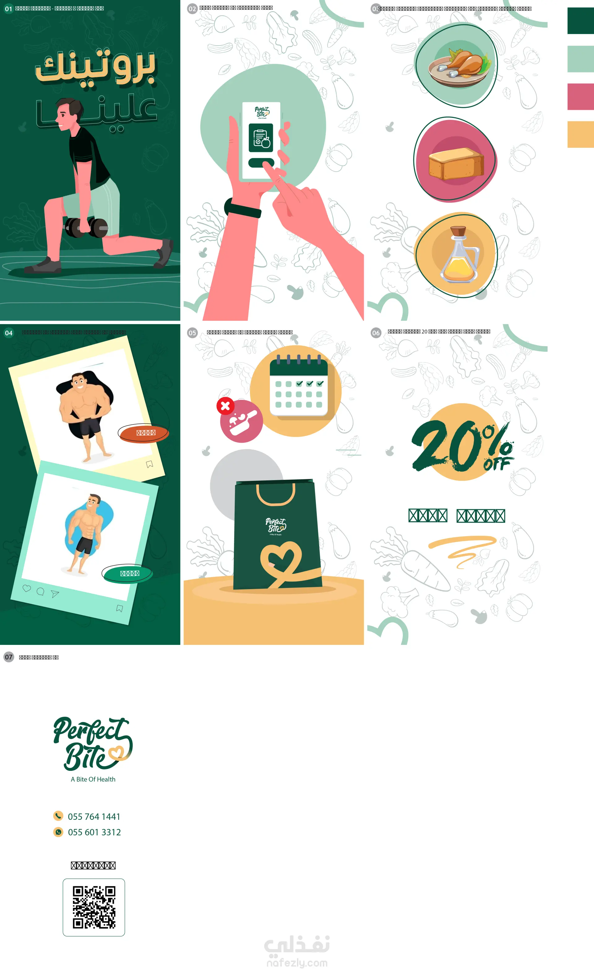 اعتمدت في التصميم على ألوان مريحة تعبّر عن النمط الصحي، مع تحريك سلس للعناصر يبرز مكونات الطعام الطازجة وطريقة التوصيل السريعة.