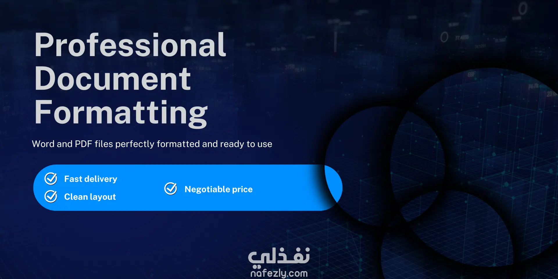 أقوم بتنسيق ملفاتك النصية (Word أو PDF) بطريقة مرتبة وواضحة وأيضا التصميم. أضبط العناوين، الفقرات، الجداول، وترقيم الصفحات، مع مراعاة المظهر العام ليبدو الملف جاهزًا للطباعة أو النشر. يمكني أيضًا تحويل الملفات من Word إلى PDF أو العكس بدون فقدان التنسيق. مدة التنفيذ خلال يوم واحد فقط. السعر الكلي قابل للتفاوض حسب حجم الملف وعدد الصفحات. السعر المبدئي: 5 دولار لكل ملف بسيط