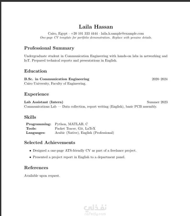 سيرة ذاتية أسلوب أكاديمي مناسبة للتقديم على تدريبات أو منح أو برامج بحثية. تشمل أقسام للأبحاث، المشروعات، المراجع، والمهارات التقنية. مُصممة بصيغة PDF وLaTeX. SAMPLE — للمعرض فقط. نقاط مميزة: تناسب التقديمات الأكاديمية والمنح. ترتيب احترافي للأوراق البحثية والمشروعات. مُعدّة بصيغة LaTeX لنتائج طباعة دقيقة. وسوم: سيرة أكاديمية، CV بحثي، thesis, LaTeX, research. سعر مقترح: 200–350 جنيه مصري. زمن تسليم مقترح: 2–3 أيام.